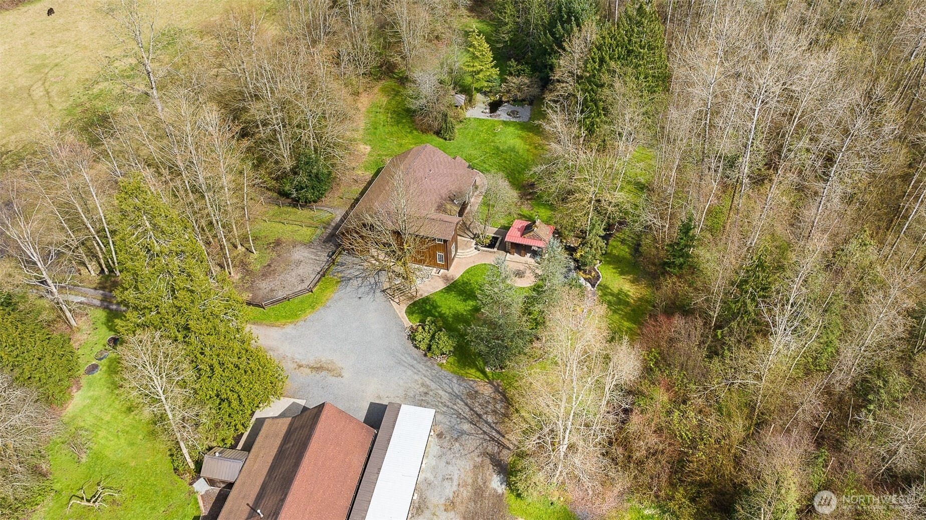 LUXURY BARN LIVING! Discover this exceptional 21 acre self-sustained homestead, offering a perfect blend of natural beauty. The spacious property features lush fields, and a majestic expansive mixed forest. Highlights include a reclaimed timber frame barndominium planned for expansion, complete with a 4-bedroom septic system. The versatile buildings and amenities include: A spacious shop it's own 200 amp service, an upper-level area, a dedicated freeze-dryer/canning room, a mechanic workroom, a four-bay carport, a garden shed for tools and supplies, a pole barn suitable for RV or trailer storage, a tractor and woodshed area, an adorable timber-frame outdoor entertainment structure, a covered hot tub area overlooking a peaceful small pond. The charming, isolated home features a master bedroom with French doors opening onto a covered porch, perfect for relaxing and enjoying the natural surroundings. Locally reclaimed fir floors add an organic rustic touch. Set within a private yet close-in location, this retreat offers excellent connectivity to I-5 for convenient travel. Expansive railed pastures provide ample space for horses, livestock, or other outdoor pursuits. The entire property is flat, with plenty of room to build your dream home, horse arena, or additional structures. This property combines the tranquility of nature with practicality of a well-equipped homestead - an ideal place for sustainable living, recreation and future expansion.