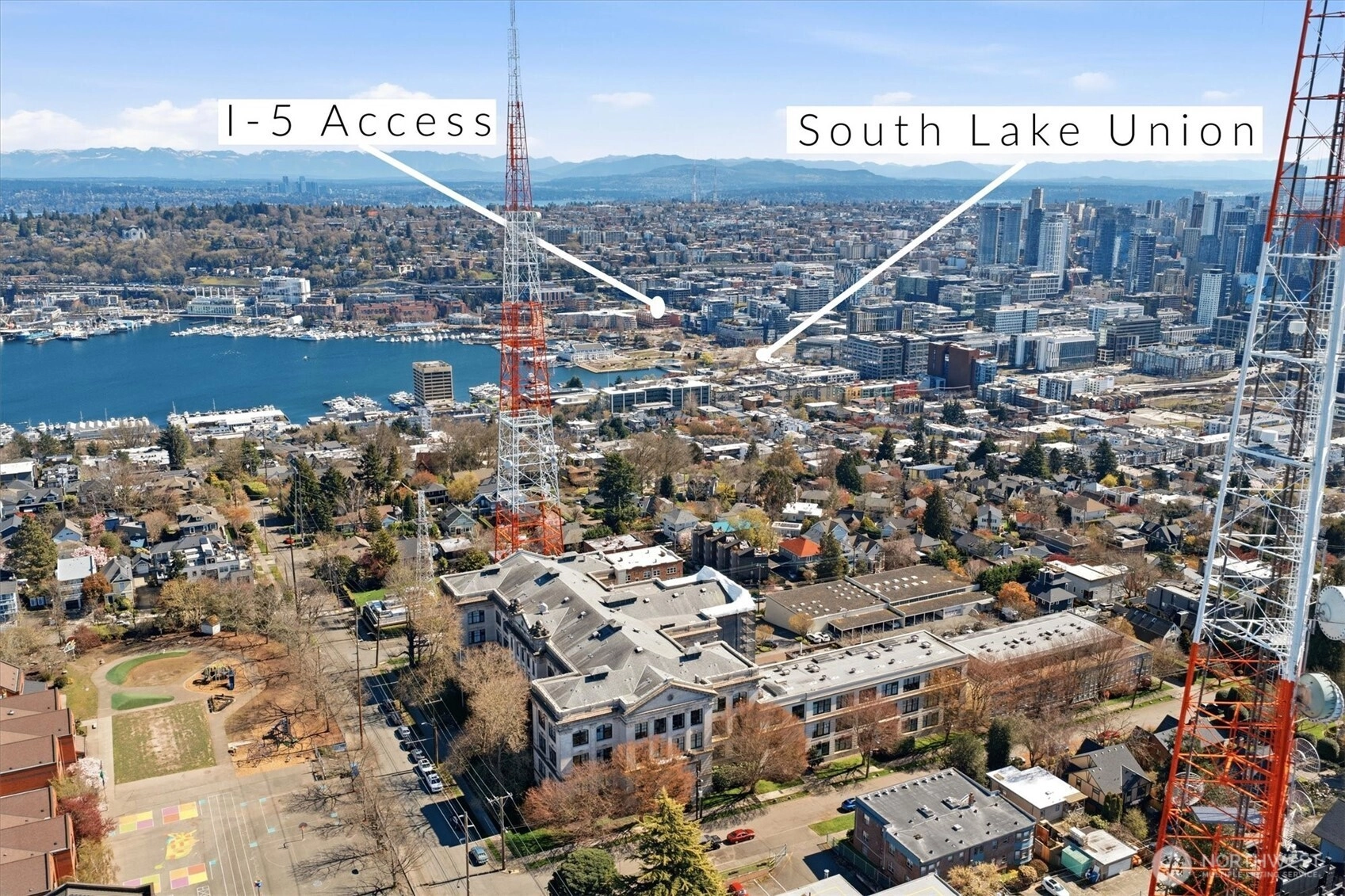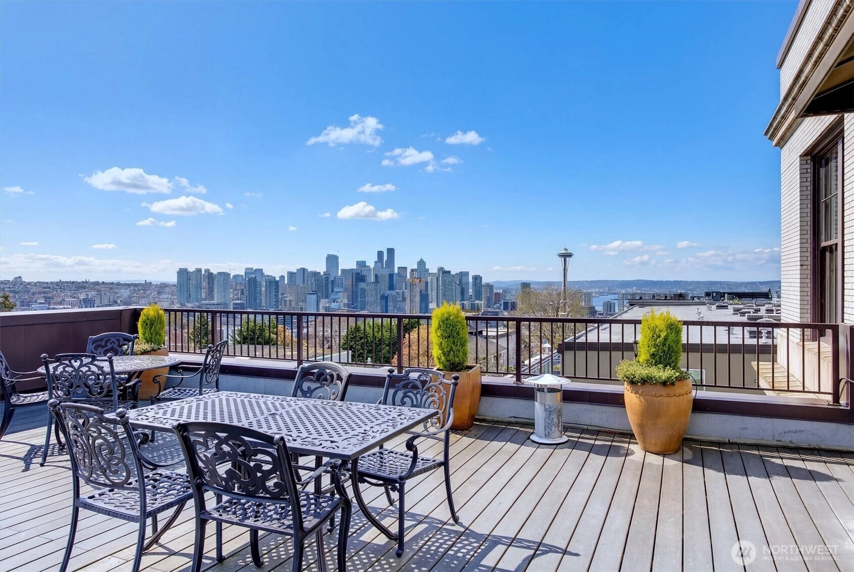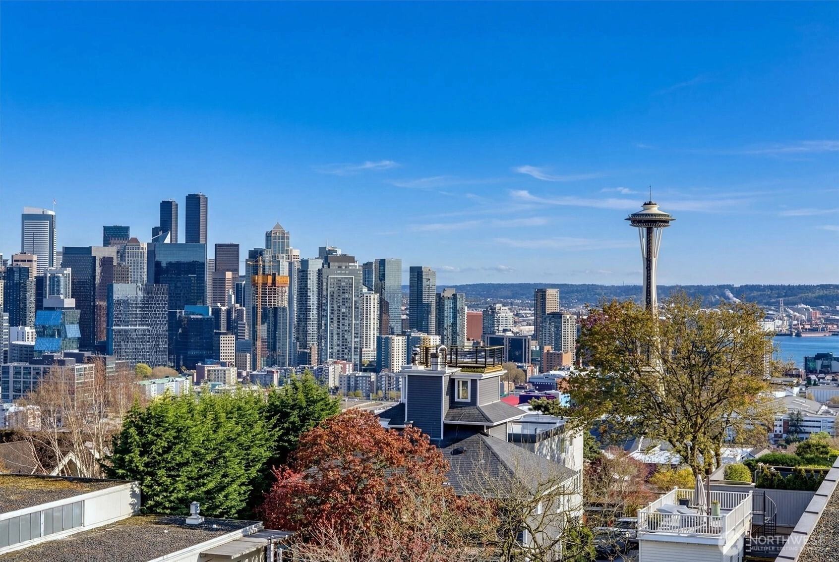 Own a piece of Seattle history at the iconic Queen Anne High School. This light-filled, open-concept 1-bedroom studio offers one of the best layouts in the building, with a rare view of the Space Needle. High ceilings and hardwood floors create an open feel, while the kitchen and classic tiled bath offer practical functionality. Free on-site laundry is just steps away, and a nearby storage unit adds extra convenience. The home also features new custom plantation shutters. The building sits atop Queen Anne Hill and includes a large rooftop deck with views of the city skyline, Puget Sound, and surrounding mountains. Amenities include an on-site manager, off-street parking, bike storage, and pet-friendly policies with no rental cap. Located just blocks from Queen Anne’s shops, restaurants, and services, this home offers a mix of historic character and everyday convenience.
