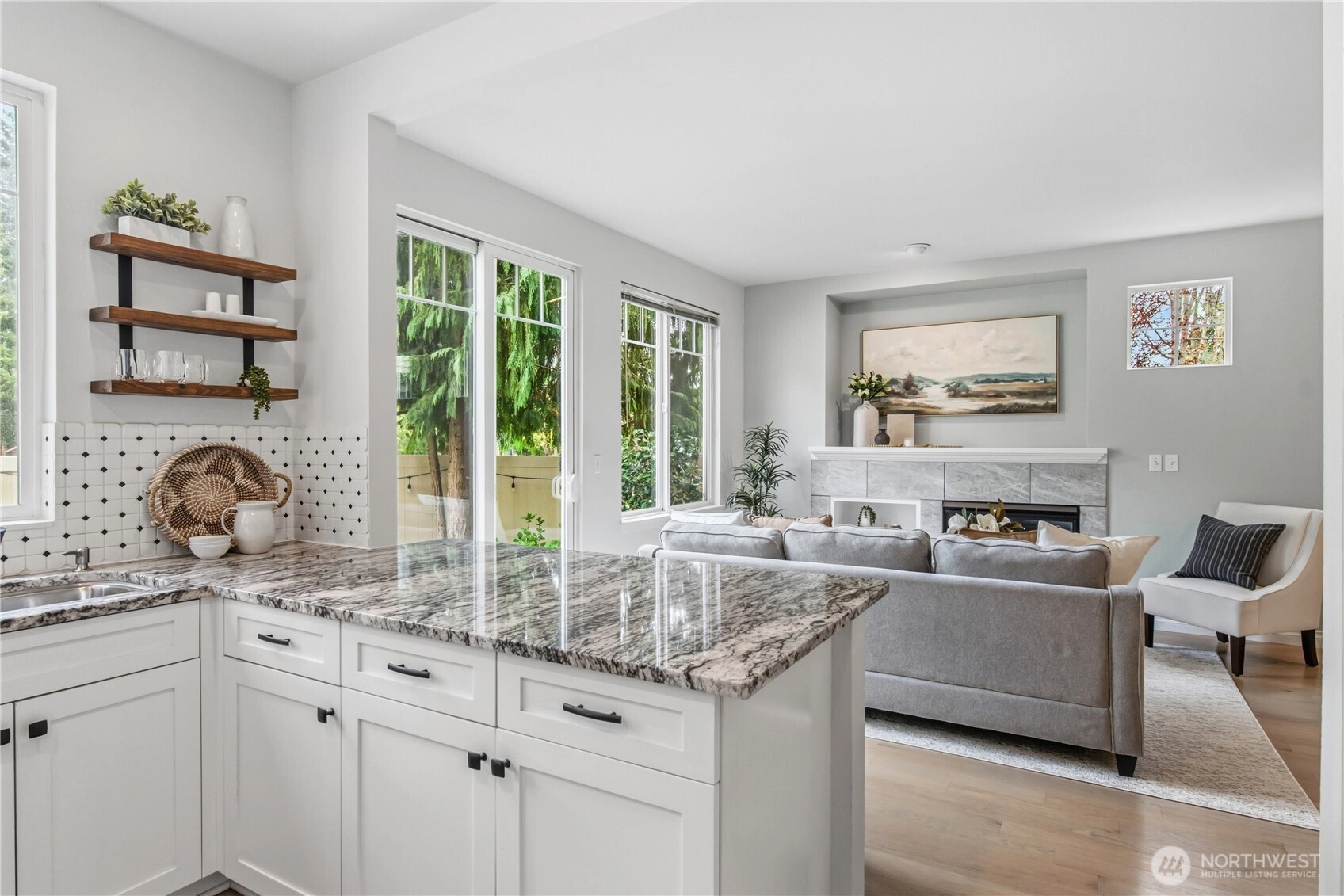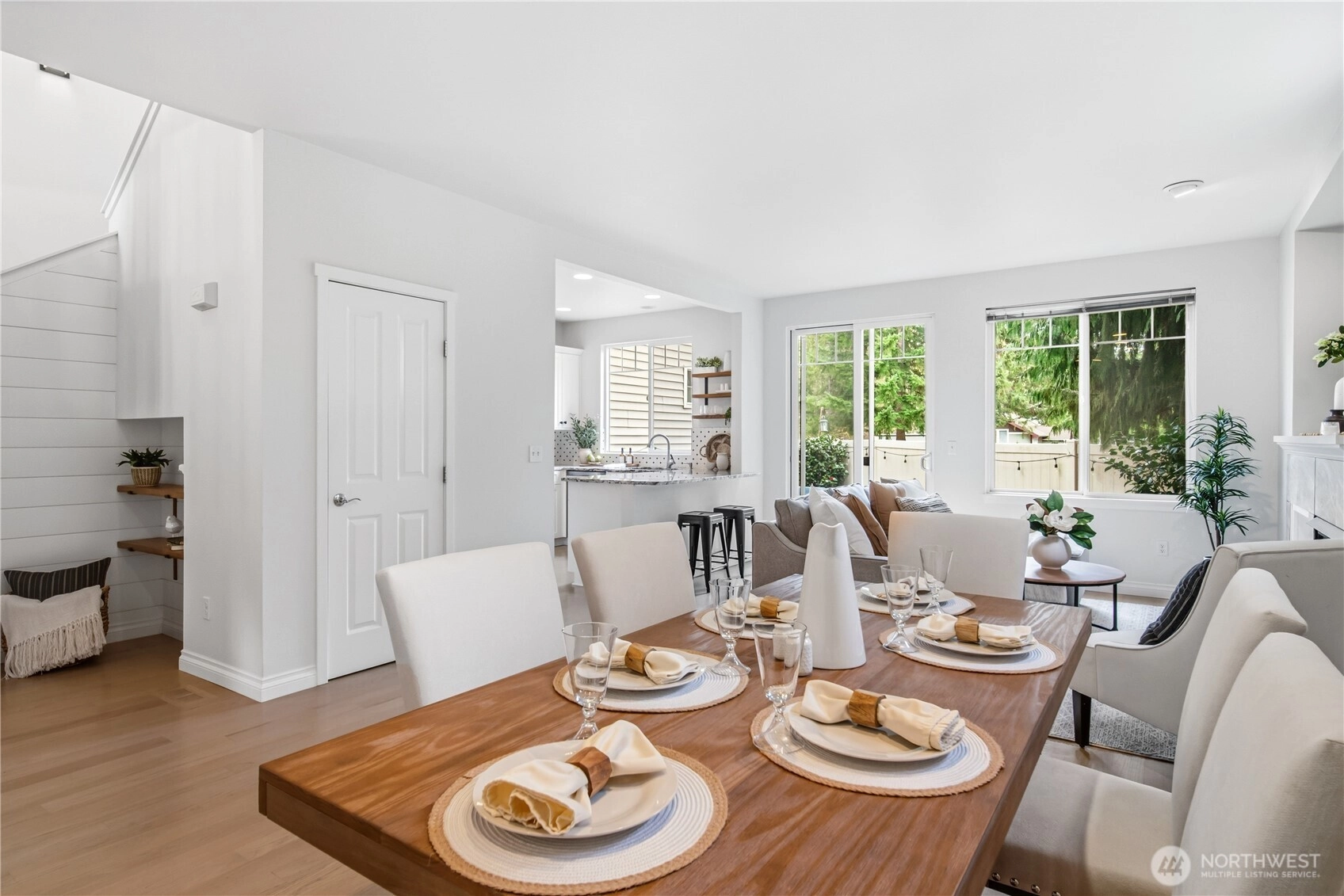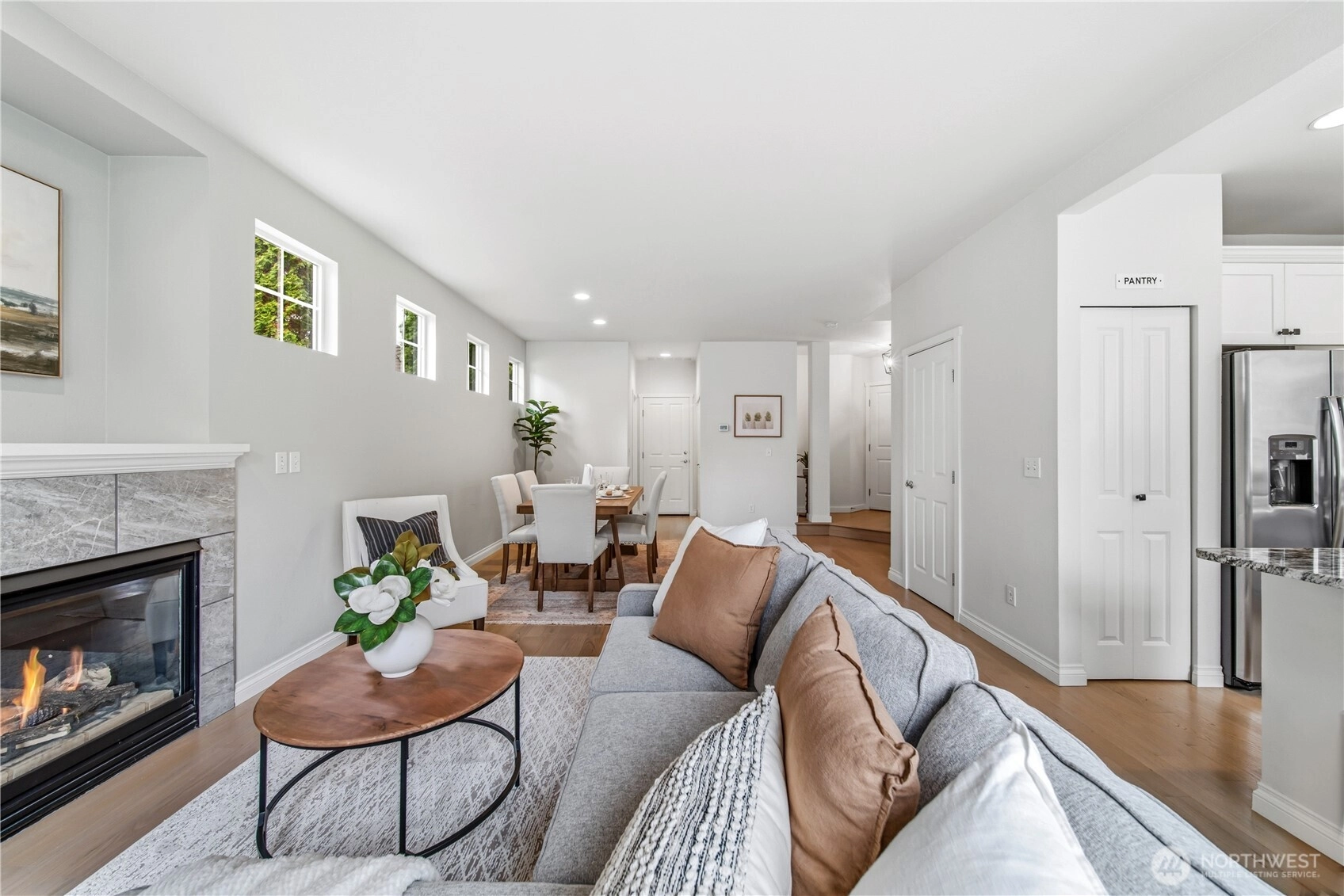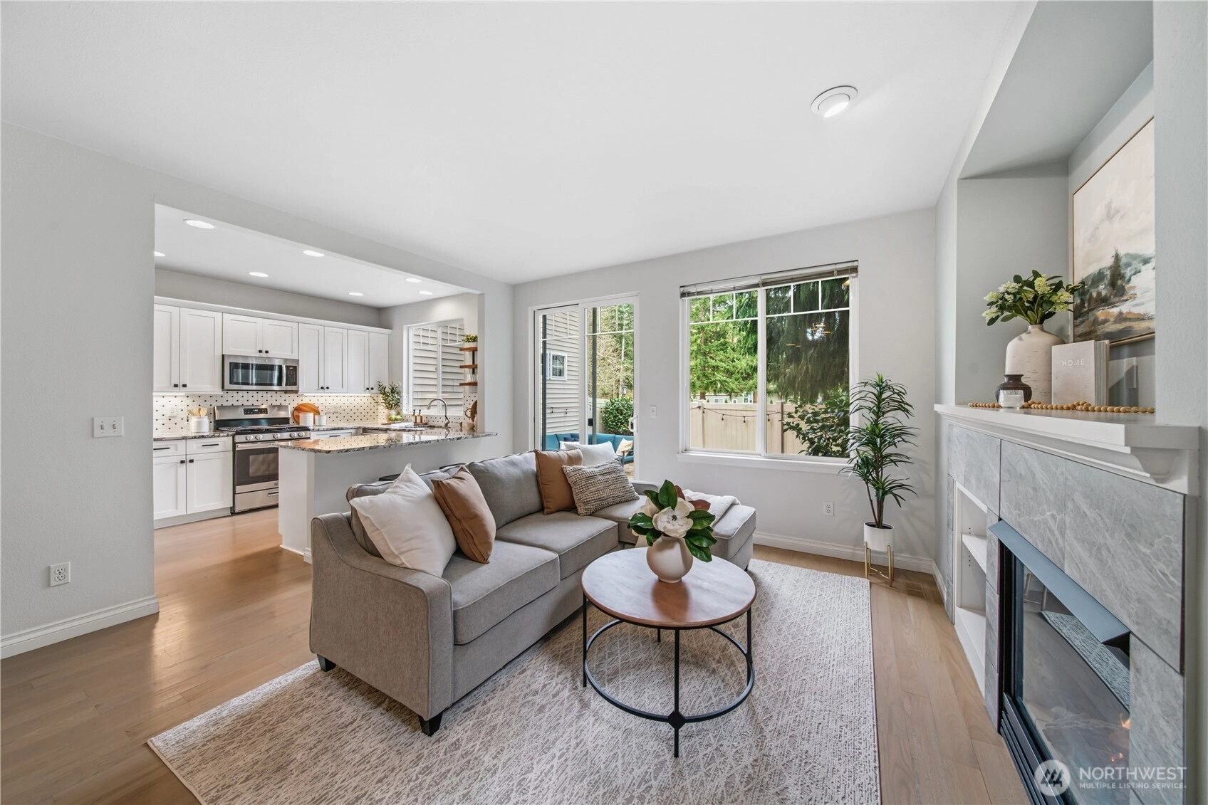 Beautifully updated townhome in a secure gated community, just a short walk to vibrant downtown Issaquah. Offering 3 bedrooms, 2.25 bathrooms, and 1,545 square feet, this home blends comfort, function, and style. The main level features spacious, light-filled living and dining areas with hardwood floors, creating a warm and inviting place to gather. The kitchen is tastefully updated with granite countertops and stainless steel appliances. Upstairs, the flexible loft provides the perfect space for a home office, playroom, or second living area. The primary suite is a true retreat, complete with an en suite bathroom featuring a tiled walk-in shower, double vanity, and granite countertops. Two more spacious bedrooms provide flexibility for guests or everyday living. The additional bathrooms include tile floors and granite for a clean, elevated feel. Step outside to a fully fenced, low-maintenance yard with artificial turf and a paver patio—ideal for relaxing or entertaining without the upkeep. A spacious two-car garage with ceiling-mounted storage racks offers excellent storage and functionality. All of this and just minutes from local shops, dining, and everyday amenities.