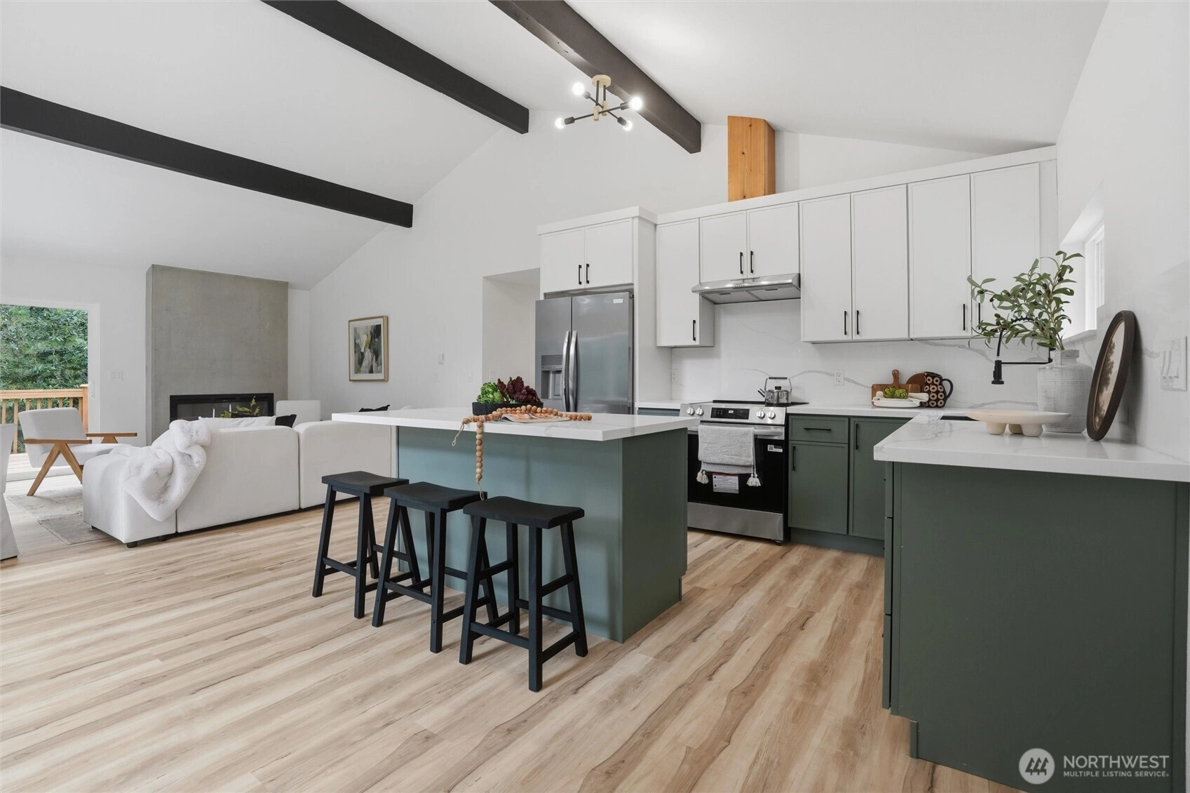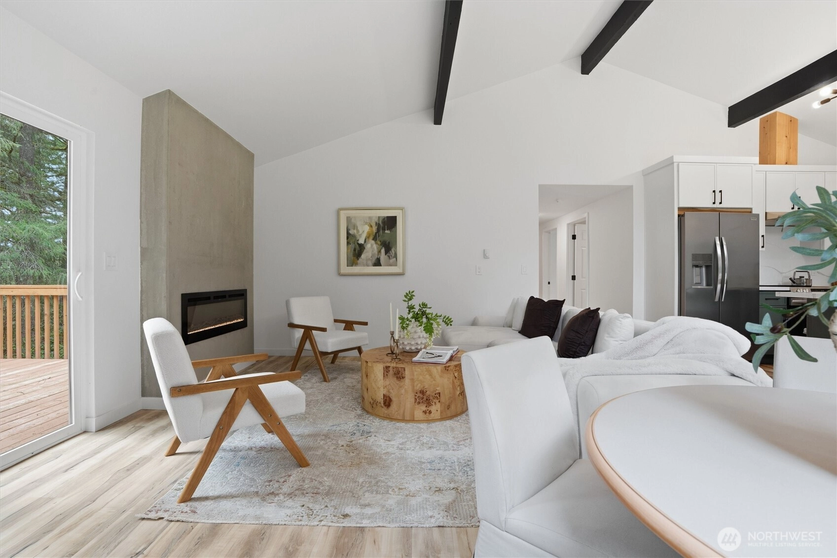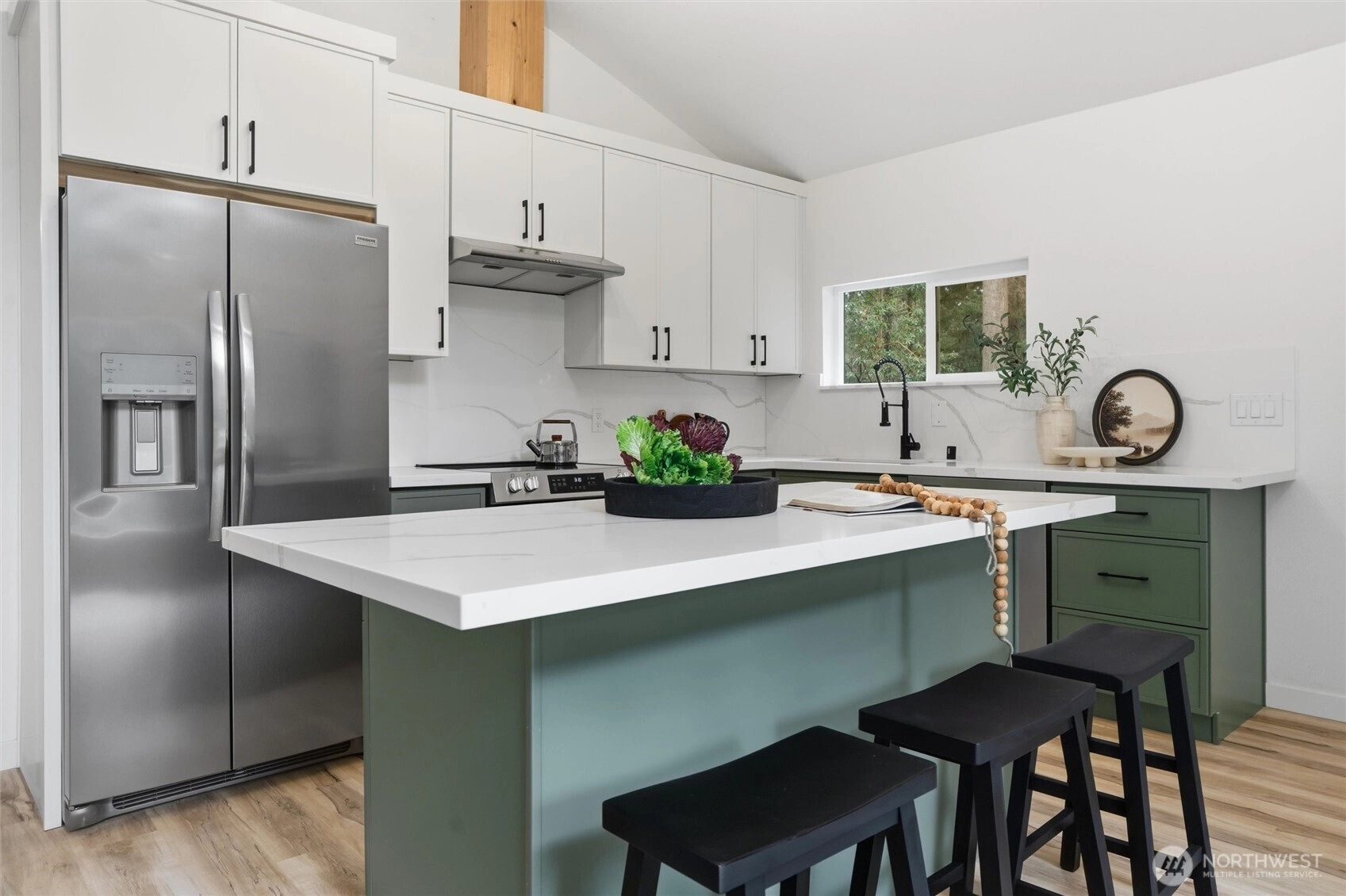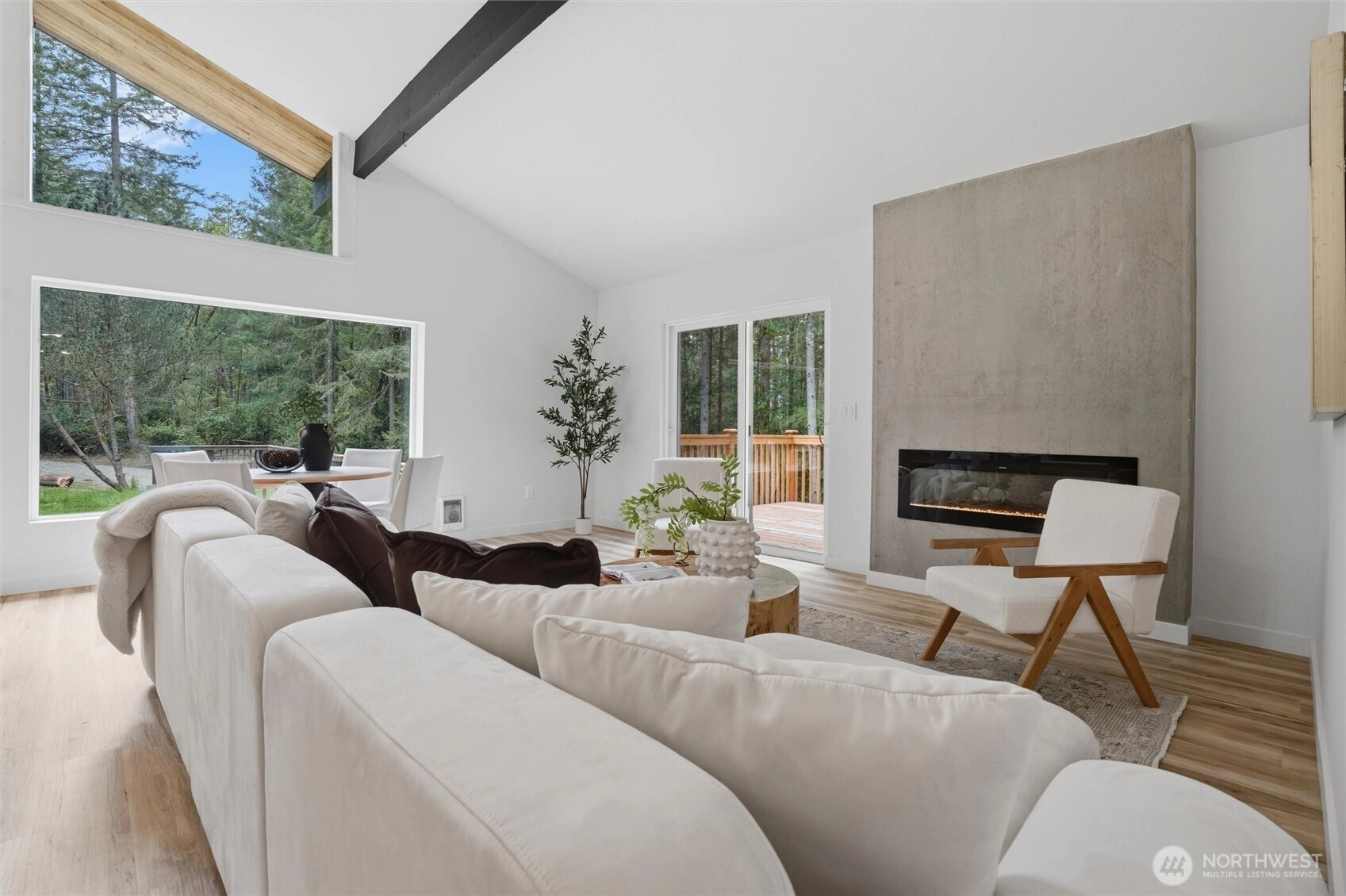 Tucked into the wooded quiet of Olalla, this fully reimagined home on 2.71 private acres has been stripped to the studs and rebuilt into something that stops you mid-scroll. New storm-resistant double-pane windows frame territorial views. Vaulted ceilings lift every room toward the light. And at the heart of it all... a showstopping kitchen where quartz counters sweep across a generous island, custom cabinetry rises clean and confident, and every surface quietly announces: this is not your average renovation. Both bathrooms have been completely transformed. LVP flooring flows throughout the main level with the kind of warmth that makes you want to kick off your shoes and stay. An electric fireplace anchors the living space with cozy intention. Below, a massive unfinished basement ...1,338 square feet of raw potential waits for your vision. A second 3-bedroom septic system already exists on the property, opening a genuine path to a future DADU, subject to permit approval. Build equity. Generate rental income. Or simply let the land breathe around you. South Kitsap schools. RV parking. A deck made for slow mornings. A secluded, paved-street address in Olalla that feels like a private retreat without surrendering convenience. This home got a second chance and didn't waste a single inch of it. The front door is open. Come feel the difference.