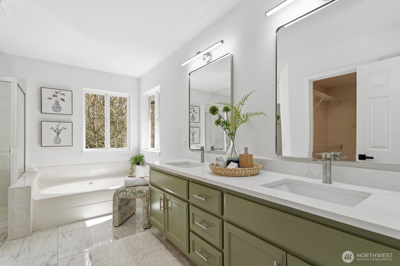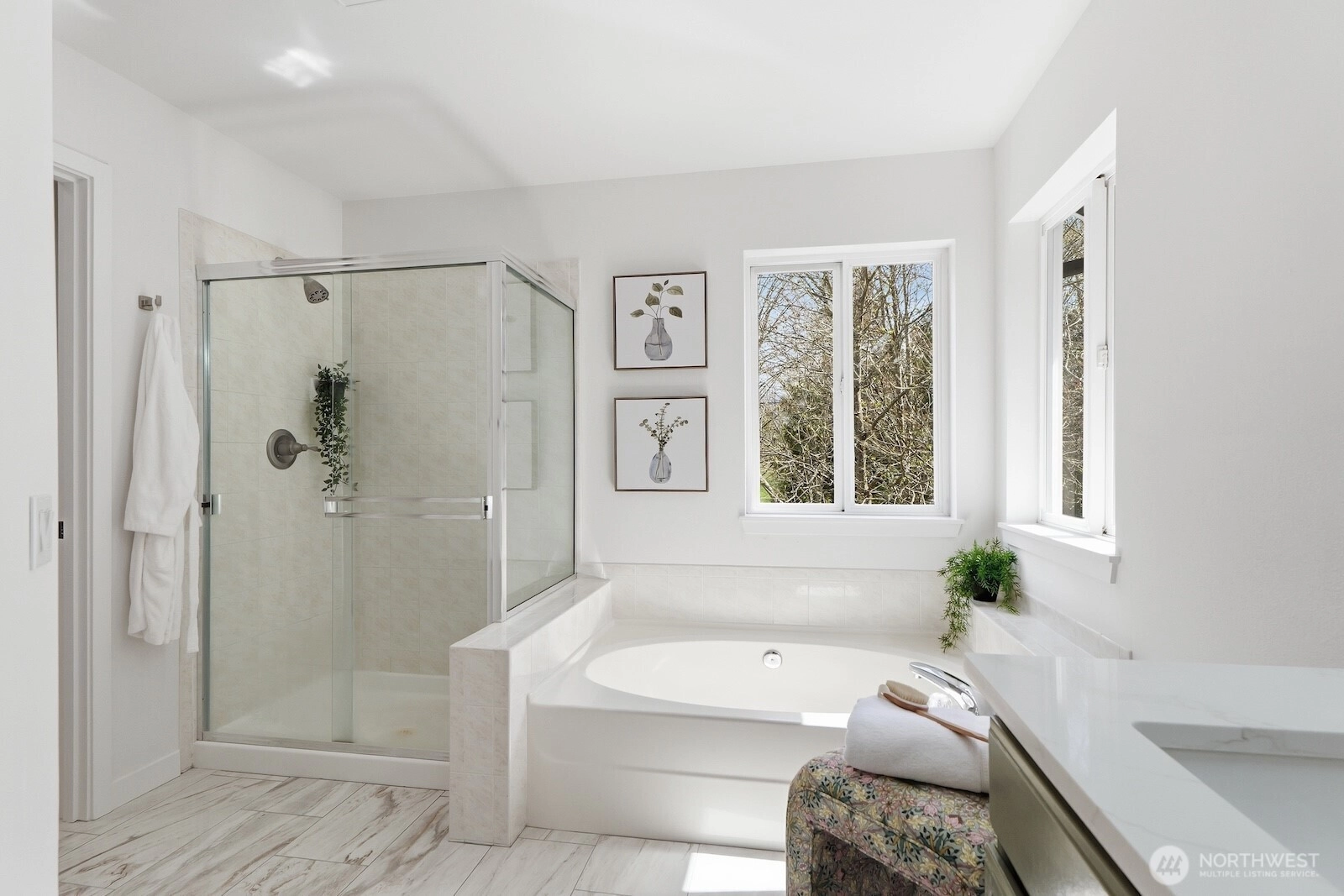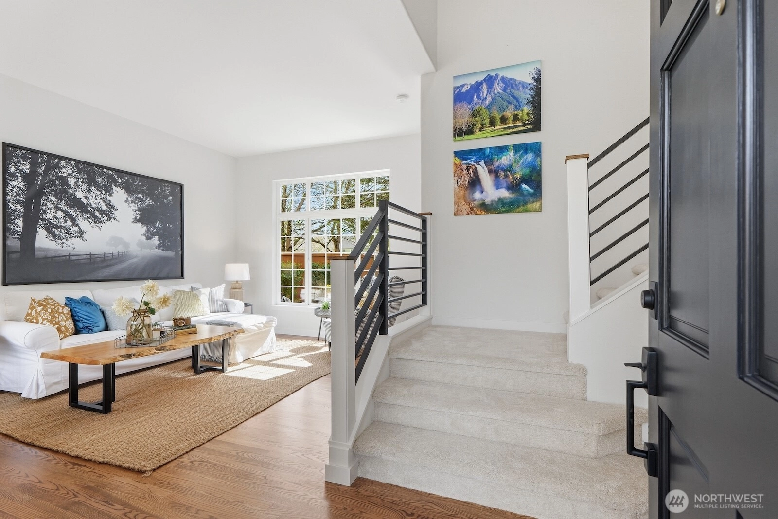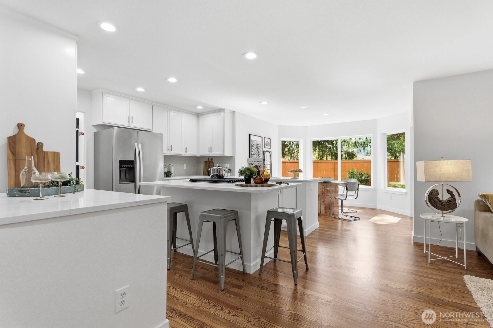 Refined. Scenic. Connected. Beautifully remodeled 4-bedroom (+office) home in North Bend’s highly sought-after Si View neighborhood. Situated on a picturesque corner lot backing one of the neighborhood parks, the home offers peaceful surroundings & stunning views of Mt. Si, Rattlesnake Ledge & the Cascades. Updated with a refined design aesthetic the interior features vaulted ceilings, refinished hardwoods, new carpet, fresh paint, modern railing, as well as, updated lighting, millwork & hardware throughout. The great room area features a cozy family room w/ fireplace, light-filled breakfast nook & a remodeled kitchen showcasing quartz counters, tile backsplash, SS appliances (new gas cooktop!) & a spacious walk-in pantry. Main floor office provides an ideal work-from-home space. Upstairs, the spacious primary suite includes a walk-in closet & tastefully reimagined bath w/ walk-in shower, soaking tub, double vanity, large form tile, quartz counters & new mirrors, lighting & hardware. Three additional bedrooms & two baths have also been meticulously refreshed. Enjoy outdoor living in the fully fenced yard w/ expanded flagstone patio, mature landscaping & lawn areas. Three-car garage offers ample storage & workspace. Major upgrades= roof, HardiPlank siding, furnace, A/C & whole-home generator. Located in the award winning Snoqualmie Valley School District w/ easy access to I-90, and just steps from parks, trails, river access & community events. Easy to reach, hard to leave.