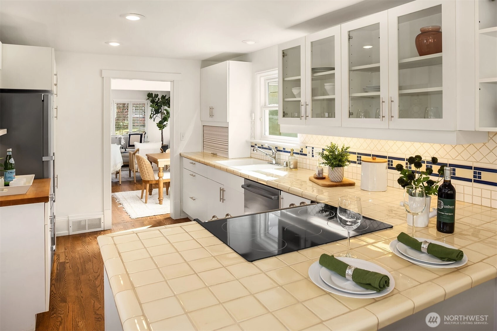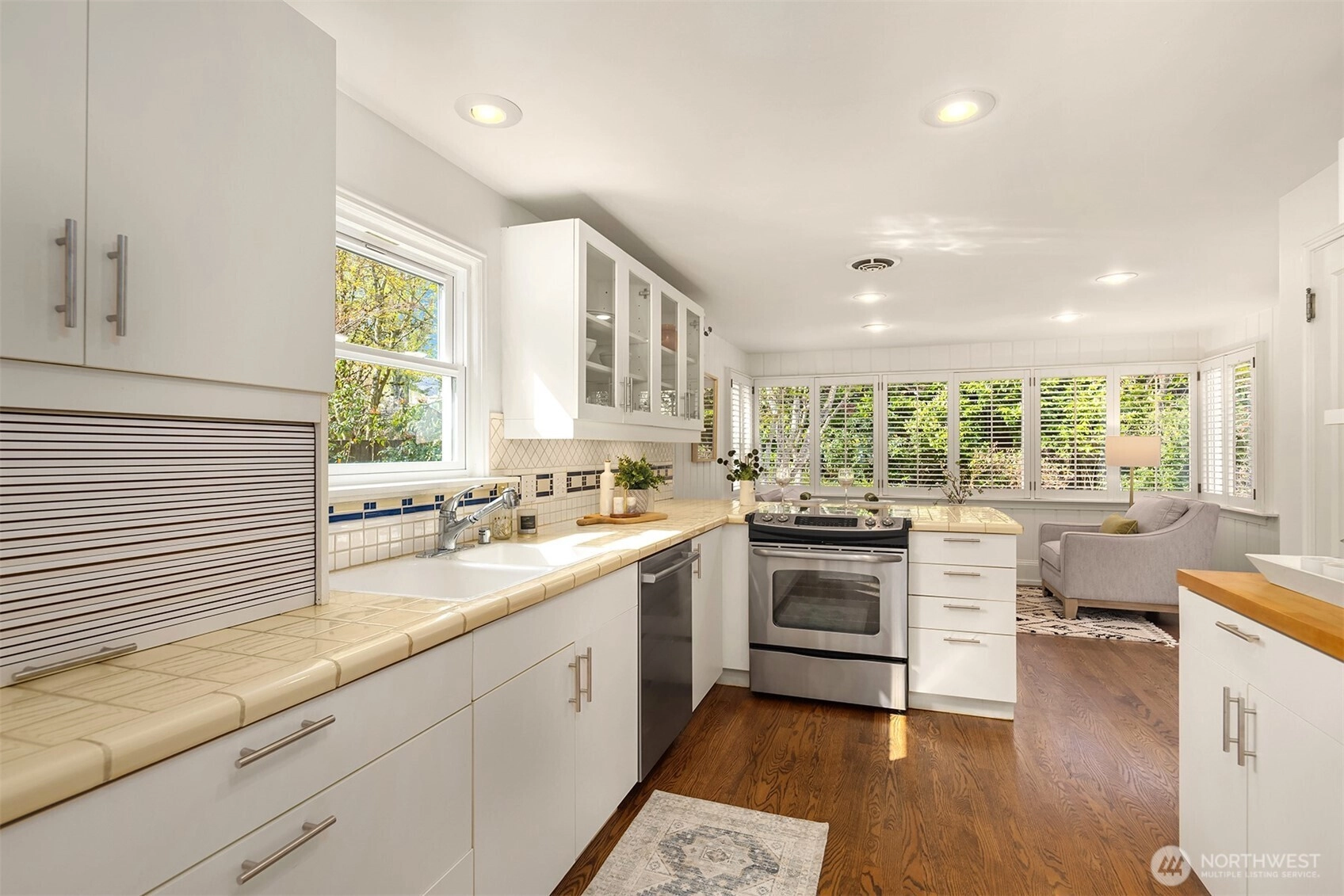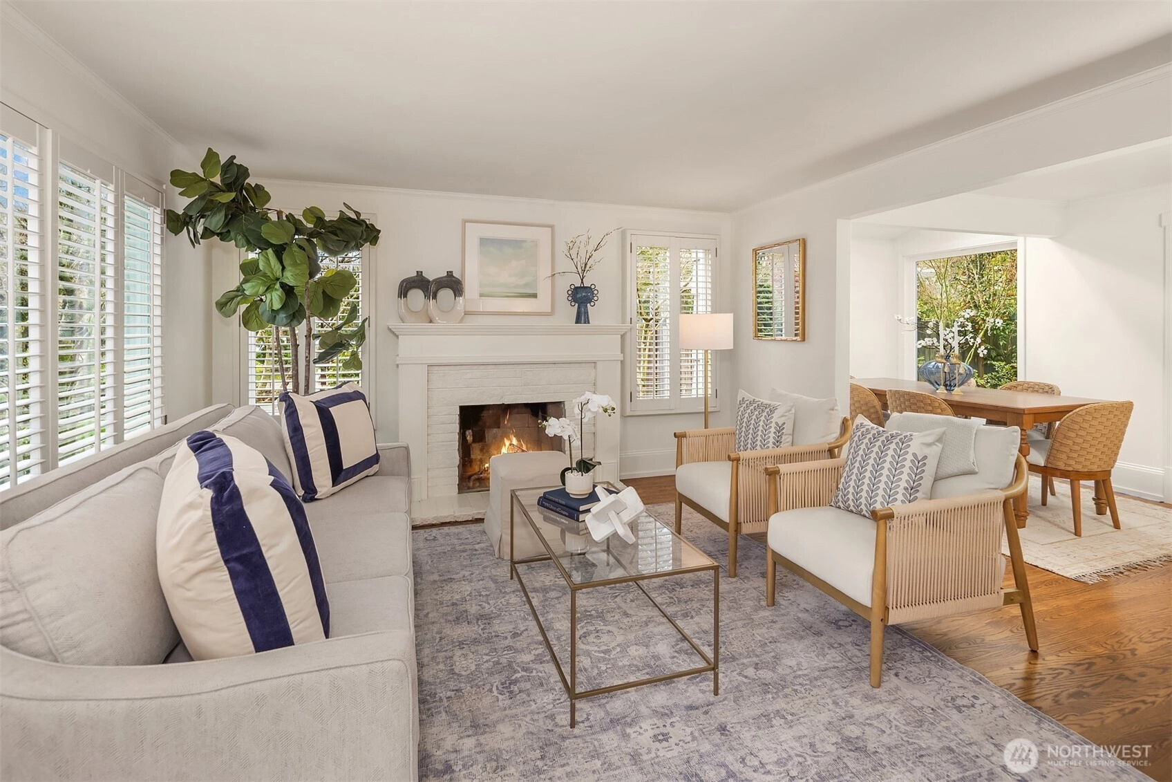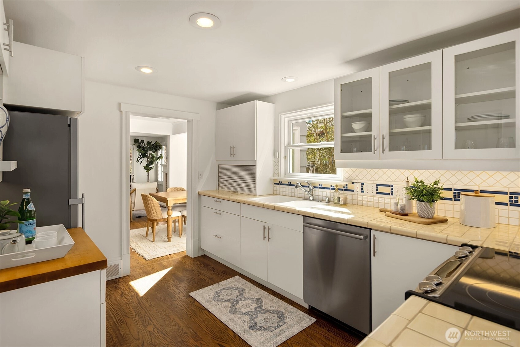 Tucked into the coveted Hawthorne Hills neighborhood, this charming cottage captivates with classic shutters and lush, verdant landscaping. Inside, rich hardwood floors run throughout, while a wood-burning fireplace with a beautiful mantle anchors the warm and inviting living room. A delightful dining nook with skylight fills the home with natural light, and the generously sized kitchen offers a breakfast bar along with an additional sitting or casual dining area—ideal for everyday living. French doors open to an expansive deck, creating effortless indoor-outdoor flow for entertaining or quiet relaxation. Established plantings and mature trees surround both the front and back yards, making this a true gardener’s retreat. Up a few stairs with privacy away from the living spaces, find two well-proportioned bedrooms and a full bath with vaulted ceiling and skylight. Downstairs, you’ll find a dedicated laundry room, abundant storage, and access to the one-car garage. Ideally located near Bryant Park, Metropolitan Market, PCC, the Burke Gilman Trail, and just minutes to Seattle Children’s, Magnuson Park, University Village, and the University of Washington makes this the perfect place to enjoy a happy life!