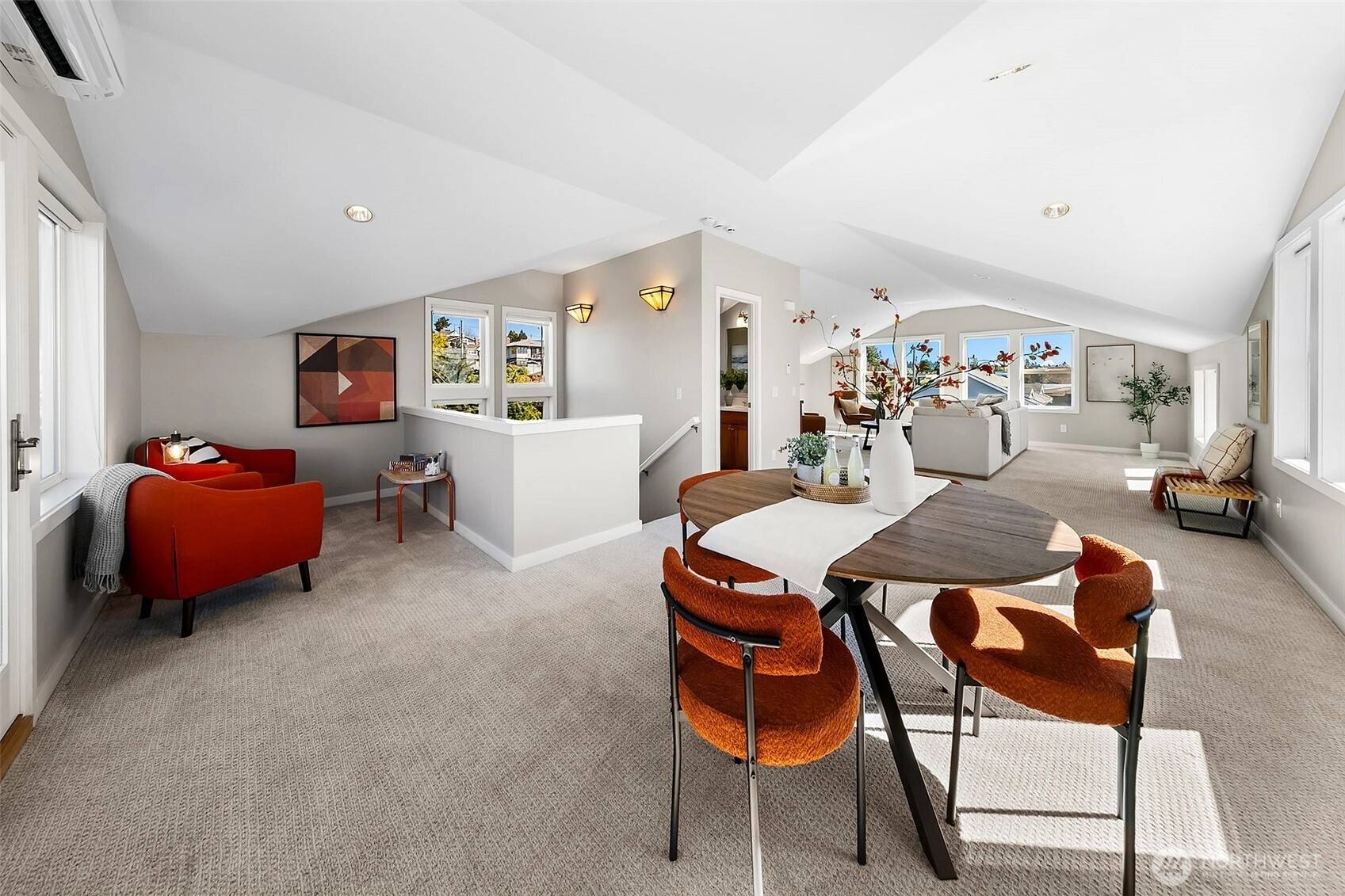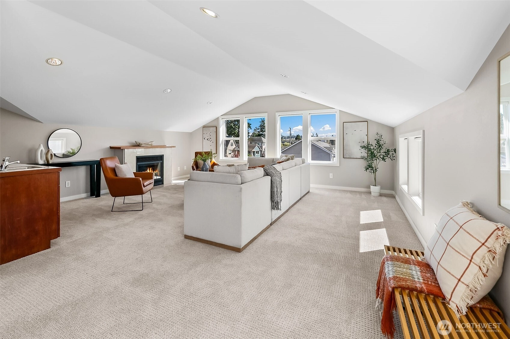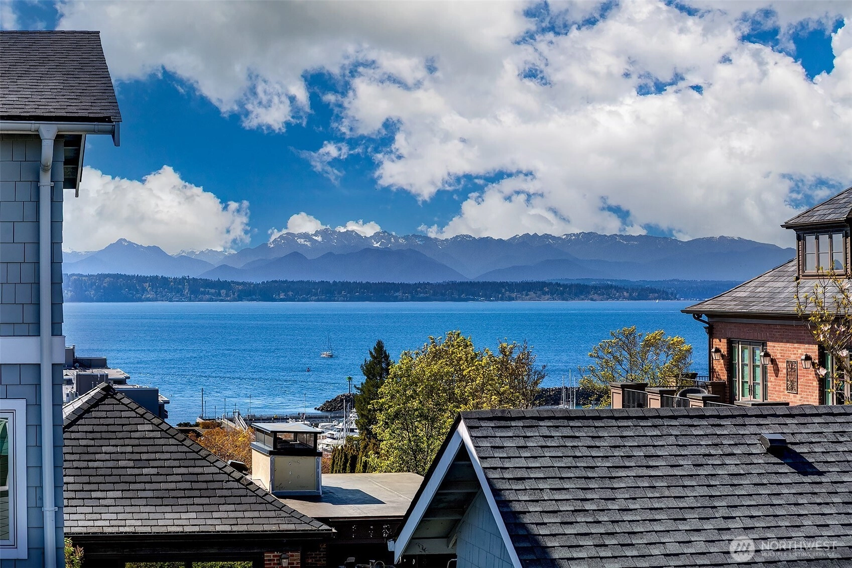 Sound and Mountain views in Sunset Hill. Main floor has a kitchen at the heart; with two distinct living rooms flanking it; a formal space with cozy gas fireplace, and large dining plus informal living with direct access to the private and large fenced patio with garden space - excellent indoor/outdoor living. 3 bedrooms and 2 baths on the 2nd floor, including a large view primary suite with 5-piece bath, deep soaking tub, and walk-in closet. Top floor is a bonus recreation/retreat space with sweeping views, vaulted ceilings, gas fireplace, wet bar, half bath (can add a shower and create another primary suite), and a big view deck. Another bonus, the basement includes a finished room (shown for exercise), outfitted wine cellar with heat pump for climate control, and attached one car garage. Each floor has radiant heat and air conditioning throughout. Sunset hill is Seattle’s sweetest spot overlooking Shilshole Bay, near Golden Gardens, Ballard Locks, and just 2 blocks to favorite dining, drinks, sweets and services.