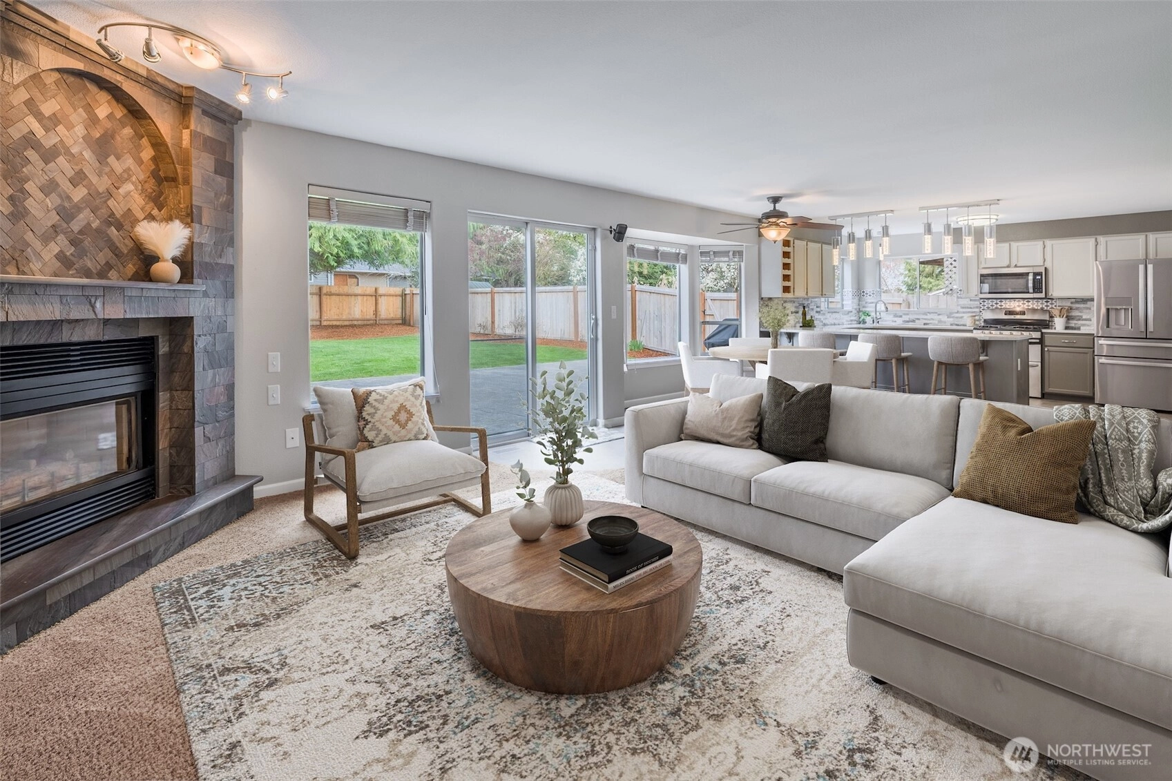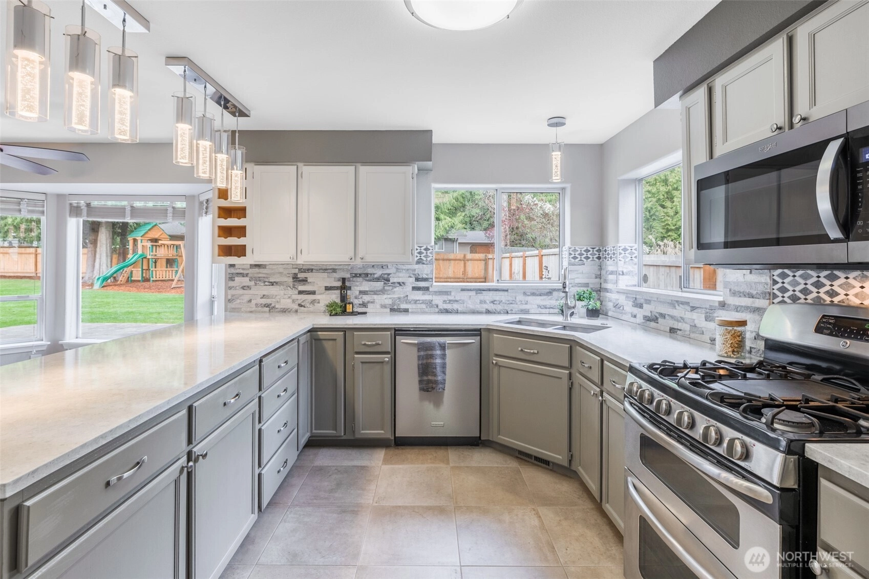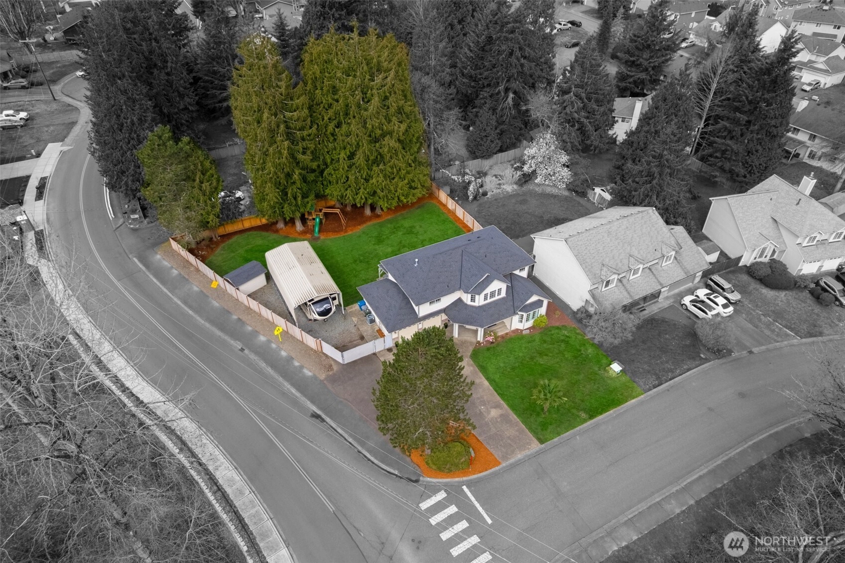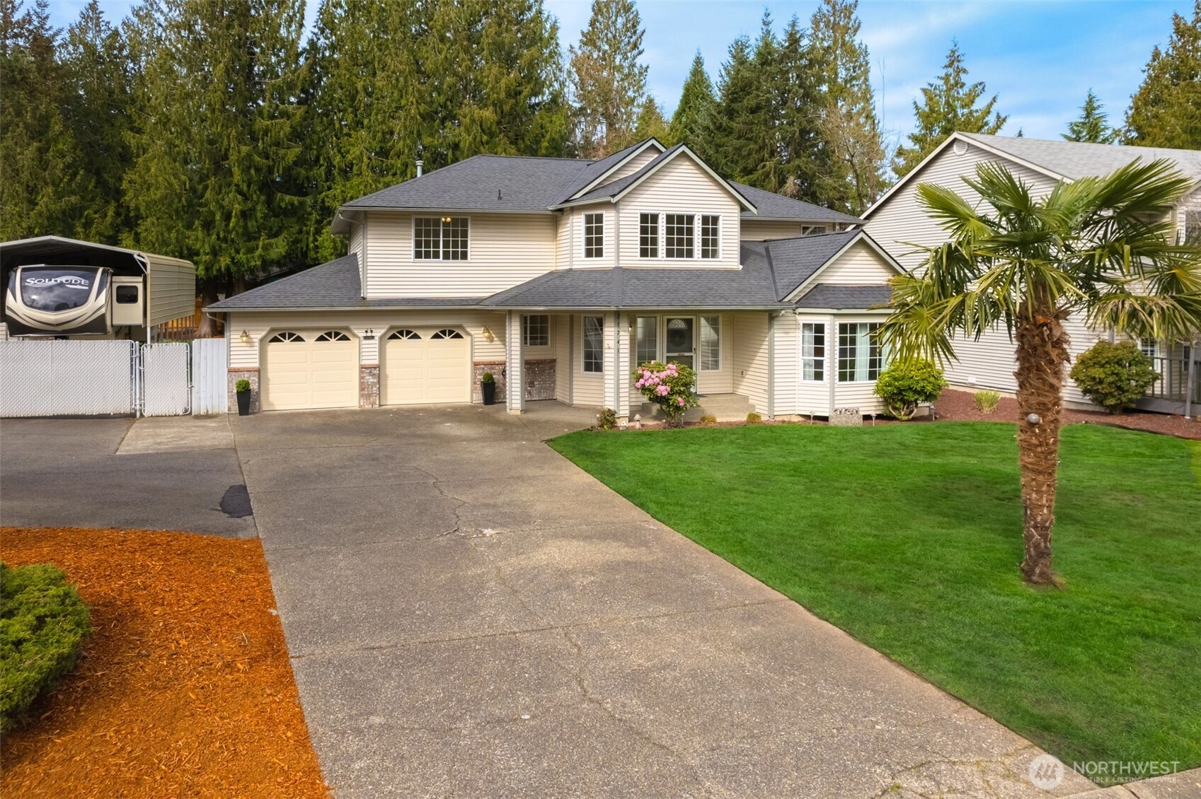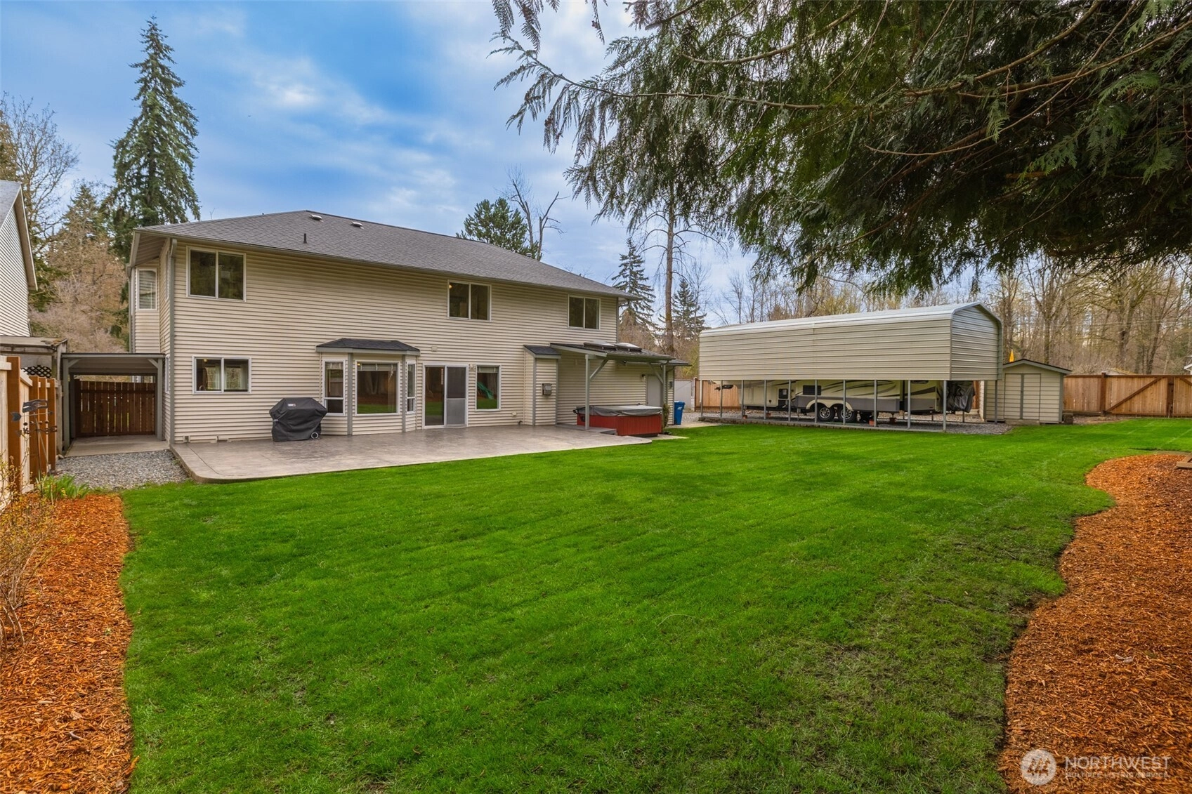 Situated on a beautiful spacious corner lot, this home is full of extras you won't want to miss.Welcome to the large driveway and covered front porch which greets you with a bright entry and vaulted ceilings. The large living room and nicely refreshed kitchen is open to the family room, nook, and dining room and it's perfect for gathering or entertaining. Upstairs feels roomy with a wide hallway, large rooms, great storage, and a huge primary suite with jetted tub, shower, double sinks, linen and walk in closet. This 4 bed, 3 bath, 2,450 sq ft home offers the perfect blend of comfort and functionality. Step out back to a well-maintained yard with a professional play system, beautifully manicured grass, large stamped concrete patio, gas plumbed BBQ, gazebo over a hot tub with built in speakers, and plenty of space to relax or entertain. The backyard also has 2 double gates and a large metal structure for your RV, boat or storage. Located in a desirable neighborhood with a nearby walking elementary school and convenient access to shopping, this home truly checks all the boxes. Don’t miss this one!*Some photos are virtually staged