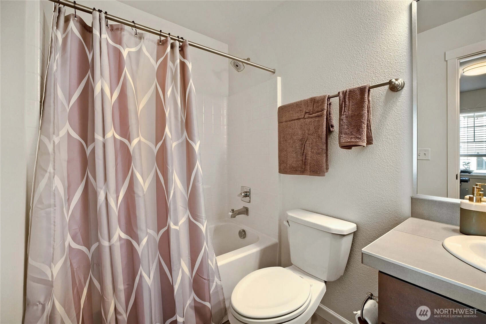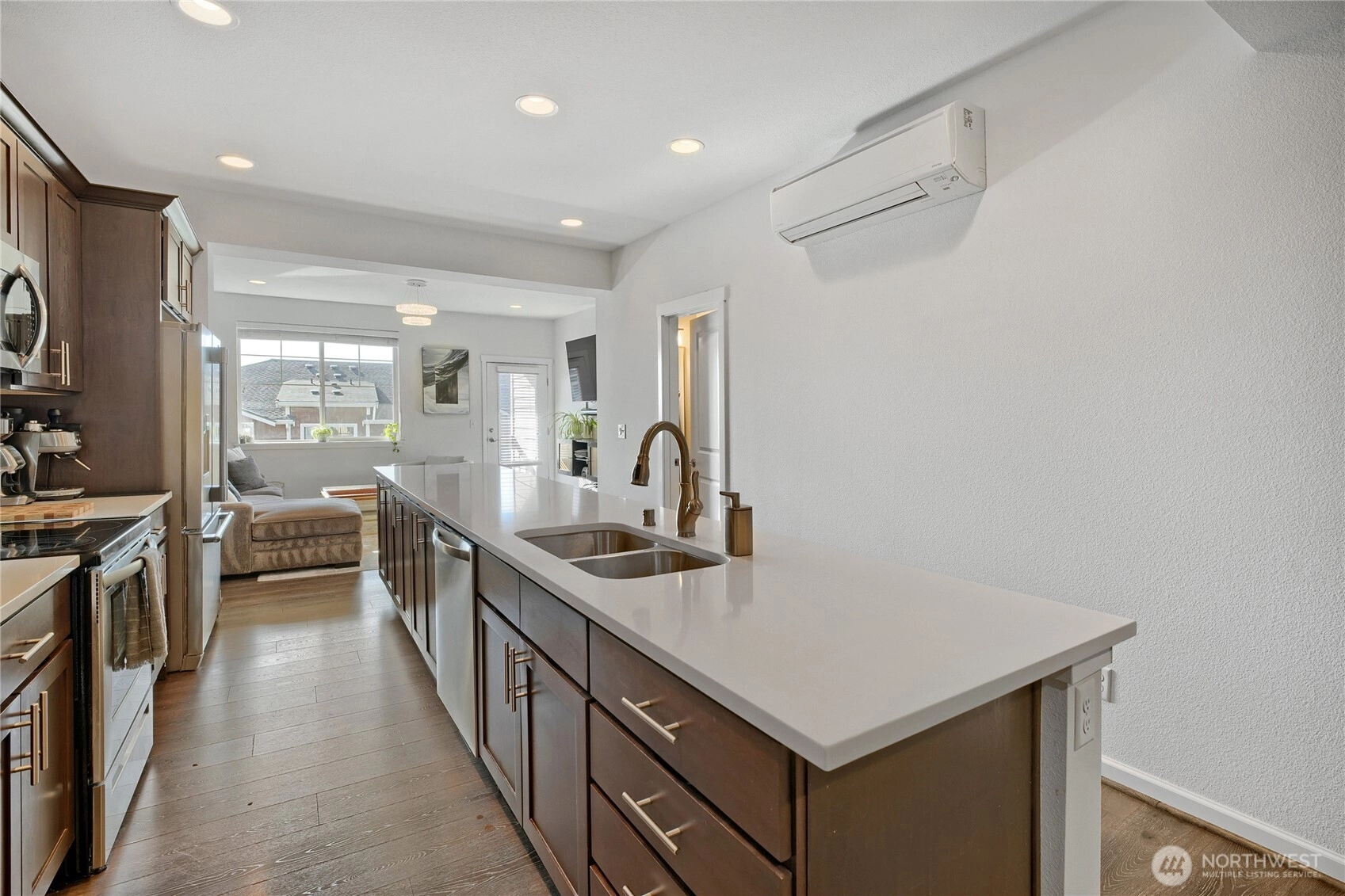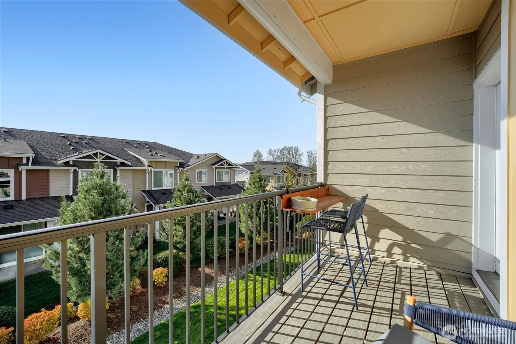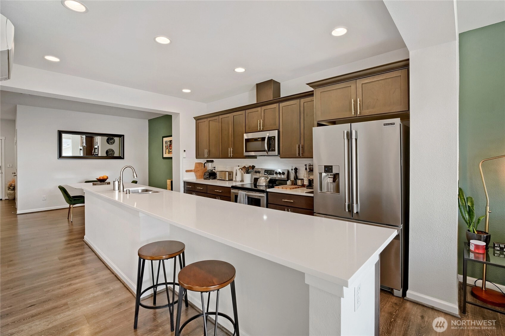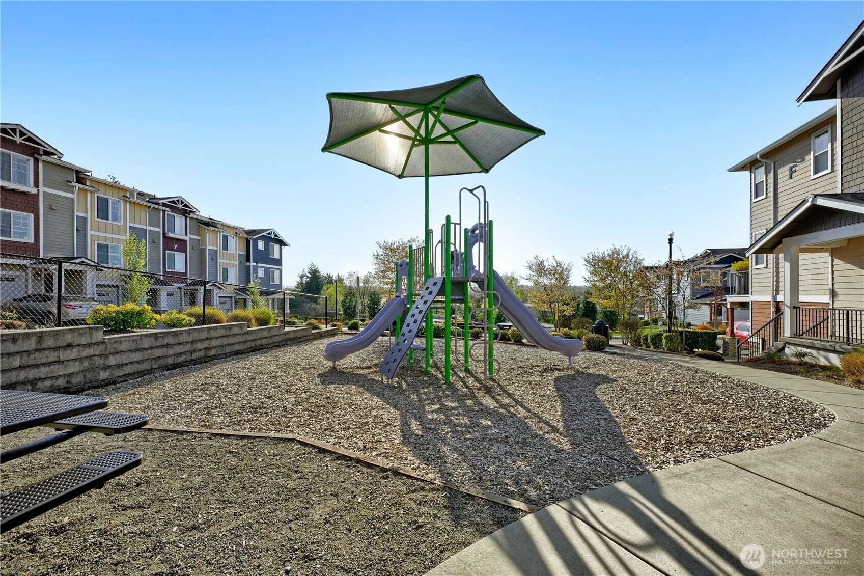 Turn the key and step into easy homeownership in this beautifully crafted Taylor Morrison townhome in the sought-after Sunridge community. Better-than-new construction with thoughtful detail at every turn, this home lives bright, open, and effortless from the moment you walk in. The main level is built for the way you actually live: light pours through the living room into a welcoming dining space and a stunning kitchen featuring stainless steel appliances, soft-close cabinetry, and a generous center island with bar seating, ideal for weeknight dinners or weekend entertaining. Step out to the covered deck for morning coffee, summer BBQs, or unwinding to Pacific Northwest sunsets over the park-like grounds.Upstairs, both bedrooms are true private retreats, each with its own ensuite bath, and upper-level laundry makes daily life that much easier. The attached garage offers room for parking, projects, and storage. Sunridge itself is a quiet, gated community with a playground, walking trails, friendly neighbors, no rental cap, and low-maintenance HOA dues covering common areas and lawn care. The location is the cherry on top: minutes to Kent Station’s shops, restaurants, and Sounder commuter rail, the ShoWare Center, Lake Meridian, Kent’s vibrant downtown dining scene, major grocery stores, and quick access to I-5 & thoroughfares for easy commutes to Seattle, Bellevue, Tacoma, or the airport. Welcome home!