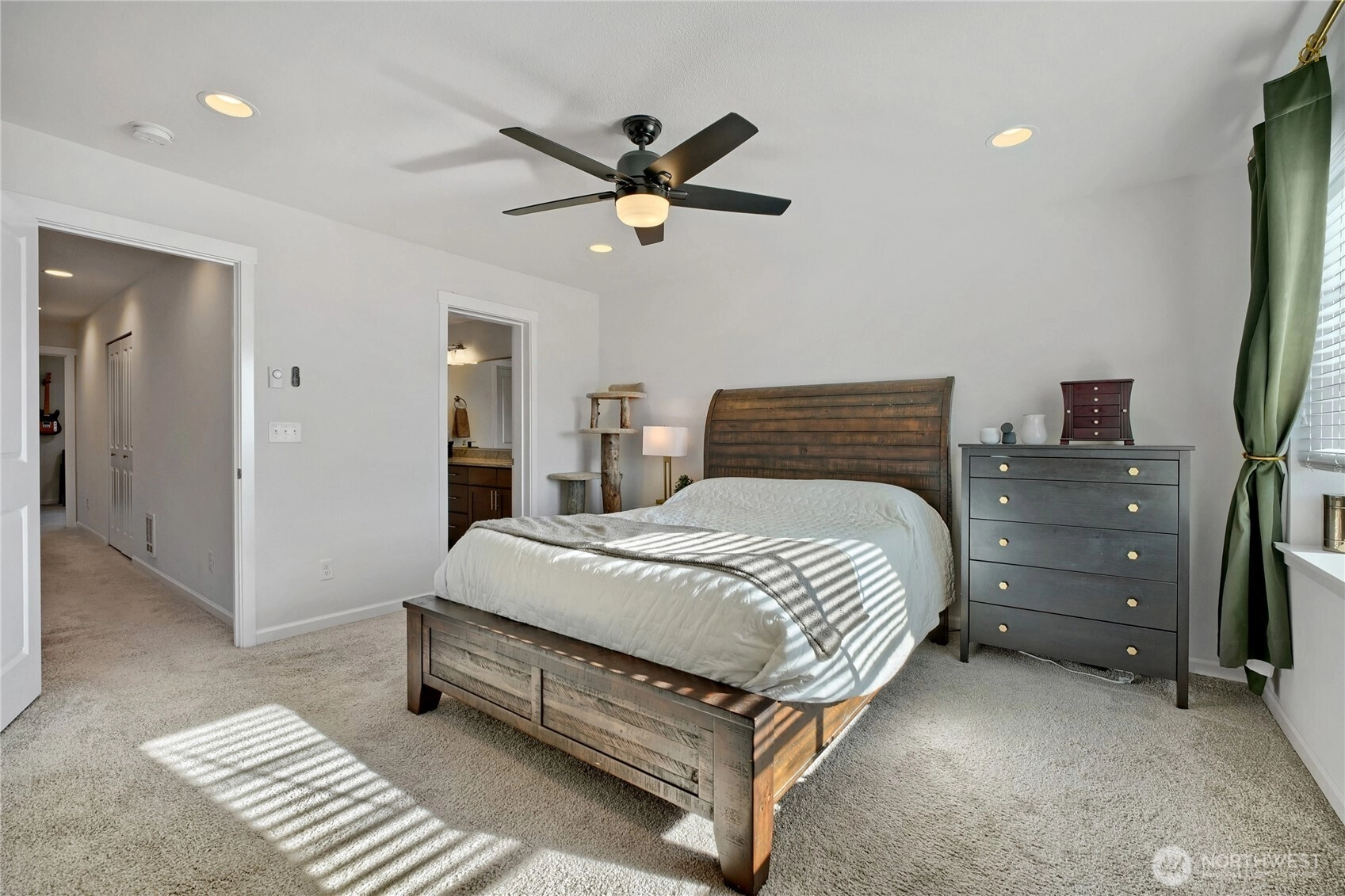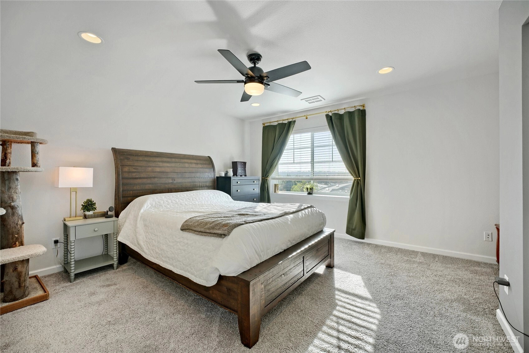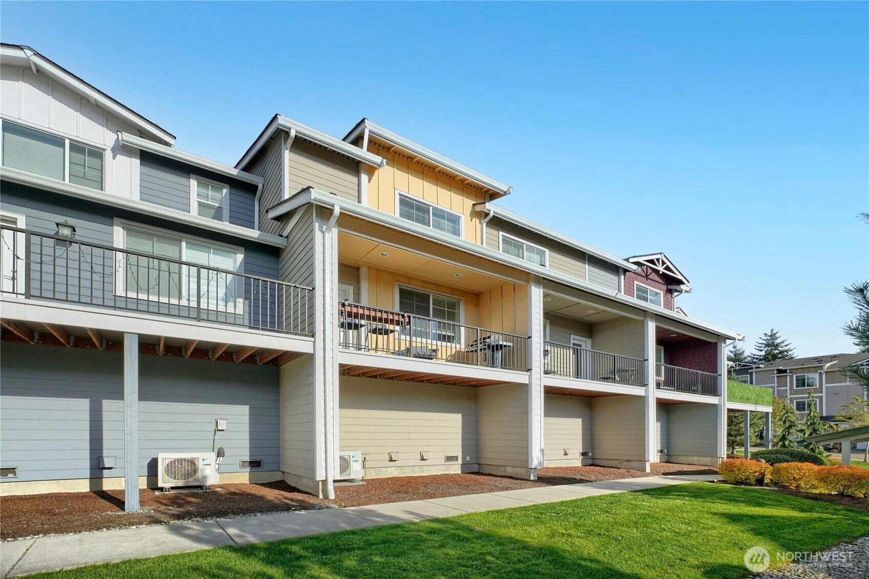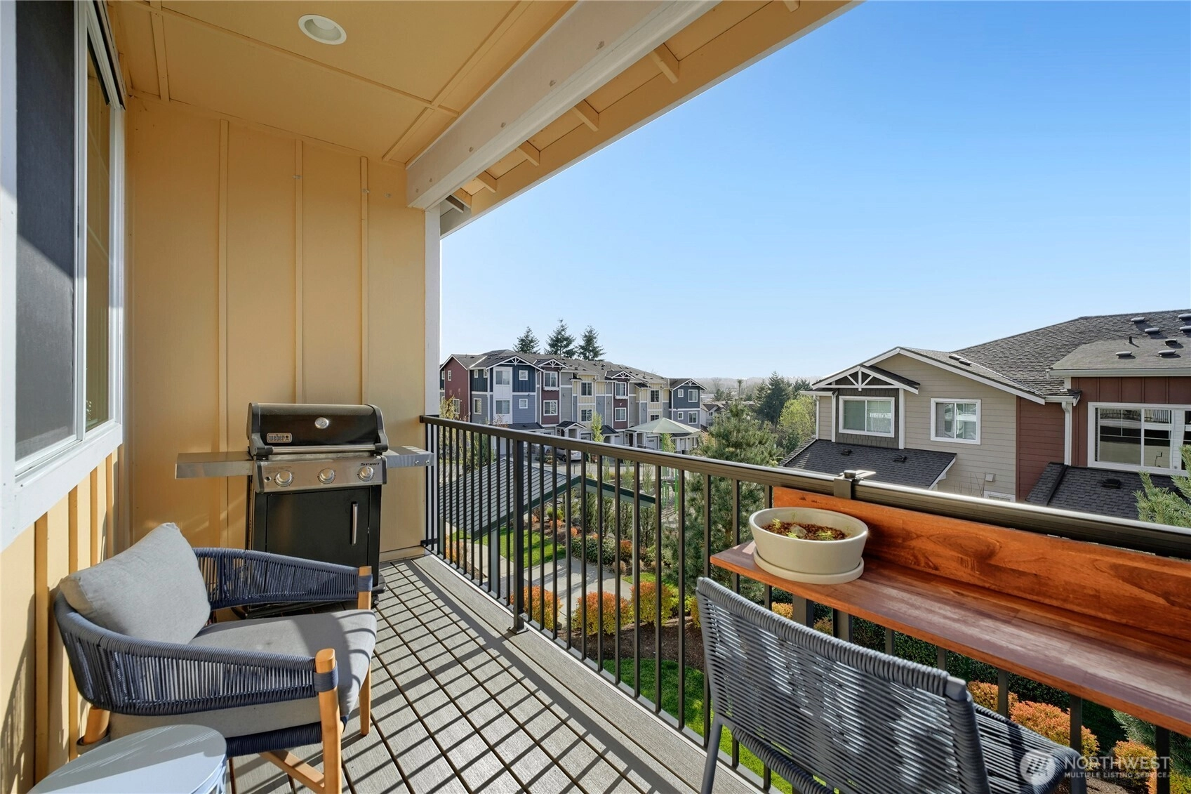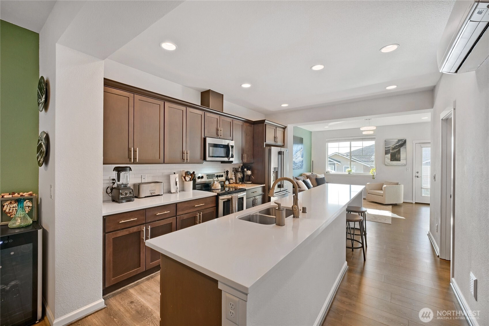 Turn the key and step into easy homeownership in this beautifully crafted Taylor Morrison townhome in the sought-after Sunridge community. Better-than-new construction with thoughtful detail at every turn, this home lives bright, open, and effortless from the moment you walk in. The main level is built for the way you actually live: light pours through the living room into a welcoming dining space and a stunning kitchen featuring stainless steel appliances, soft-close cabinetry, and a generous center island with bar seating, ideal for weeknight dinners or weekend entertaining. Step out to the covered deck for morning coffee, summer BBQs, or unwinding to Pacific Northwest sunsets over the park-like grounds.Upstairs, both bedrooms are true private retreats, each with its own ensuite bath, and upper-level laundry makes daily life that much easier. The attached garage offers room for parking, projects, and storage. Sunridge itself is a quiet, gated community with a playground, walking trails, friendly neighbors, no rental cap, and low-maintenance HOA dues covering common areas and lawn care. The location is the cherry on top: minutes to Kent Station’s shops, restaurants, and Sounder commuter rail, the ShoWare Center, Lake Meridian, Kent’s vibrant downtown dining scene, major grocery stores, and quick access to I-5 & thoroughfares for easy commutes to Seattle, Bellevue, Tacoma, or the airport. Welcome home!