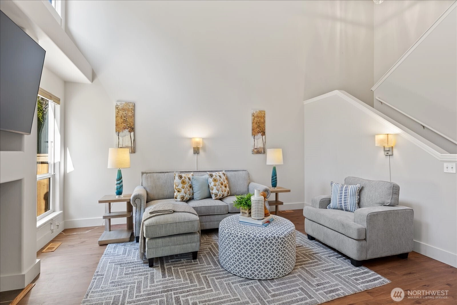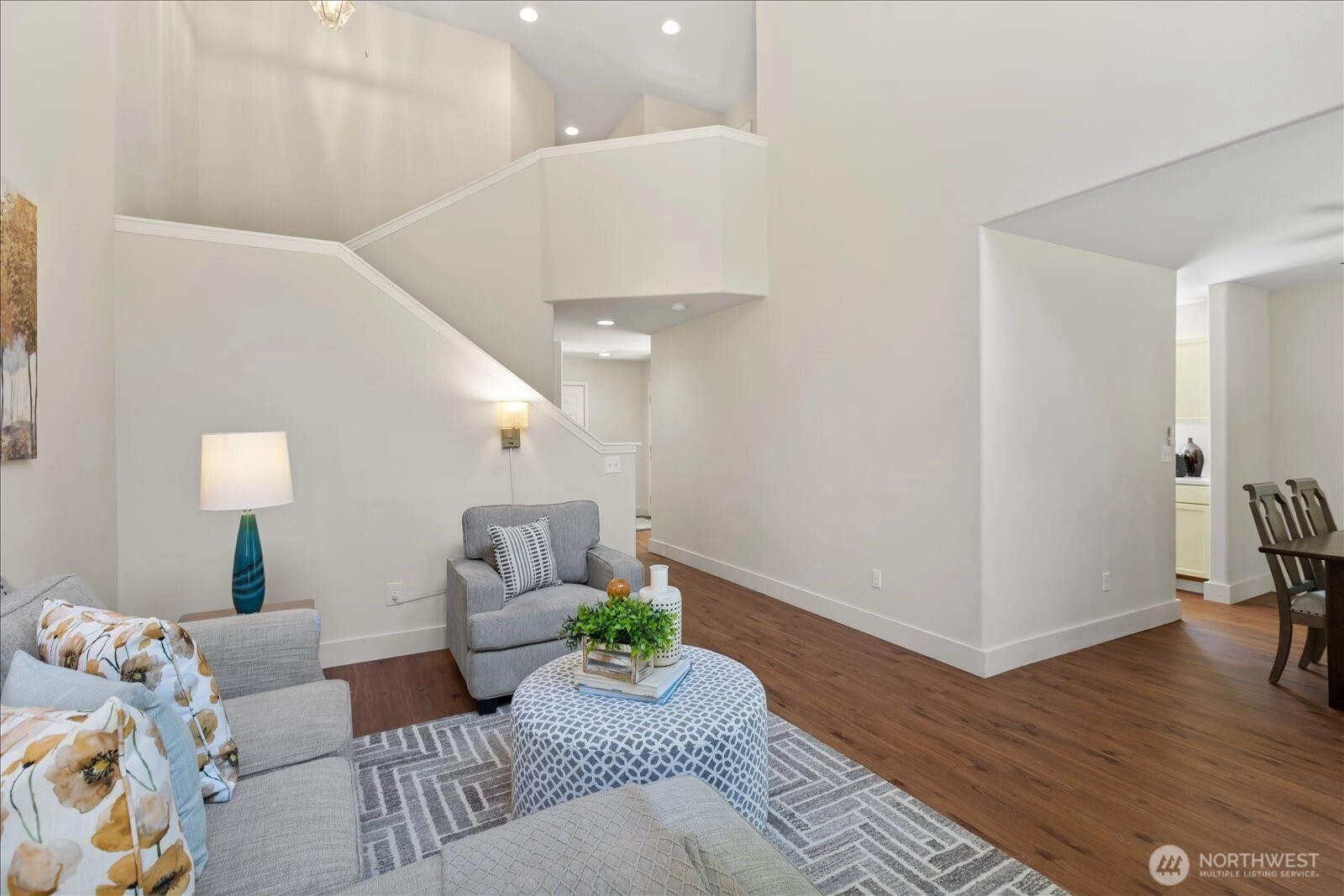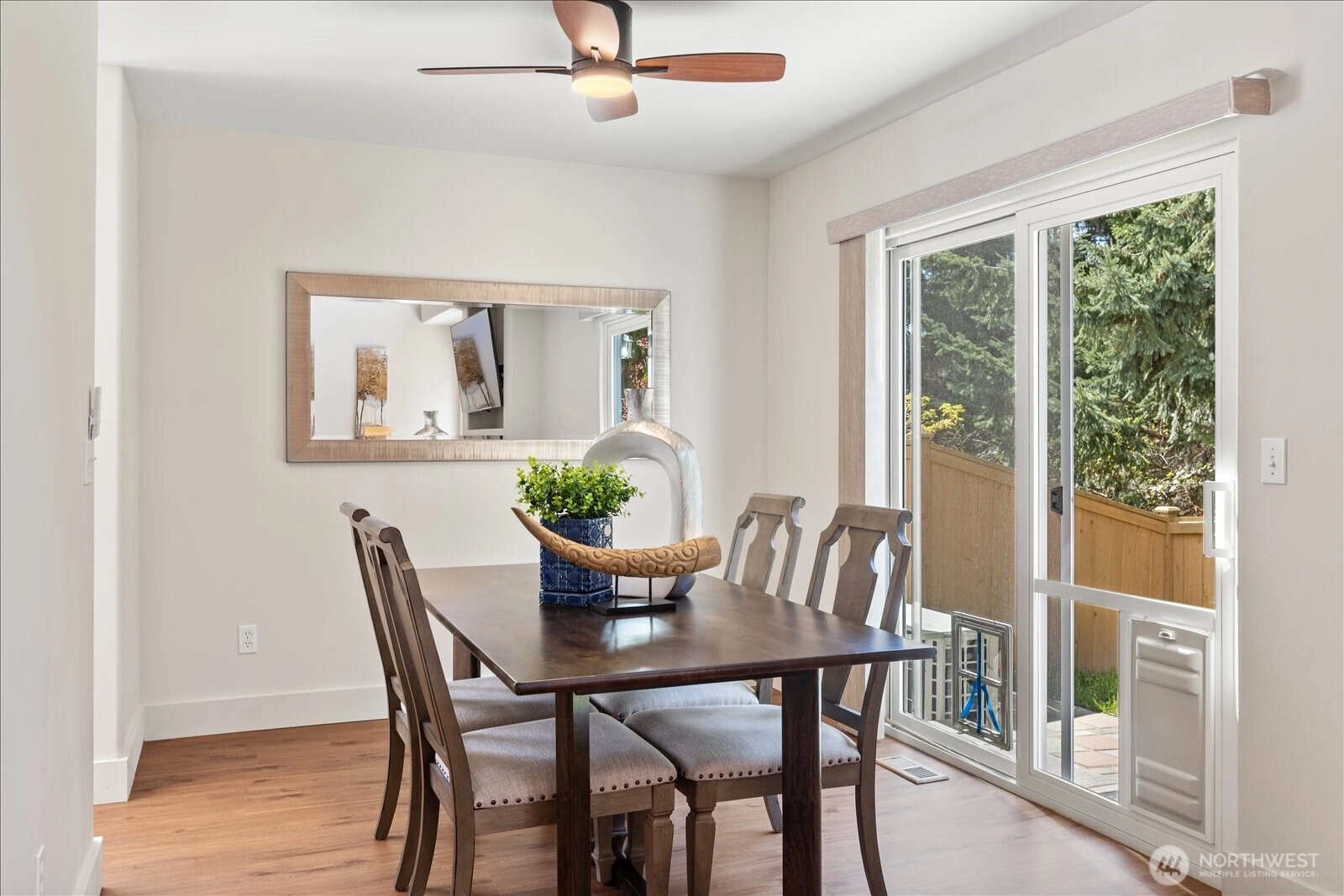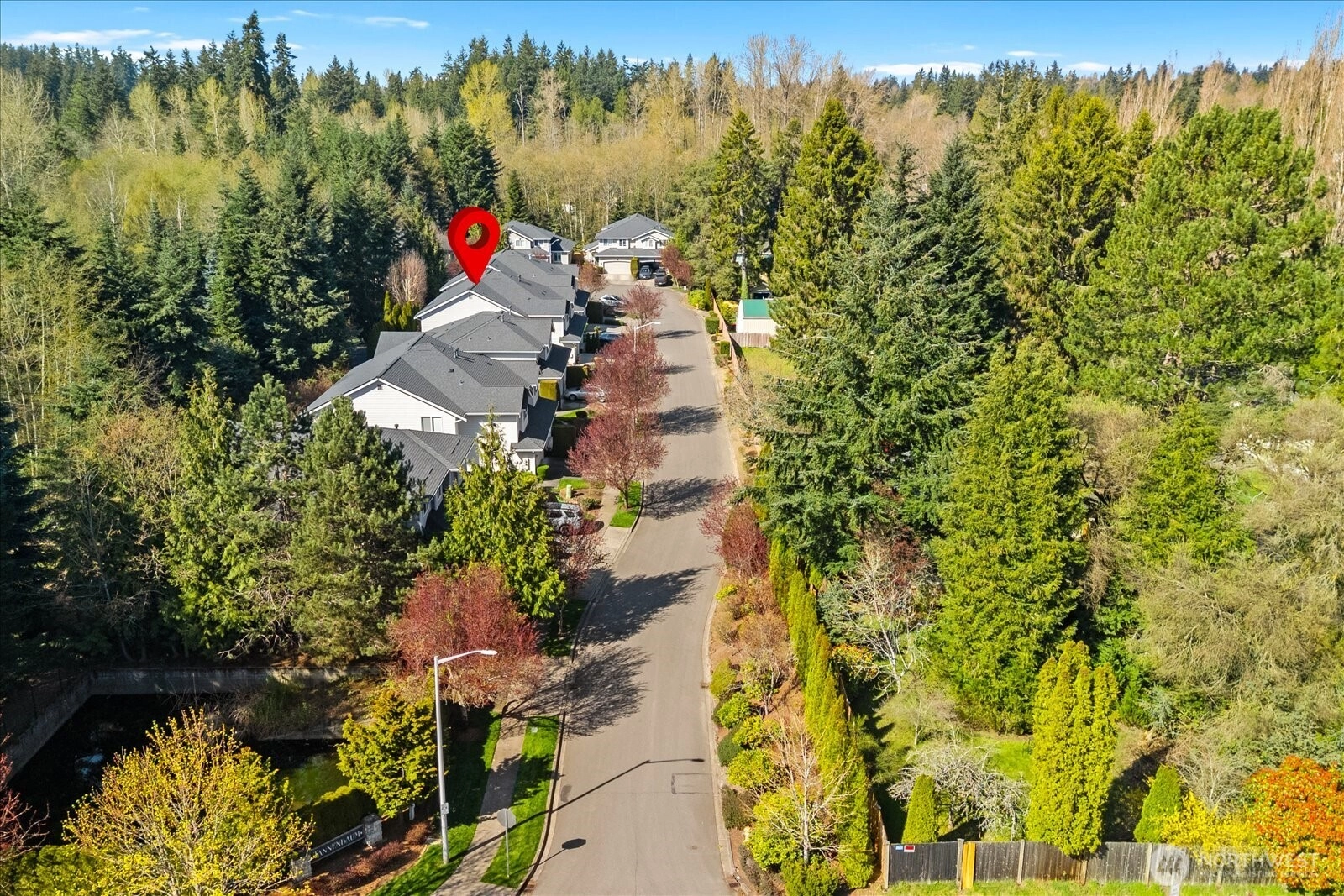 Discover refined comfort in this beautifully maintained three-bedroom townhome in Edmonds, designed to live like a detached two-story residence. Tucked toward the end of a quiet cul-de-sac and surrounded by mature trees, Tannenbaum is an intimate enclave of just 16 duplex-style homes bordering a serene greenbelt. Thoughtfully designed interiors are filled with natural light. The inviting living room showcases soaring ceilings, expansive windows, and a cozy electric fireplace—creating a warm yet airy gathering space. The main level also features a dining area, convenient utility room, and powder bath for effortless everyday living. Upstairs, you’ll find three spacious bedrooms, including a well-appointed primary suite, along with two full bathrooms and abundant storage throughout. Step outside to a fully fenced backyard retreat with a grassy area and patio—ideal for relaxing, entertaining, or enjoying the peaceful natural surroundings. Residents enjoy direct access to nearby nature trails, enhancing the sense of tranquility. The HOA provides exterior maintenance, lawn service, water, and sewer, offering low-maintenance living in a private setting—just minutes from shopping, dining, and all that Edmonds has to offer.