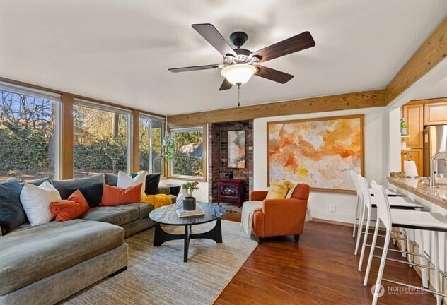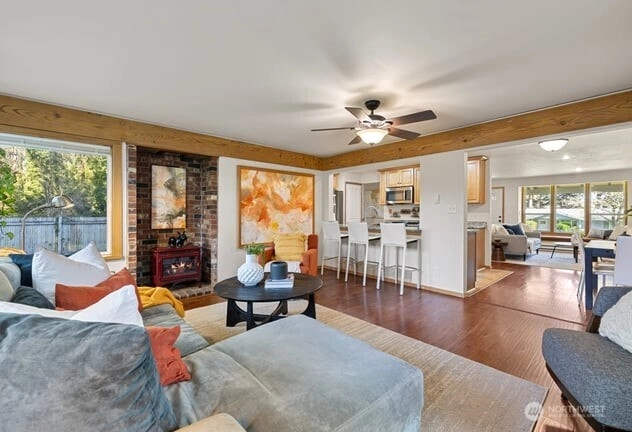 Beautifully updated 3-bedroom, 2-bath rambler nestled in one of Edmonds’ most beloved neighborhoods, just moments from the trails and shoreline of Meadowdale Beach Park. Easy one-floor living with thoughtful upgrades throughout. The heart of the home is a stunning remodeled kitchen featuring modern cabinetry, updated countertops, and stainless appliances — seamlessly flowing into a light-filled extended living room bathed in natural light, perfect for everyday relaxing and entertaining alike. Skylights in the spacious primary suite create a serene, airy retreat, complemented by a beautifully appointed ensuite bath. A second fully updated bathrooms serves guests and family with equal style. Step outside to your own private sanctuary — a large fully fenced yard with a patio ideal for outdoor dining and entertaining, warm hot tub, level garden beds ready for your green thumb, and established fruit trees including apple, pear, and plum that reward you season after season. Then venture beyond the gate to Meadowdale Beach Park’s forested trails, picnic areas, and Puget Sound beach access just moments away. All this, with the convenience of single-level living and move-in ready finishes throughout. New Heat Pump and AC lower your utility costs and keep home cozy in every season. Close to shopping, freeways & lightrail. Welcome home!