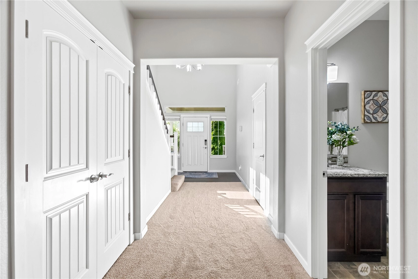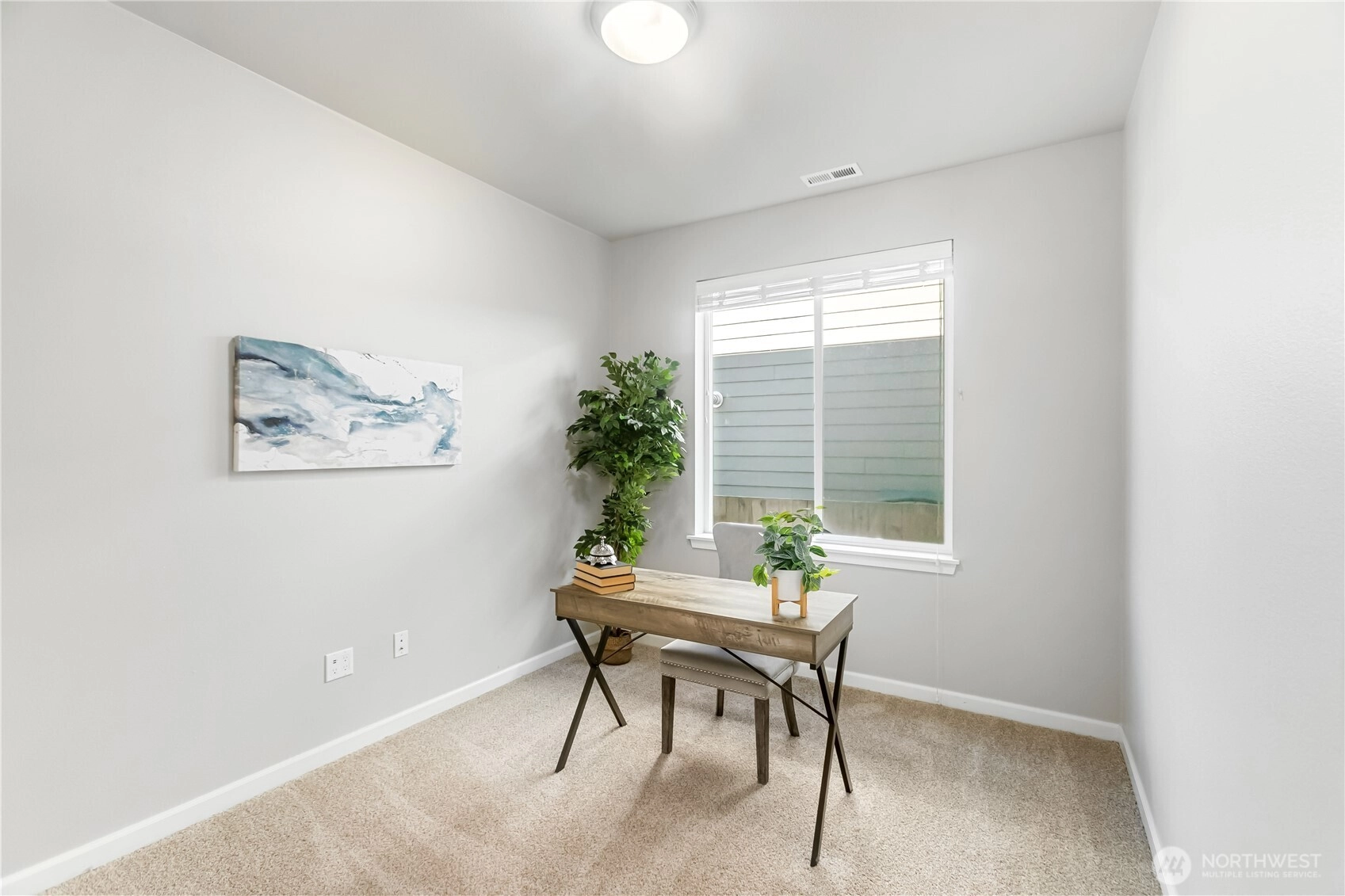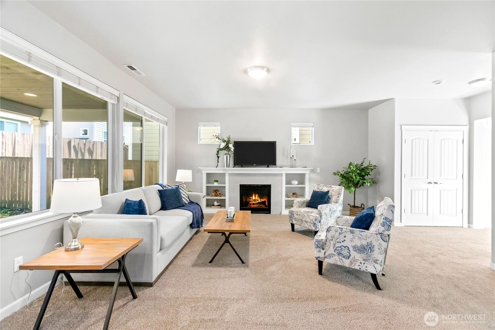 Welcome to the highly sought-after Freestone at Bayside! This beautifully maintained 4-bedroom home shines with brand-new carpets and an impressive vaulted entry that floods the space with natural light. The functional open floor plan is anchored by a cozy gas fireplace with elegant custom built-ins, perfect for gatherings. A versatile main-level den offers the ideal setup for a home office or guest space. Upstairs, discover a flexible loft and a spacious primary suite featuring a large walk-in closet and en-suite bath. Modern essentials include a tankless water heater and a dedicated laundry room. Step outside to your private, fully fenced yard and covered patio—perfect for year-round entertaining. Conveniently located near local parks, golf, highways, and easy commuting routes to nearby bases and ferries.