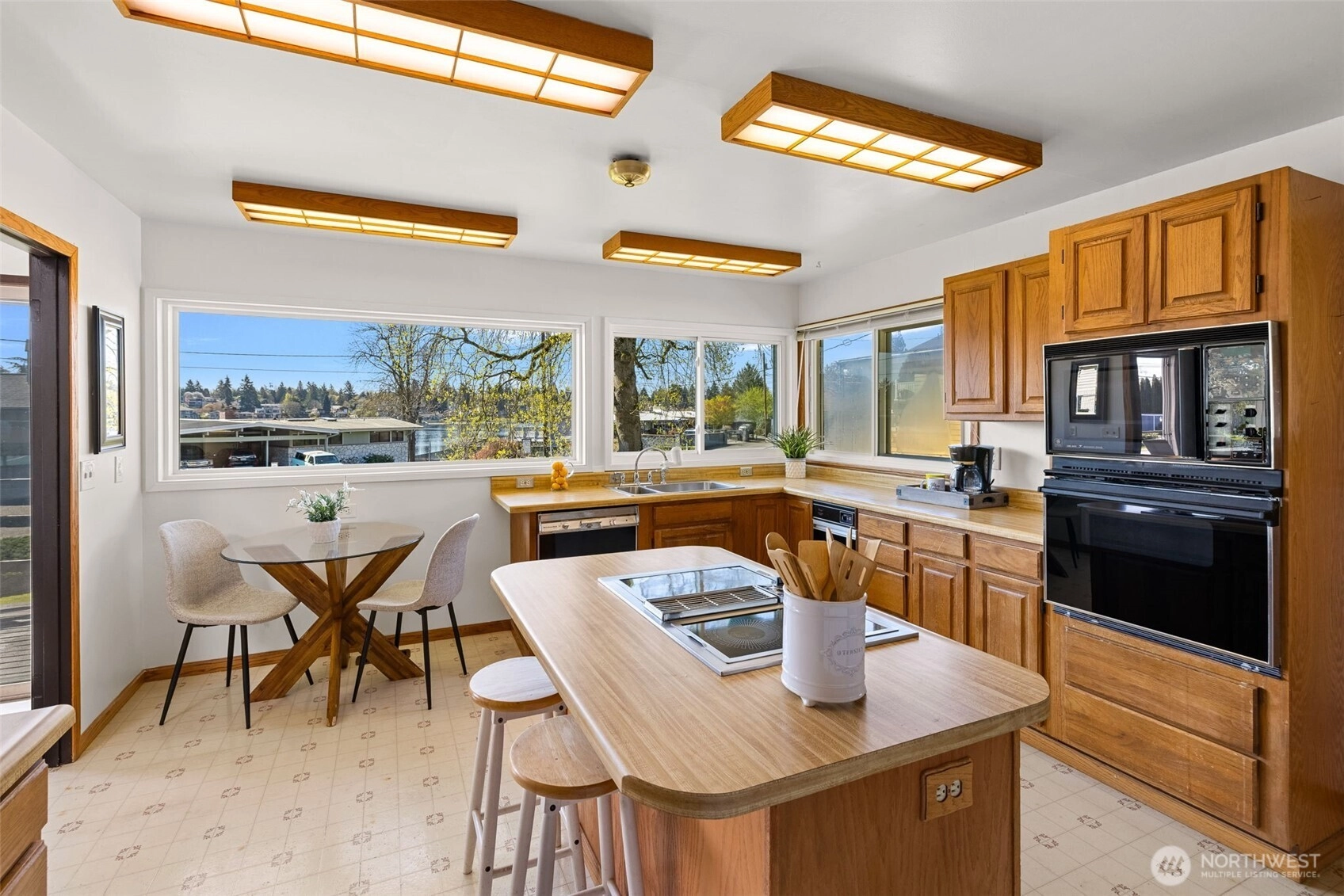 Here is a rare opportunity to live in the desirable Angle Lake neighborhood. Welcome to this 4-bedroom, 3000+ sq ft home that sits on a beautiful corner lot across the street from the private community beach on Angle Lake. You will be front and center for so many fun times at the lake! This home has a fabulous entertaining space, with a spacious Living Room featuring a wall of windows to capture the sunlight and lake view. The Living room opens up to the wrap-around deck with a Southern exposure. There is also a wood-burning fireplace, a skylight, and vaulted ceilings. The kitchen is spacious with plenty of counter space and windows. It also has a kitchen island and a breakfast nook that has a view of the lake. The Primary Bedroom is large and includes a 3/4 bathroom. Downstairs is the perfect party place! The rec room that has a huge retro-style bar, wood-burning fireplace, and tons of space!! Excellent floor plan with 3 bedrooms on the main floor and 1 downstairs. There is also a ton of storage in this home. This location is minutes to the airport, freeway access, shopping, and restaurants, yet it has a lovely, peaceful feeling that comes with living near the lake.