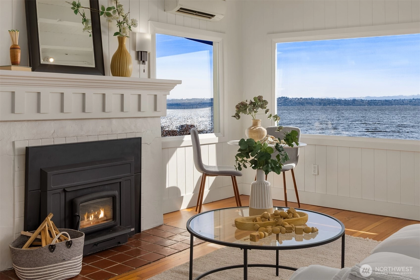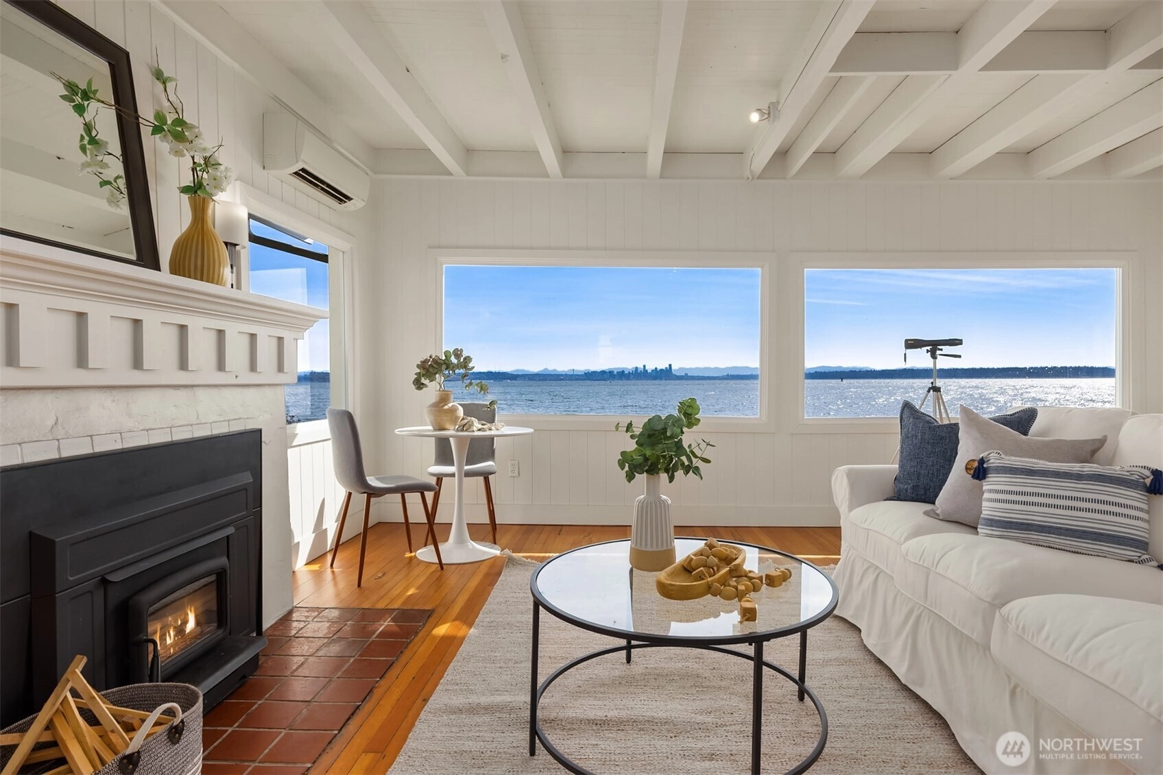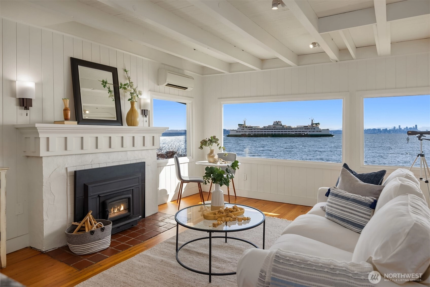 Experience breathtaking waterfront living in this charming Craftsman, where sweeping views, daily wildlife sightings, and ever-changing scenery create a truly unforgettable setting. Nestled at the water’s edge, this inviting cottage captures panoramic 180-degree views stretching from Mt. Baker to Mt. Rainier, with Eagle Harbor and the Seattle skyline beautifully framed across the water. Inside, timeless character meets thoughtful updates. This 3-bedroom, 1.75-bath home features remodeled laundry and office spaces, new carpeting, integrated heating and cooling for year-round comfort, and convenient sewer access. The kitchen flows seamlessly into the living area, where a cozy wood-burning fireplace insert, exposed beam ceilings, and expansive windows showcase the stunning surroundings. Outdoor living is exceptional, offering multiple spaces to relax and entertain — including a covered porch, beachside deck, upstairs balcony, and a rooftop deck with incredible vantage points. Enjoy front-row views of ferries gliding by and the shimmering Seattle skyline, day and night. Ideally located near walking trails and public parks, this home offers both tranquility and access to outdoor recreation. A rare opportunity to own a piece of waterfront charm you’ll never want to leave. Co-agent is the homeowner.