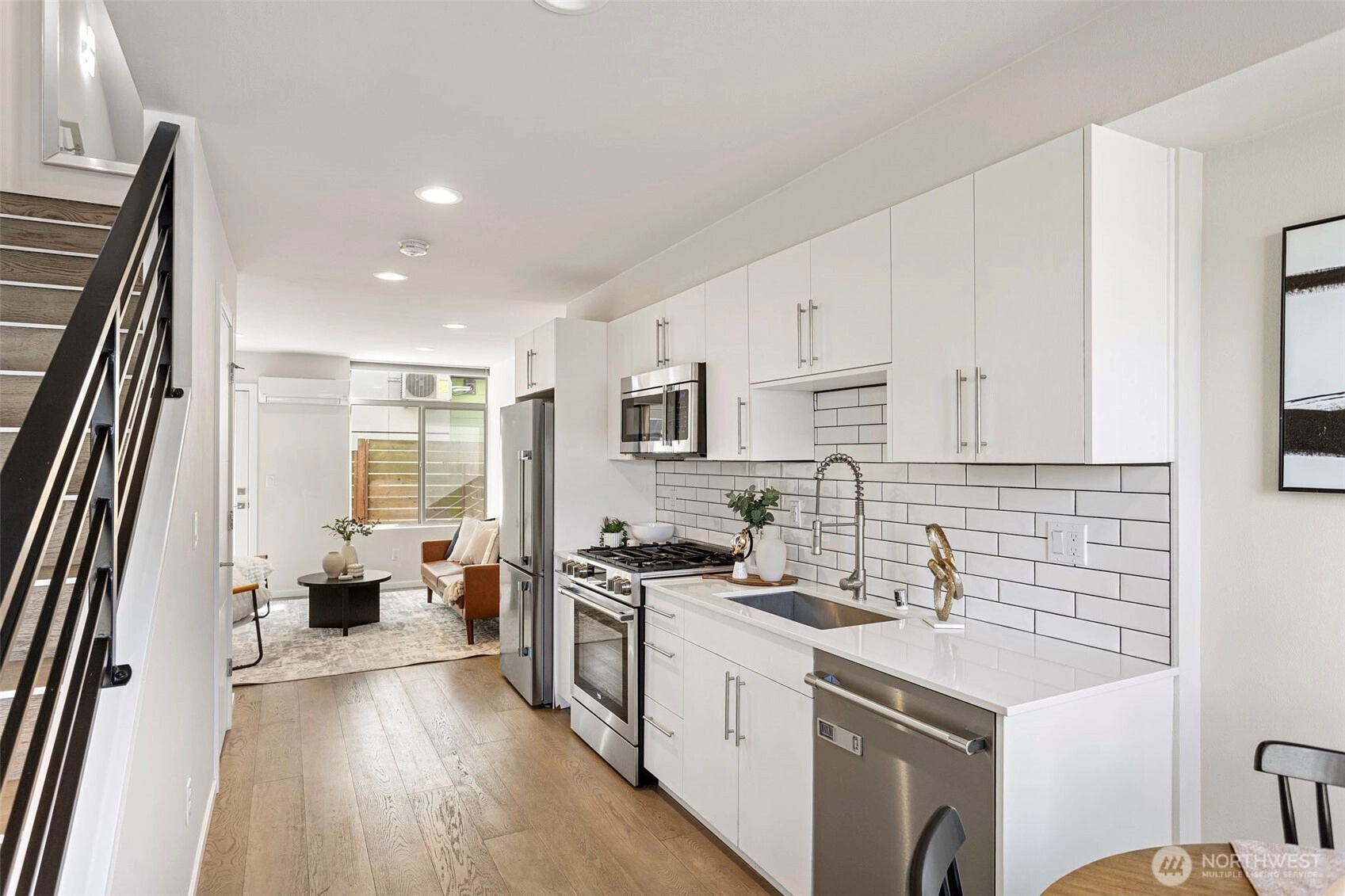 Like new high-quality townhouse community featuring modern, European-inspired architecture. The home offers a well-sized kitchen that flows into a warm and inviting living space. On the second floor, you'll find a bright bedroom filled with natural light, along with a laundry room and a full bathroom conveniently located down the hall. The third floor includes a perfect work-from-home setup, complete with a full bathroom and walk-in closet. Quality finishes include quartz countertops, stainless steel appliances, and gas cooking. Double-insulated windows provide added peace and comfort, while mini-split systems are installed throughout the home. Enjoy a rooftop deck with scenic views, all in a prime location close to transit, schools, restaurants, and shopping. NO HOA, NO RENTAL CAP!