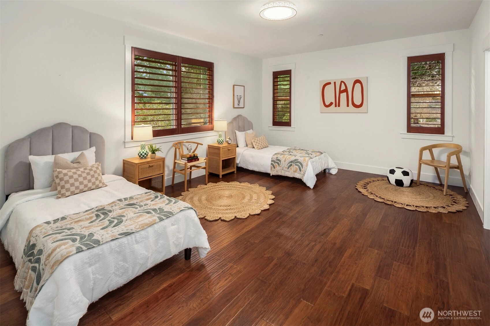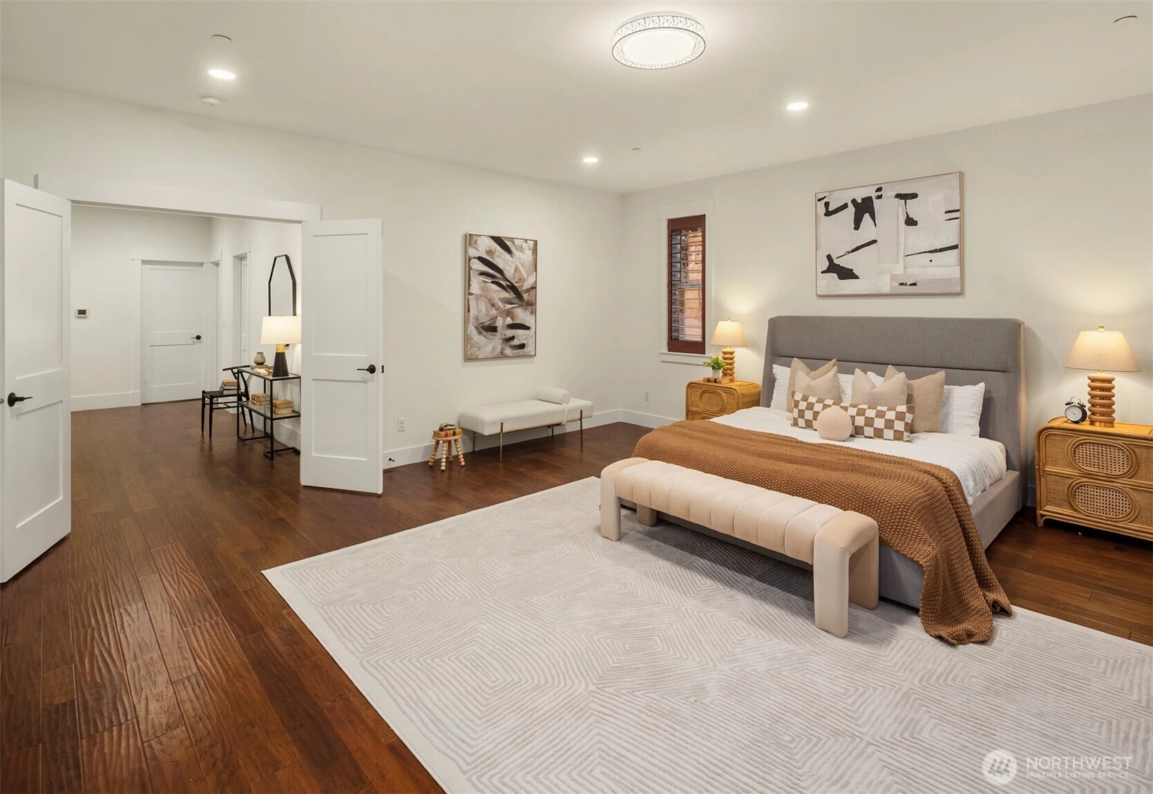 5,070 SF of luxury living across 2 spacious levels, highlighted by a rare and highly desirable primary suite on the main floor. This stunning residence offers exceptional scale, comfort, and flexibility for modern living. Perfectly located minutes from Factoria Mall, Bellevue Square, parks, dining, Bellevue Light Rail, & major tech campuses including Microsoft, Meta, & T-Mobile, in one of Bellevue’s most desirable Nbrhd with award-winning schools. Wide neighborhood streets provide plenty of parking for guests, making entertaining effortless. 5 expansive bedrooms feature large walk-in closets, including 2 luxurious primary suites with the main-level primary offering ultimate convenience & privacy, both with spa-inspired five-piece baths. Soaring 10-ft ceilings, a private office, and dual fireplaces elevate the home’s elegant design. The chef’s kitchen with Sub-Zero & Wolf appliances flows into an impressive entertainment lounge with Hestan grill and pool table, ideal for karaoke nights, large gatherings, and unforgettable parties. An 18’ pocket door opens seamlessly to the patio and lighted sports court, creating effortless indoor-outdoor entertaining. Upstairs features a projector screen theater setup perfect for movie nights and game-day viewing. The 2-car garage with an impressive 18-ft wide garage door offers easy access and generous space, and includes a heated dance/fitness studio with epoxy floors & wall mirrors. Perfect for luxury, comfort, location, & entertaining.