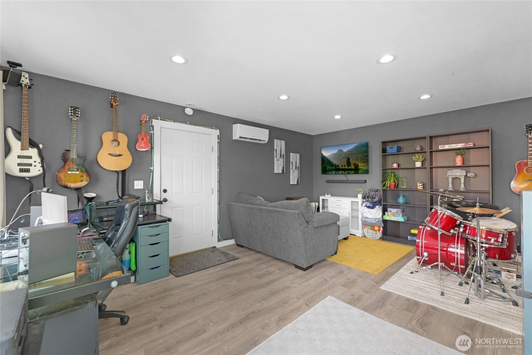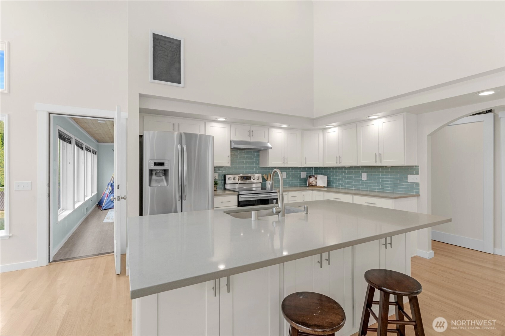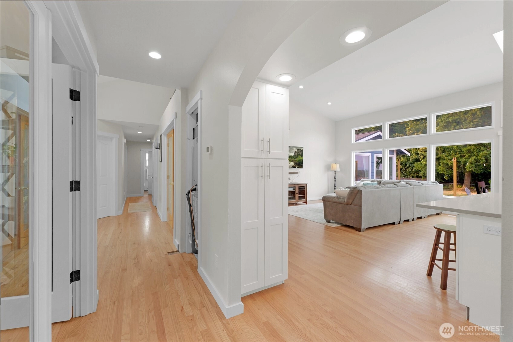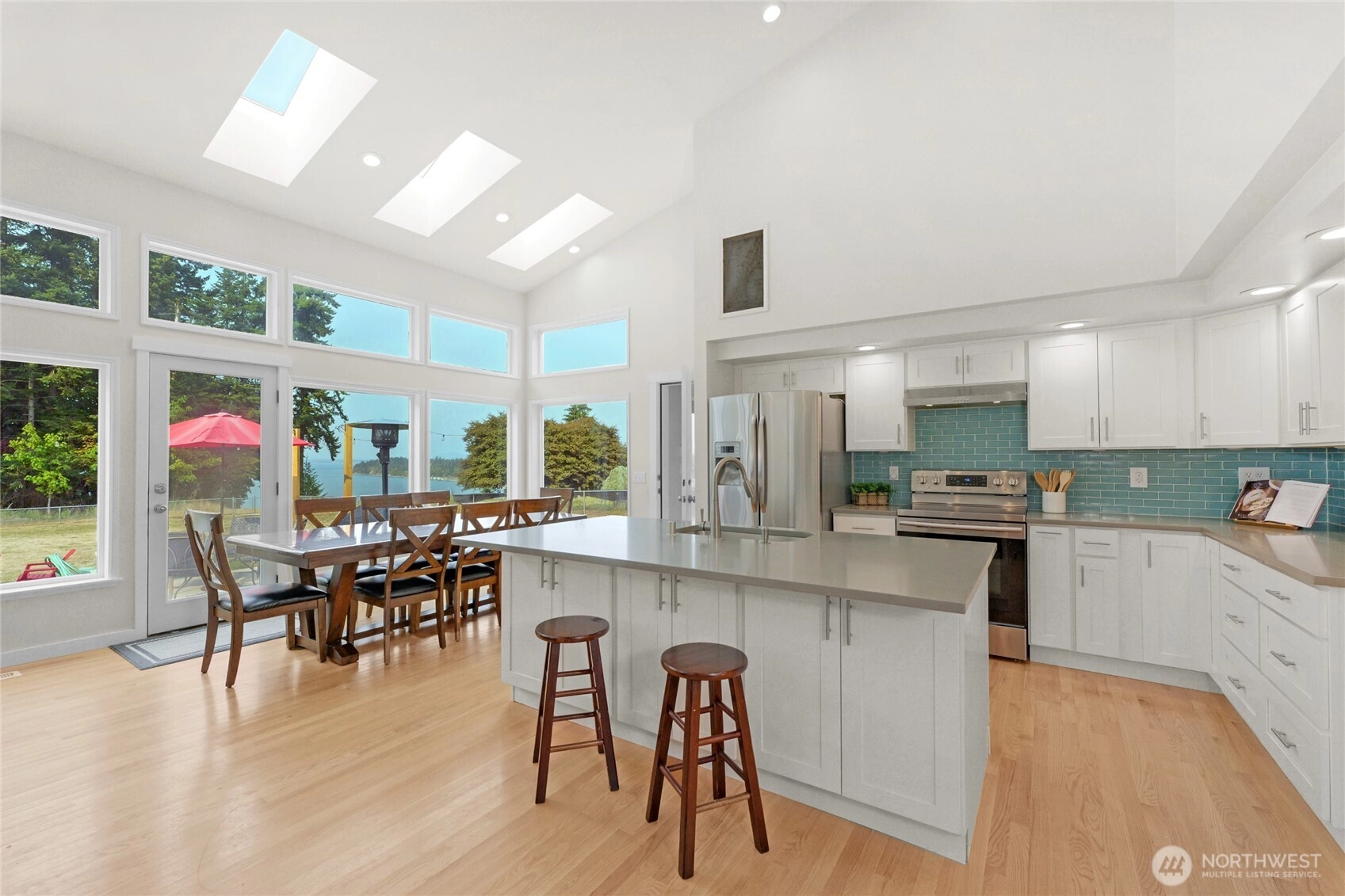 Tucked in the quiet coastal community of Utsalady Heights on Camano Island, this beautifully remodeled rambler offers the perfect blend of comfort, light, and scenery. Enjoy stunning views of Mt. Baker and Utsalady Bay from this light-filled home, where skylights and a wall of windows along the back bring the outdoors in.Set on a fully fenced, level lot, the open-concept layout features a thoughtfully redesigned kitchen (2020) with new cabinets, quartz counters, stainless steel appliances, and LED lighting, plus refinished hardwoods and new flooring throughout. Recent upgrades include a new furnace & heat pump (YES A/C), interior/exterior paint, garage doors, electrical panel, and standby generator.Offering 3 bedrooms, 1.75 baths, an office, and a flexible bonus room/4th bedroom, plus a 300 sq ft attached ADU (2023), there’s space for everyone. The spacious primary bedroom includes two separate closets, a 4-piece on-suite featuring granite countertops, water closet, beautiful tile shower with a skylight providing natural light. The 3-car garage includes built-in shelving and a workspace, and there’s abundant attic storage. Start your day on the back patio with peaceful mornings, birdsong, and fresh coastal air.Located on the north end of the island, just minutes to Utsalady Point Beach, with a paved walking trail across the street, nearby hiking trails, two state parks, and a grocery store and restaurants all within 10 minutes.
