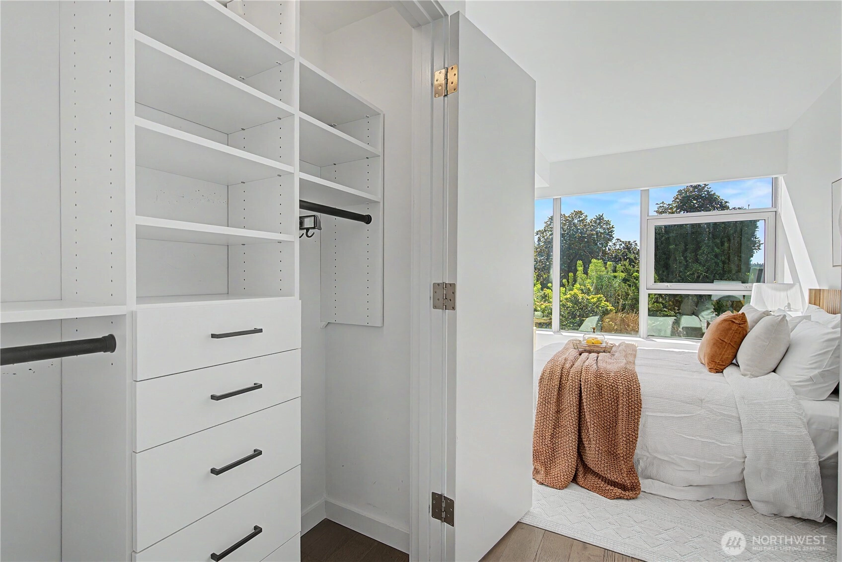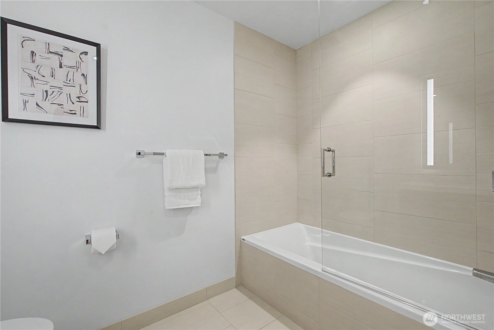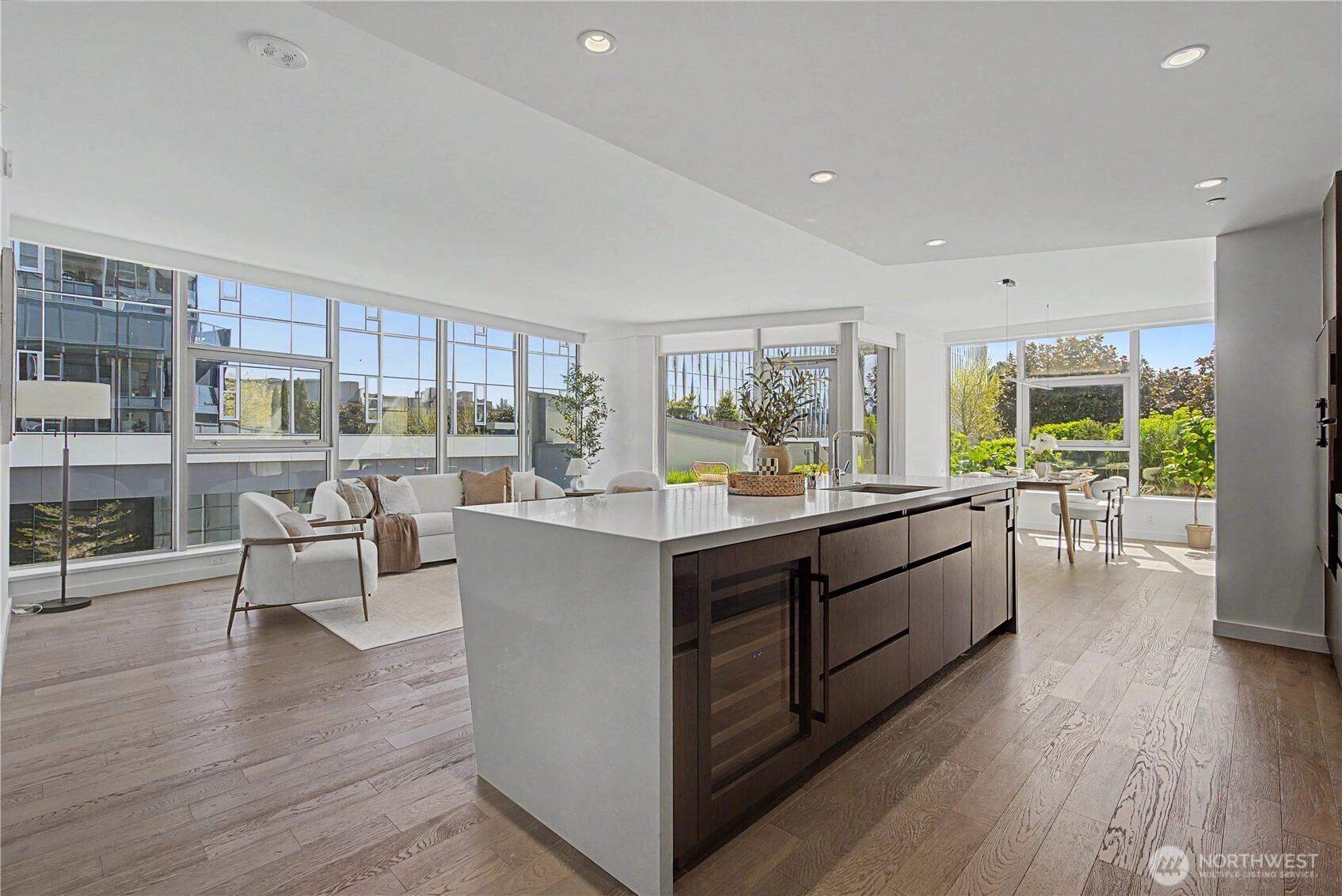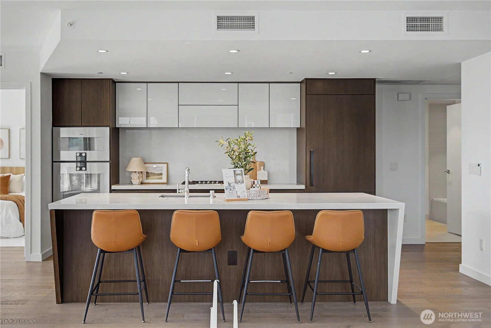 A rare opportunity at One88—this southeast corner 2-bedroom, 2-bath residence in mint condition stands out with an oversized private patio that opens directly to the building’s landscaped garden terrace and the community BBQ area, creating a true indoor-outdoor living experience rarely found in high-rise living. Floor-to-ceiling windows bring in abundant natural light & frame peaceful garden views, offering a quiet retreat in the center of DT Bellevue. The Open concept/great room layout is thoughtfully designed for both everyday living and entertaining, featuring a stunning Chef's kitchen w/sleek Gaggenau stainless appliances, custom cabinetry w/ soft close, modern finishes and a striking waterfall island. The primary suite offers a spa-inspired 5- piece bath, dual custom closets w/built-ins and generous storage, while the second bedroom provides flexibility for guests/Den. Motorized window shades w/3 zones. The elegant dining room w/designer's LED light fixture. Side by side laundry room w/ ample shelves/storage. The second elevator is a few steps away, like your own, taking you directly to parking. Residents enjoy a full suite of luxury amenities:24/7 concierge, indoor pool, spa, sauna & steam rooms, fitness center, yoga studio, golf simulator, private dining room & beautifully designed outdoor areas. Located just steps from Bellevue Square, fine dining, and everyday conveniences. Includes secured parking and dedicated storage. Excellent schools! Pet friendly!