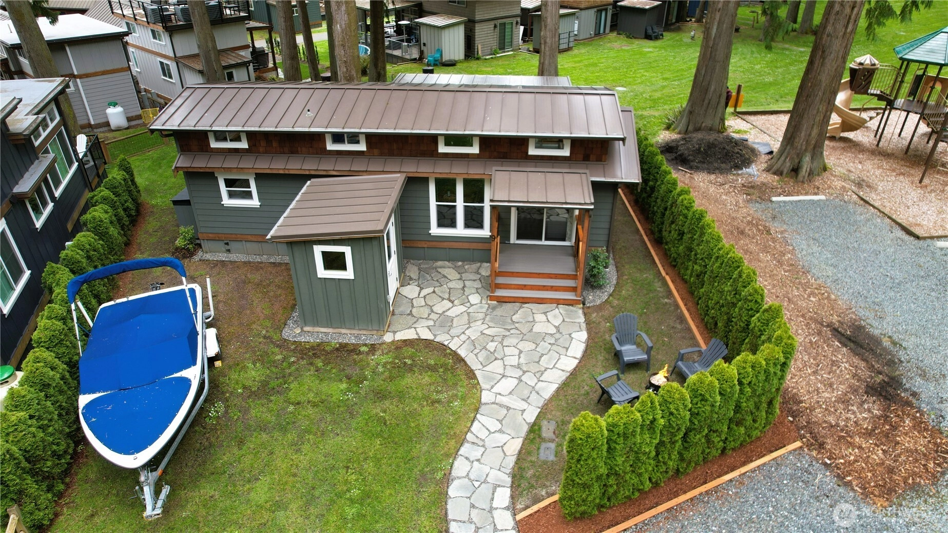 The largest lot in Wildwood offers a rare park-like setting designed for lake living at its best. With extra breathing room, mature landscaping, and direct access to open green space, this property feels private yet connected to the heart of the community. Whether you're hosting summer gatherings or enjoying a quiet weekend retreat, this is the place where memories are made. Inside, you’ll love the thoughtful layout featuring a king-sized primary sleeping area, split loft for guests, abundant natural light, and seamless flow that maximizes comfort and functionality. Large windows bring the outdoors in, creating a bright and welcoming atmosphere after a full day on the lake. Step outside to the expansive 12x20 covered deck — perfect for morning coffee, evening BBQs, and long board-game nights with friends. Just beyond, the common green space and playground extend your backyard, giving everyone room to play and relax. With beautiful landscaping, ample storage, and convenient boat parking, this well-appointed cottage makes lake life easy and carefree. Enjoy access to all that Wildwood and Lake Whatcom have to offer in a fun, active, and welcoming community. Check out 'Wildwood Lakefront Cottages' on Facebook, Instagram, and Youtube — see you at the lake!