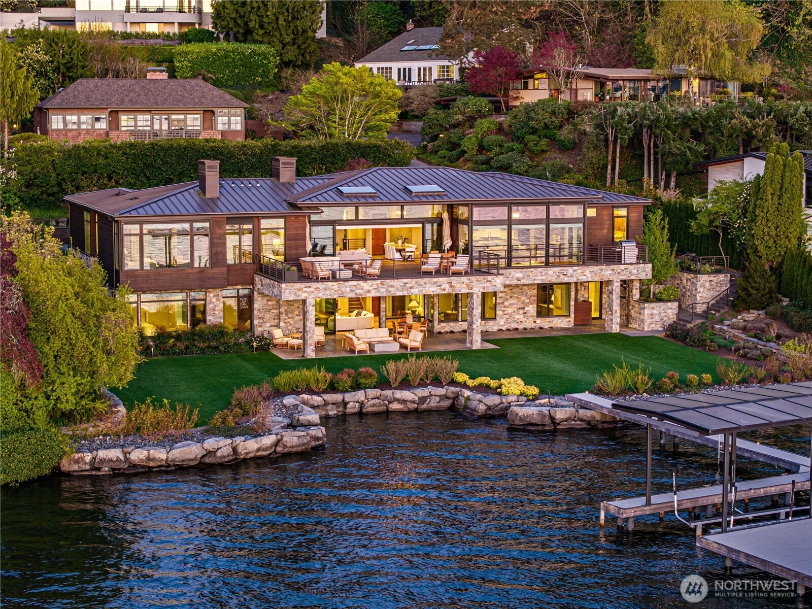 Serenity and timelessness at water’s edge. This prized position on Medina’s Gold Coast represents a once-in-a-lifetime property: 144'± of pristine, irreplaceable low-bank Lake Washington shoreline in perfect balance. Peace and understated grandeur are yours in every moment. It all began with two land parcels assembled and combined for a flat, shy half-acre lot with direct, step-in lake access and an expansive private dock so perfectly close to the homesite. The residence was then carefully curated with vision: a forever, age-in-place home, fusing modern Northwest design & timeless luxury, where light, views and water are woven deeply into daily life and priceless gatherings. The result: a refined residence blending organic materials and contemporary design with seamless indoor-outdoor flow. Impressive walls of west-facing glass capture every breathtaking sunset, the glittering Seattle skyline and the snow-capped Olympic Mountains beyond. Peaceful, private, and perfectly positioned between the bridges. Lakefront living, redefined.