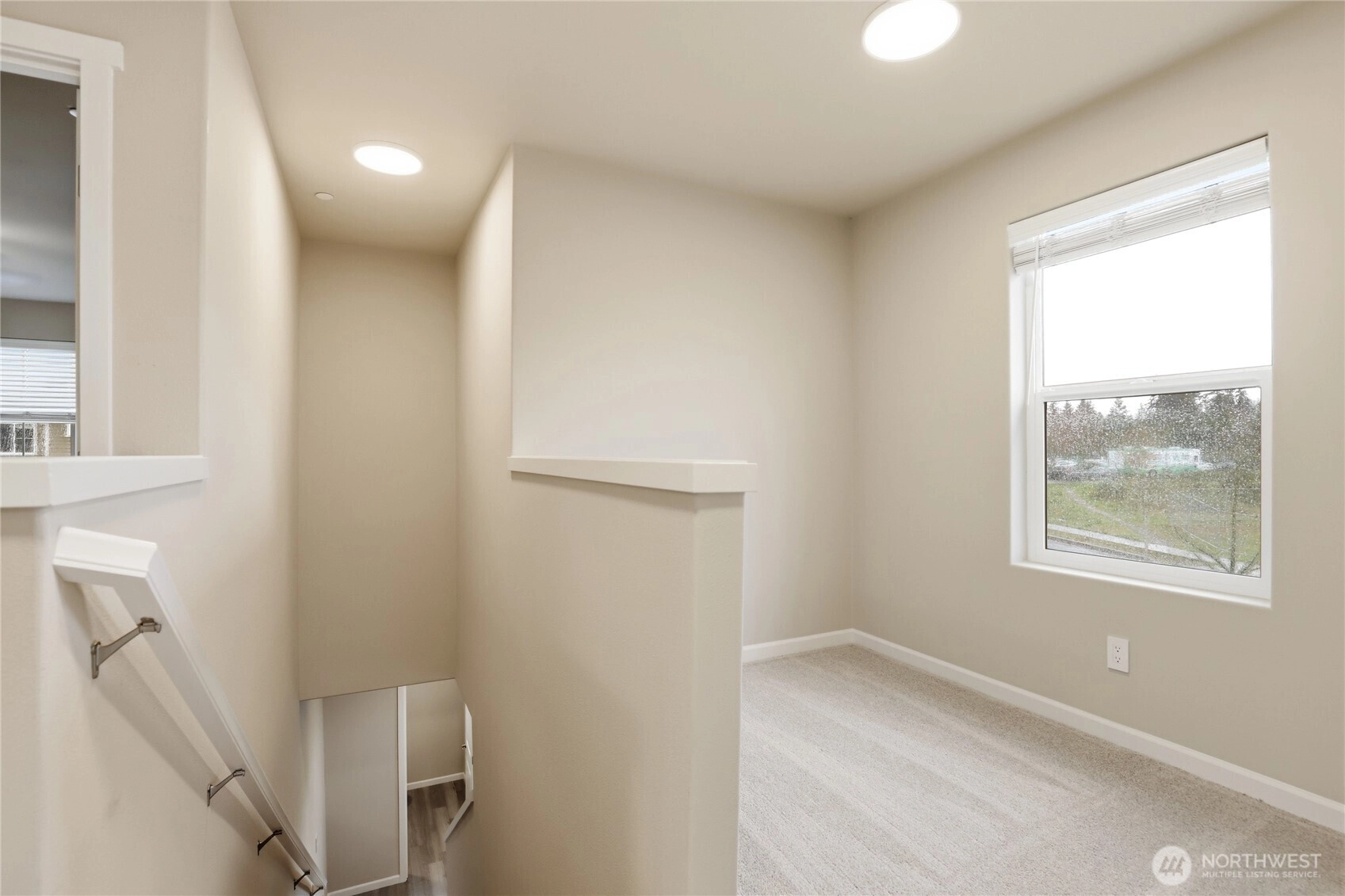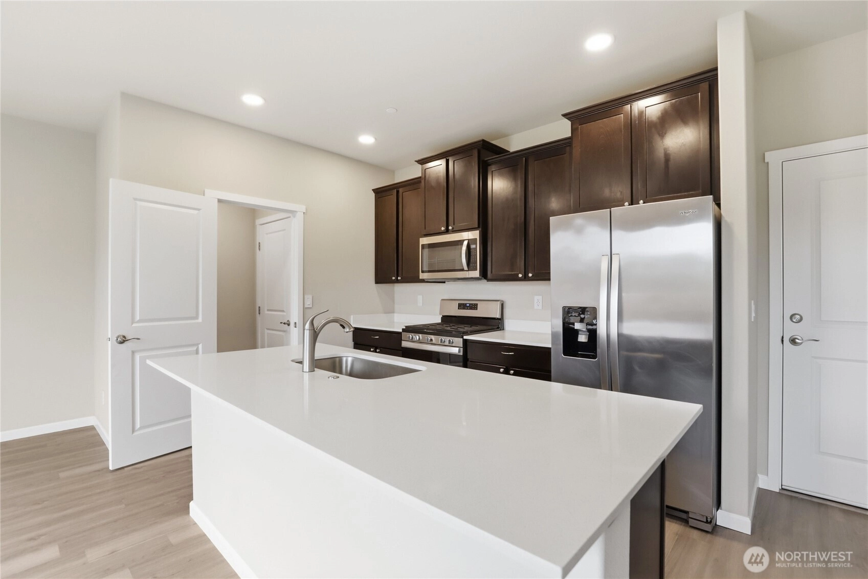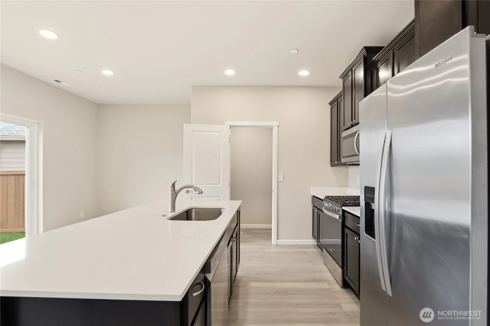 Step inside this beautifully refreshed 4-bedroom, 2.5-bathroom home on a corner lot and discover the perfect setting for effortless entertaining and everyday living. The bright, open-concept living and dining areas flow seamlessly into a stunning kitchen featuring quartz countertops, soaring 42-inch cabinets, and premium stainless steel appliances — ideal for hosting friends or quiet dinners. Upstairs, the spacious primary suite offers a true retreat with a sprawling bedroom, enormous walk-in closet, and a luxurious ensuite bath complete with a deep soaker tub, step-in shower, and elegant vanity. Three additional bedrooms plus a versatile flex loft provide ample space for everyone to spread out. Freshly painted throughout with all-new luxury vinyl plank flooring downstairs, brand-new carpet on the stairs and upstairs, updated fixtures, new doors, and all-new toilets in the bathrooms — this home has been thoughtfully refreshed from top to bottom and is truly move-in ready. An irrigation system in both the front and back yards adds ease and convenience to maintaining the beautifully landscaped outdoor spaces.