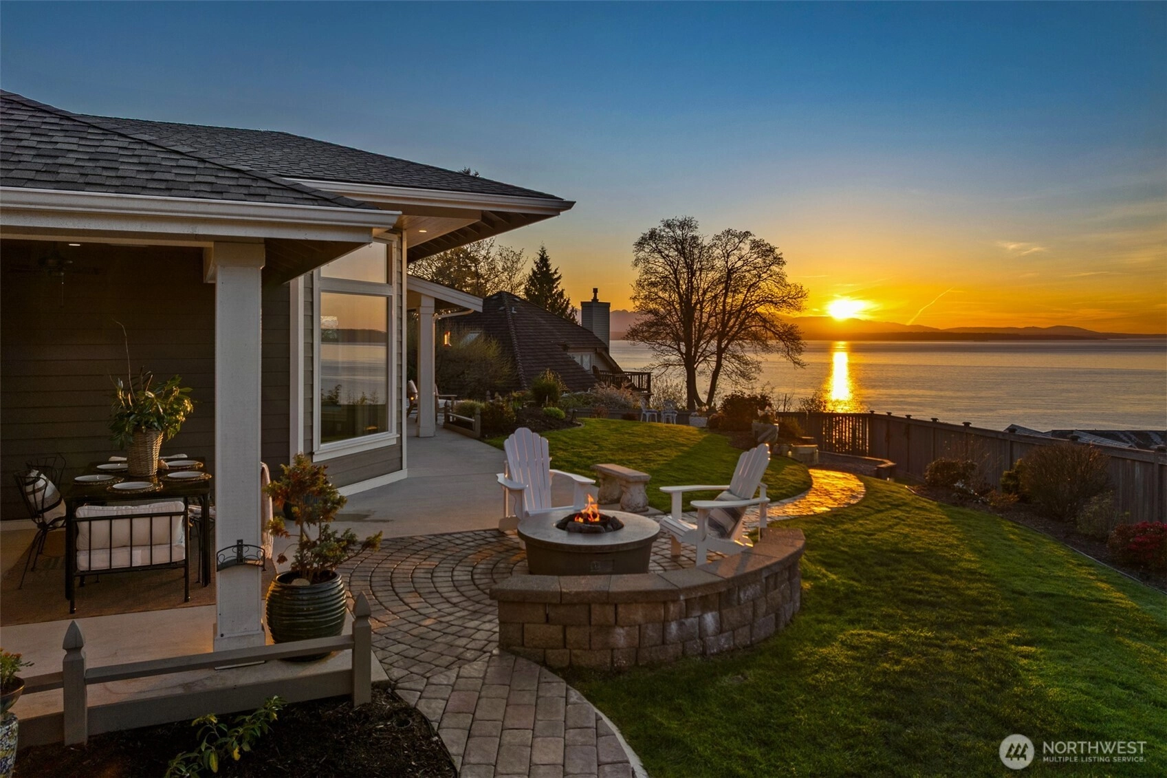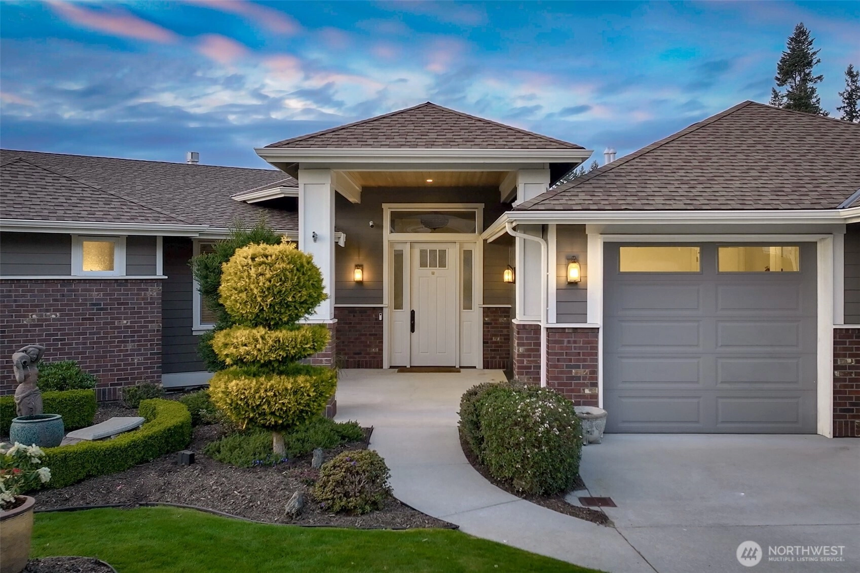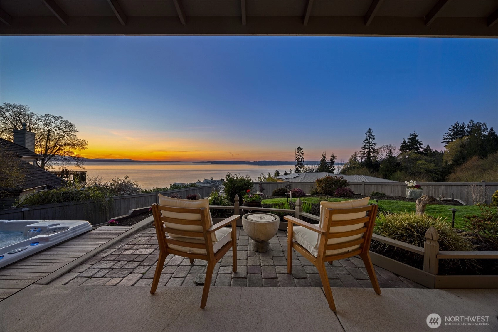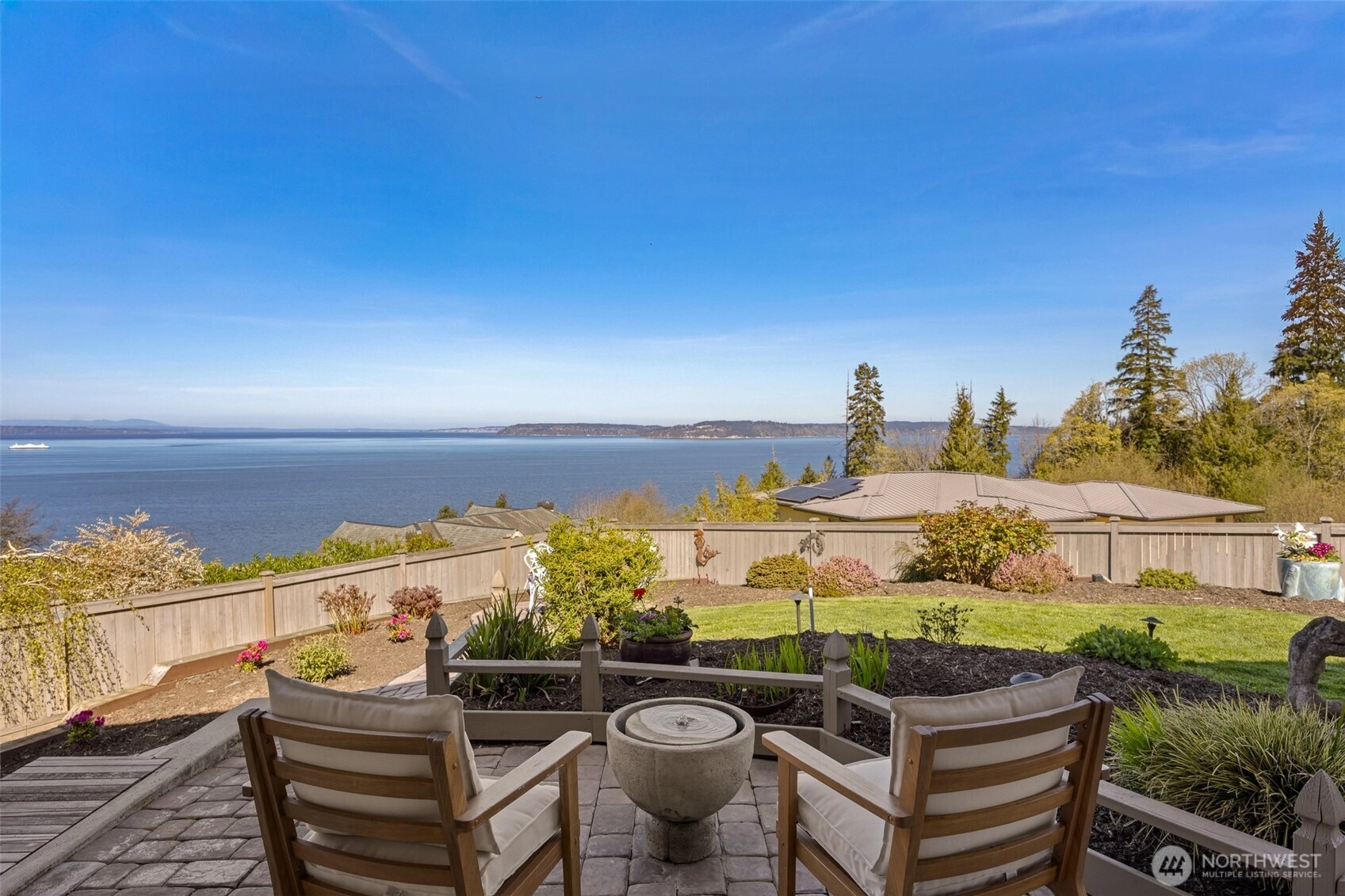 Like new, custom-built rambler by local architect Nash & Assoc. with intricate design & attention to detail across a single level, this one is the crown jewel. Tucked at the end of a quiet cul-de-sac & positioned to maximize year-round westerly panoramas, you'll be transported away from the noise of the world upon arrival. An elegant porte-cochère surrounded by lush plantings & a fountain leads you into the entry, immediately greeting you with a wall of windows framing unobstructed views (no power lines) of the Puget Sound, Kitsap Peninsula & Whidbey. Sophistication & functionality blend seamlessly throughout the stairs-free layout: white oak floors, fresh paint & 12' ceilings accentuate living areas that extend effortlessly outside onto covered view decks for true indoor-outdoor living all year. A magazine-worthy kitchen delivers a luxe cooking & hosting experience w/ butler's pantry, granite counters, high-end appliances, soft-close cabinets, smart storage & gas cooking, all anchored by a spacious center island w/ bar seating. 3 generous bedrooms include a primary retreat w/ its own private deck & sunken hot tub, walk-in closet & spa-like ensuite. Designed w/ efficiency, comfort & convenience in mind: built-in speakers, tankless water heater, A/C, generator, CAT5 wiring & smart Lutron lighting. Garden beds, a gas fire pit & fully fenced yard await your summer hobbies. The ideal location for those who value privacy & prestige, yet moments from all that Edmonds has to offer.