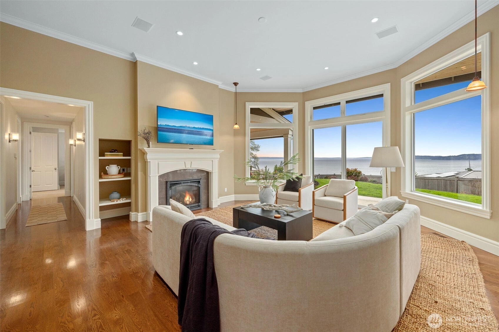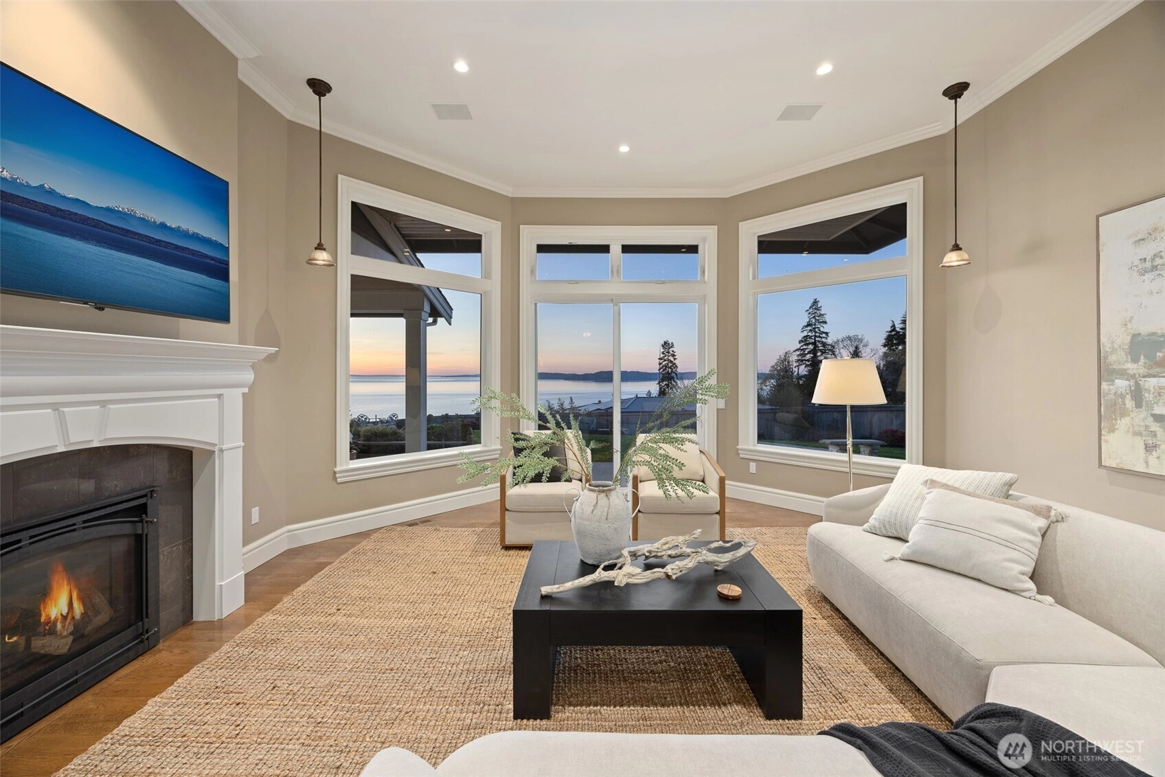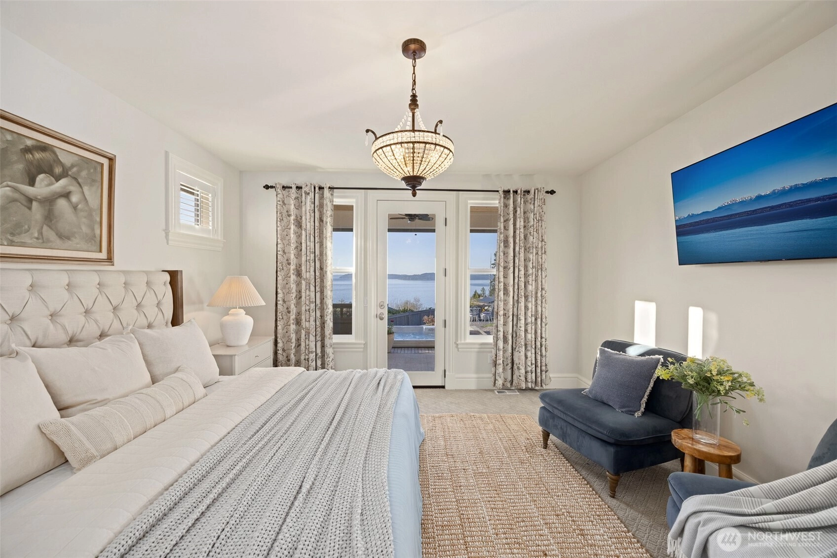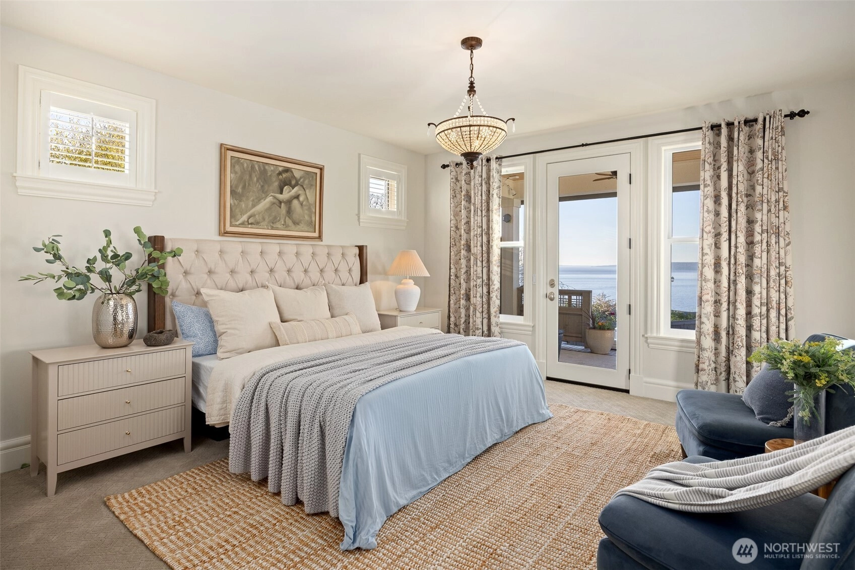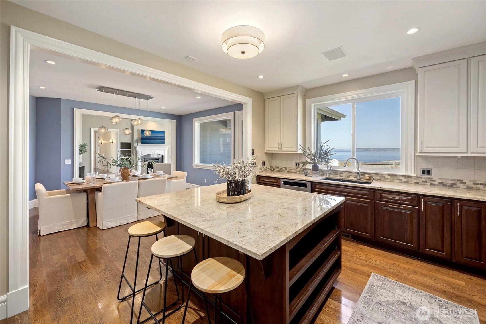 Like new, custom-built rambler by local architect Nash & Assoc. with intricate design & attention to detail across a single level, this one is the crown jewel. Tucked at the end of a quiet cul-de-sac & positioned to maximize year-round westerly panoramas, you'll be transported away from the noise of the world upon arrival. An elegant porte-cochère surrounded by lush plantings & a fountain leads you into the entry, immediately greeting you with a wall of windows framing unobstructed views (no power lines) of the Puget Sound, Kitsap Peninsula & Whidbey. Sophistication & functionality blend seamlessly throughout the stairs-free layout: white oak floors, fresh paint & 12' ceilings accentuate living areas that extend effortlessly outside onto covered view decks for true indoor-outdoor living all year. A magazine-worthy kitchen delivers a luxe cooking & hosting experience w/ butler's pantry, granite counters, high-end appliances, soft-close cabinets, smart storage & gas cooking, all anchored by a spacious center island w/ bar seating. 3 generous bedrooms include a primary retreat w/ its own private deck & sunken hot tub, walk-in closet & spa-like ensuite. Designed w/ efficiency, comfort & convenience in mind: built-in speakers, tankless water heater, A/C, generator, CAT5 wiring & smart Lutron lighting. Garden beds, a gas fire pit & fully fenced yard await your summer hobbies. The ideal location for those who value privacy & prestige, yet moments from all that Edmonds has to offer.
