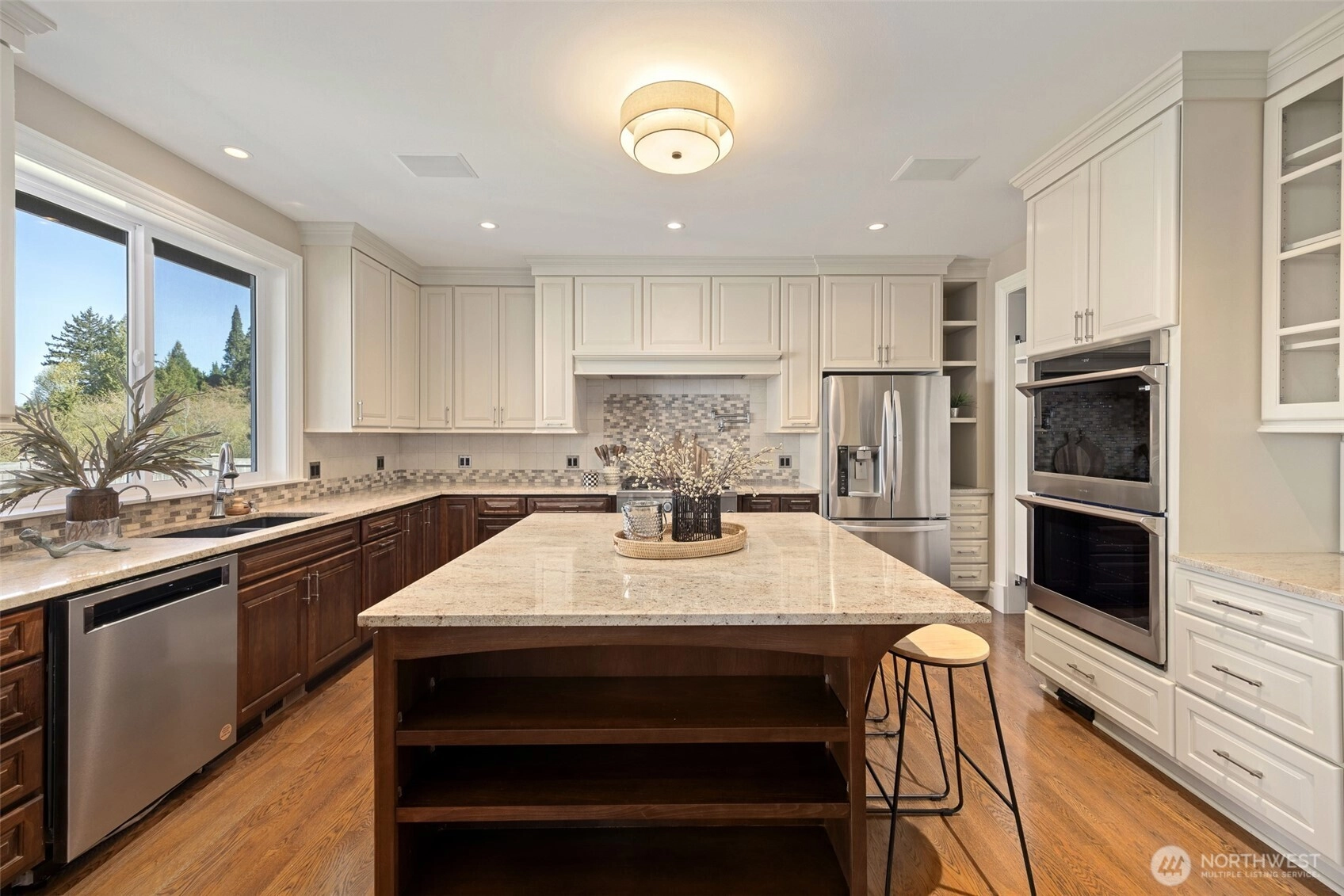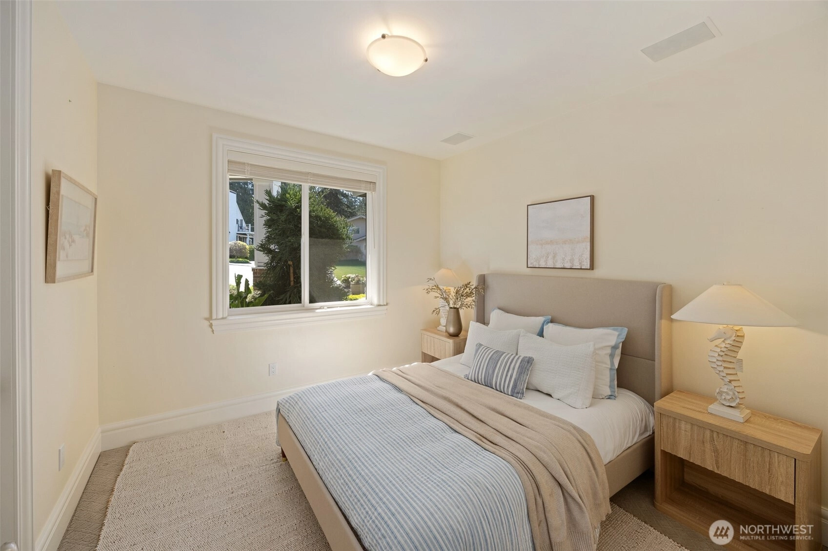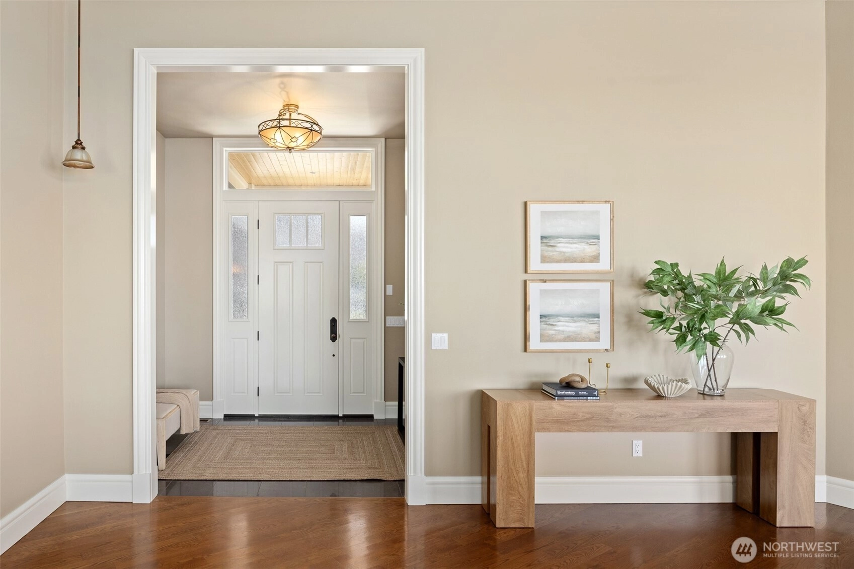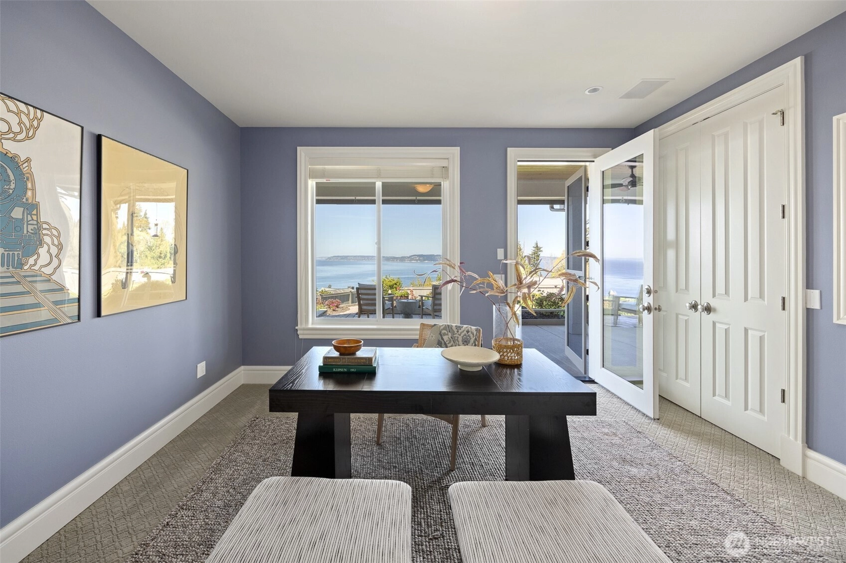 Like new, custom-built rambler by local architect Nash & Assoc. with intricate design & attention to detail across a single level, this one is the crown jewel. Tucked at the end of a quiet cul-de-sac & positioned to maximize year-round westerly panoramas, you'll be transported away from the noise of the world upon arrival. An elegant porte-cochère surrounded by lush plantings & a fountain leads you into the entry, immediately greeting you with a wall of windows framing unobstructed views (no power lines) of the Puget Sound, Kitsap Peninsula & Whidbey. Sophistication & functionality blend seamlessly throughout the stairs-free layout: white oak floors, fresh paint & 12' ceilings accentuate living areas that extend effortlessly outside onto covered view decks for true indoor-outdoor living all year. A magazine-worthy kitchen delivers a luxe cooking & hosting experience w/ butler's pantry, granite counters, high-end appliances, soft-close cabinets, smart storage & gas cooking, all anchored by a spacious center island w/ bar seating. 3 generous bedrooms include a primary retreat w/ its own private deck & sunken hot tub, walk-in closet & spa-like ensuite. Designed w/ efficiency, comfort & convenience in mind: built-in speakers, tankless water heater, A/C, generator, CAT5 wiring & smart Lutron lighting. Garden beds, a gas fire pit & fully fenced yard await your summer hobbies. The ideal location for those who value privacy & prestige, yet moments from all that Edmonds has to offer.