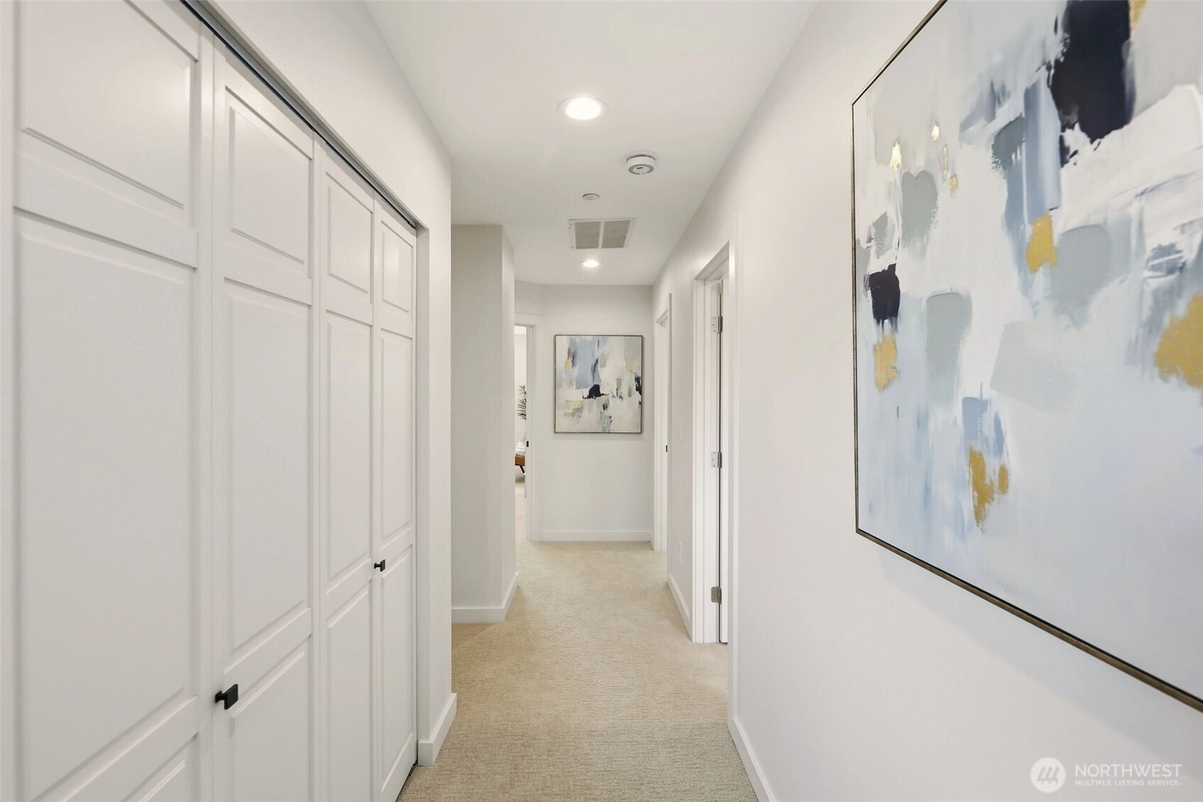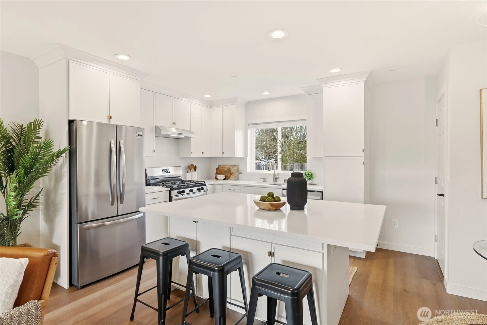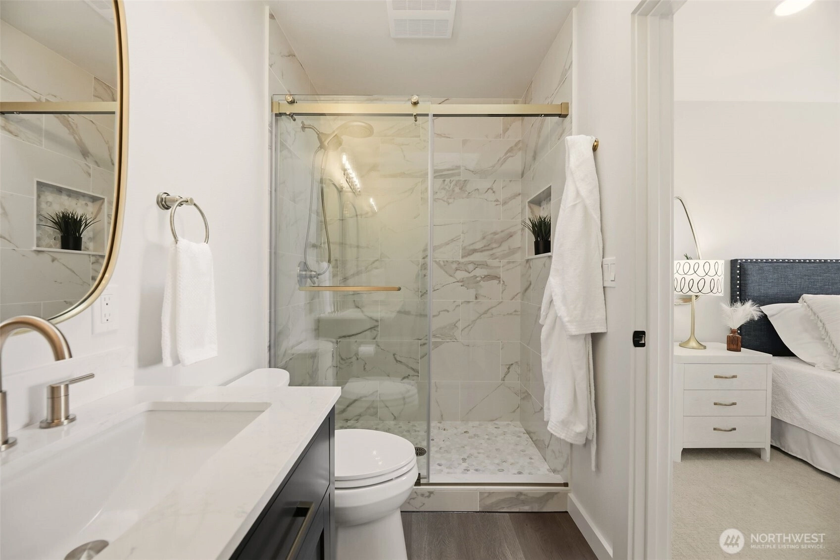 Must see in person to fully appreciate the level of renovation & setting. Exceptionally remodeled home that lives better than new—offering the privacy of a single-family home, a huge fenced yard, & no HOA or shared walls. Nearly every surface has been thoughtfully refreshed w/ quality rarely found in typical updates, including new flooring, cabinetry, doors, millwork, paint, appliances, fixtures, & extensive recessed LED lighting creating a bright, modern interior. The open kitchen features quartz countertops, a large gathering island, new appliances with warranties, & a spacious pantry. Upstairs, the primary suite offers valley views, a large closet, and a beautifully updated bath with custom tile shower. Fully remodeled additional bath with custom tile flooring and soaking tub. Step outside to a new covered outdoor living area and expansive deck overlooking the large, level fenced yard offering space, flexibility, and privacy rarely found this close to downtown. Garden beds, storage shed, and RV parking add versatility. Addl upgrades include new roof & skylights, new gutters, new furnace, A/C, new crawlspace vapor barrier, & custom window shades. Large garage with high ceilings and storage. No HOA. No monthly fees. No restrictions. Blocks to grocery, dining, and local shops with easy Eastside access to Microsoft, Amazon, Google, and SpaceX. Enjoy stunning private views across open sunflower fields to the surrounding mountains, an experience that truly sets this home apart.