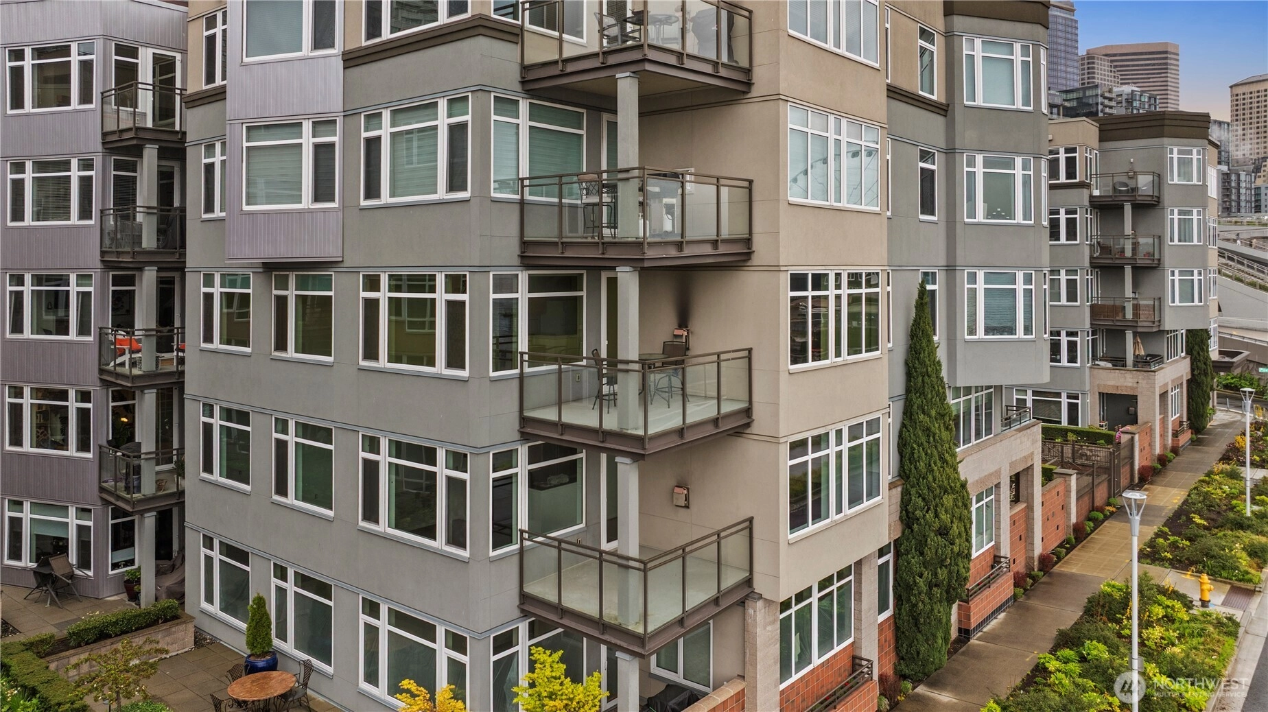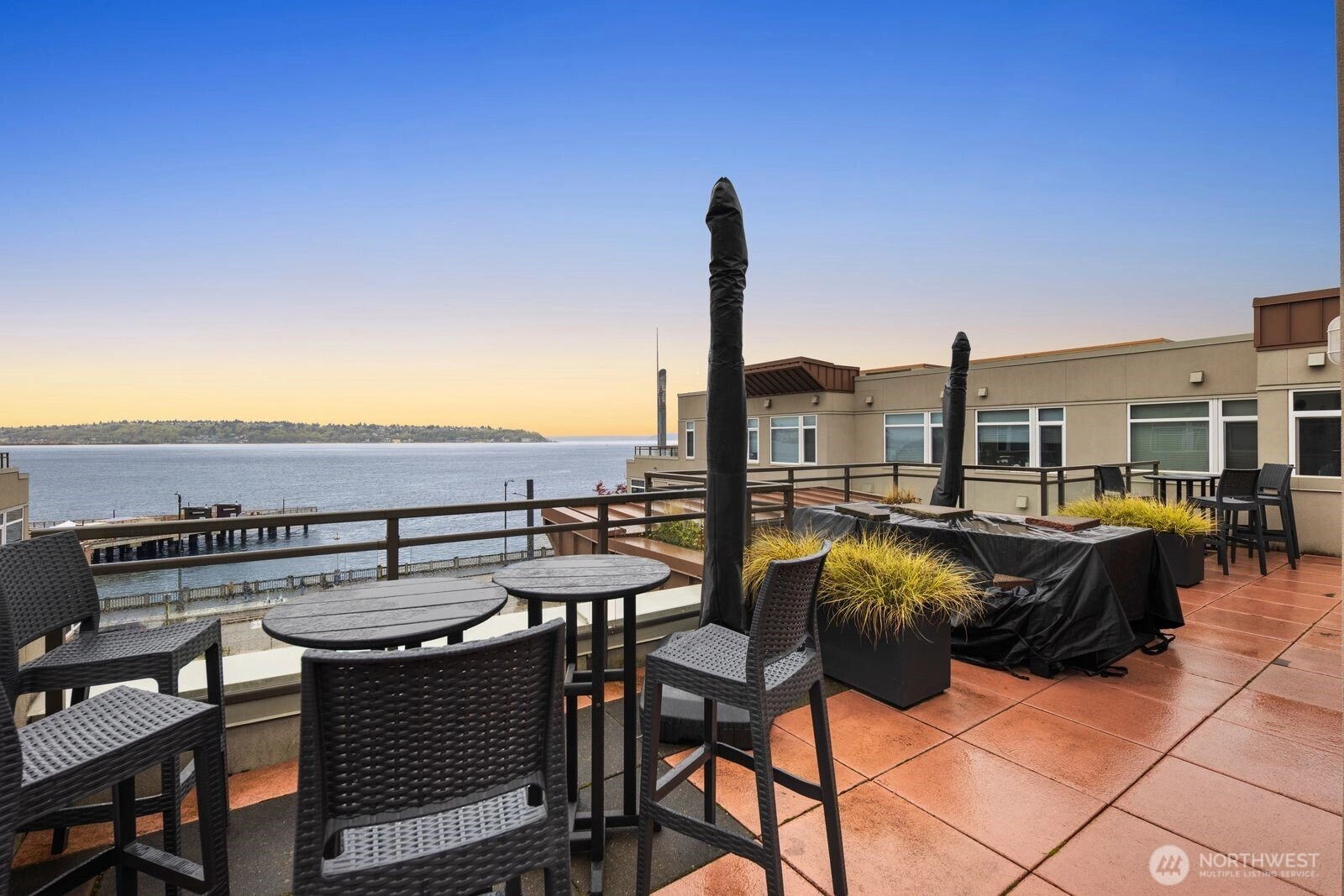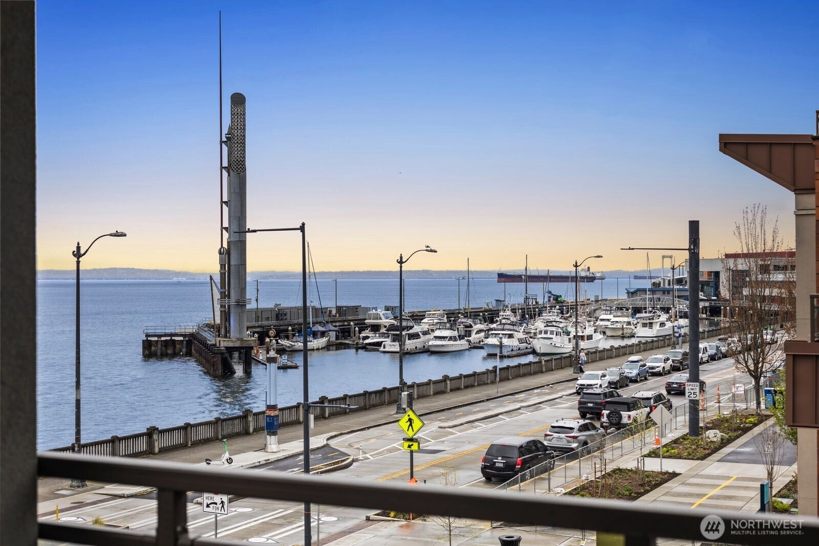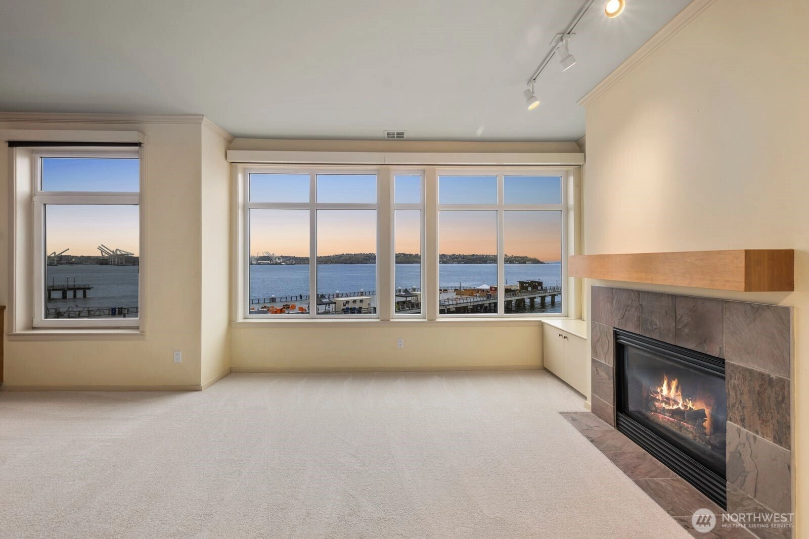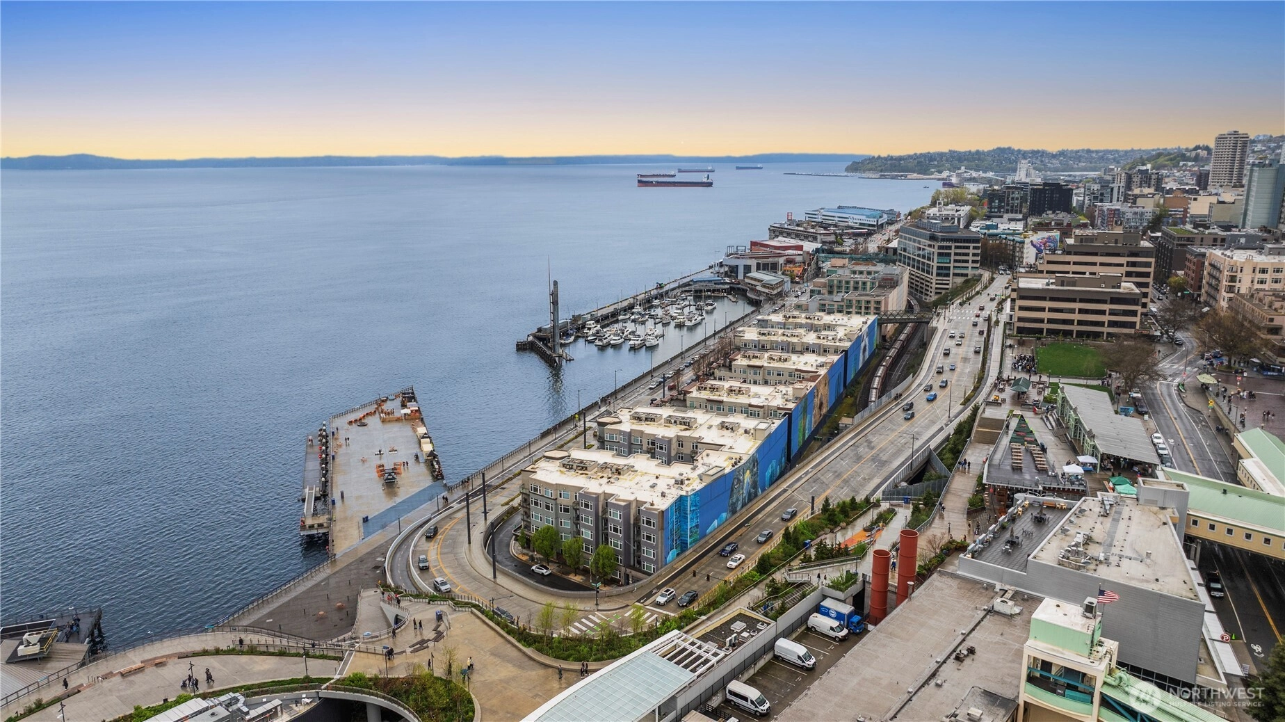 Welcome to Waterfront Landings, the only condominium project on the rejuvenated downtown waterfront. This sought after community features vibrant garden courtyards, resort style amenities and 180-degree views of Puget Sound and the Olympics at your front door. Steps to Pike Place Market, the Aquarium, Miner's Landing, countless restaurants, shopping, sports stadiums, cruise ships, the symphony, SAM, the newly constructed Overlook Walk, ferries-you have it all! Truly unbeatable location with a Walkscore of 96 and Ridescore of 100! This coveted end unit features breathtaking views, an open-concept layout, cozy gas fireplace, contemporary kitchen with gas cooking, ample storage and two spacious bedrooms including a primary suite with soaking tub, shower, double vanity and walk-in closet. Take in awe-inspiring sunsets from your private covered deck or pop up to the to the community's rooftop BBQ deck—perfect for relaxing or entertaining. Enjoy piece of mind with 24/7 concierge-security, fully equipped fitness center & hot tub, guest suite, club room, even a hobby room! Central forced air heat and A/C! Two side x side parking spaces in the secure garage plus a storage unit just down the hall. No rental cap and the property is uniquely well-positioned for strong short-term rental demand. A must see!