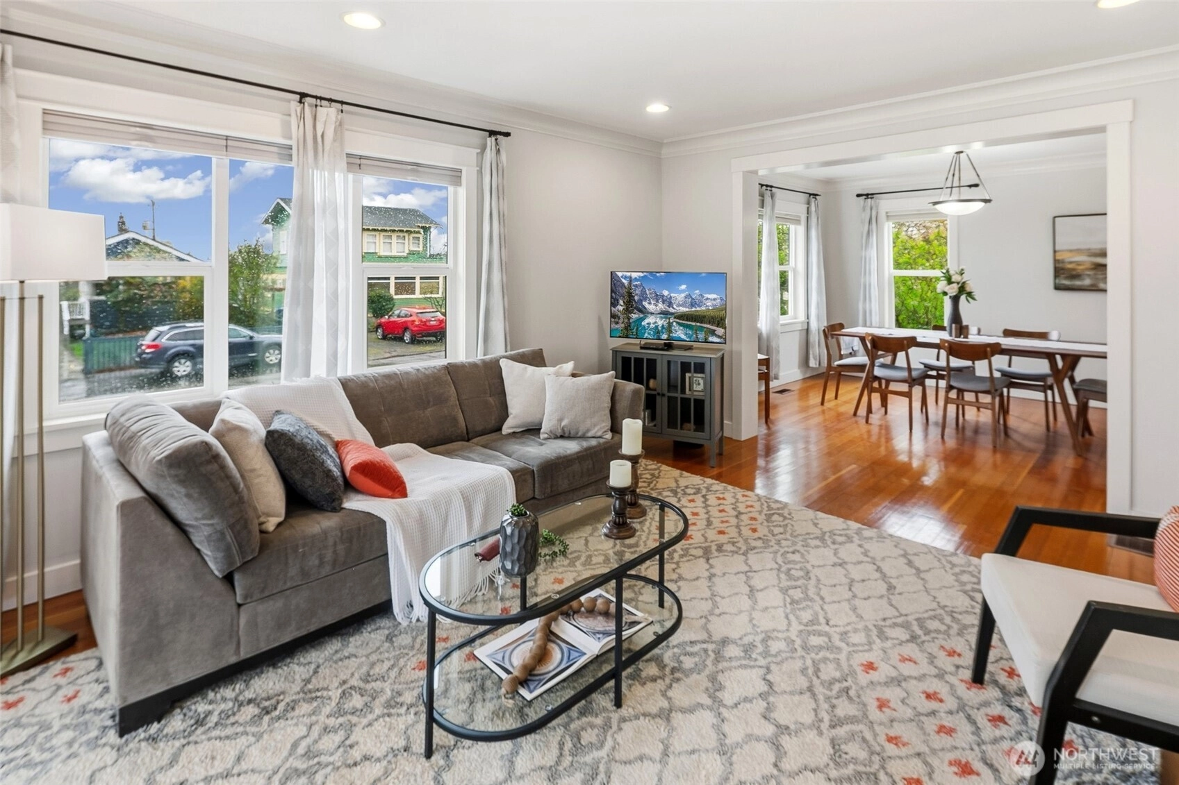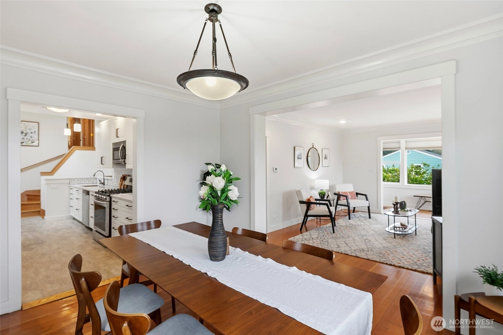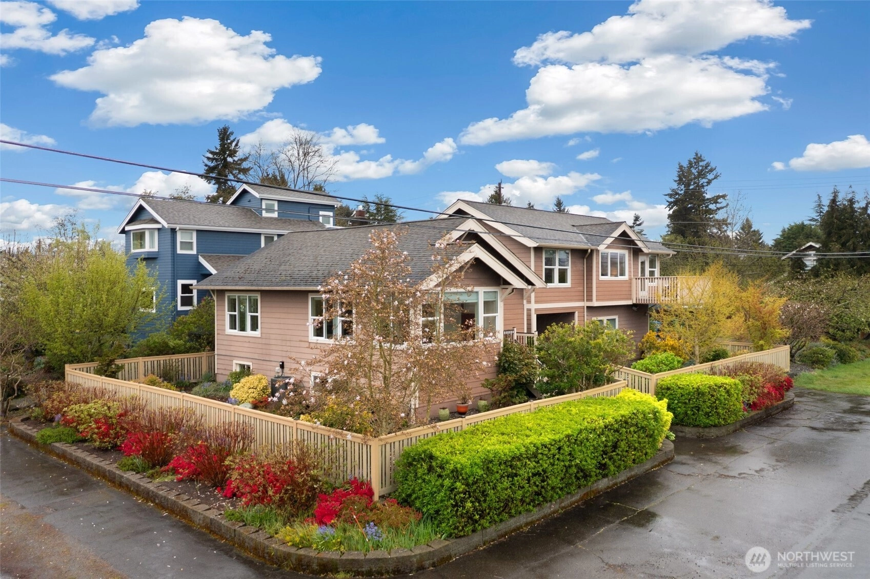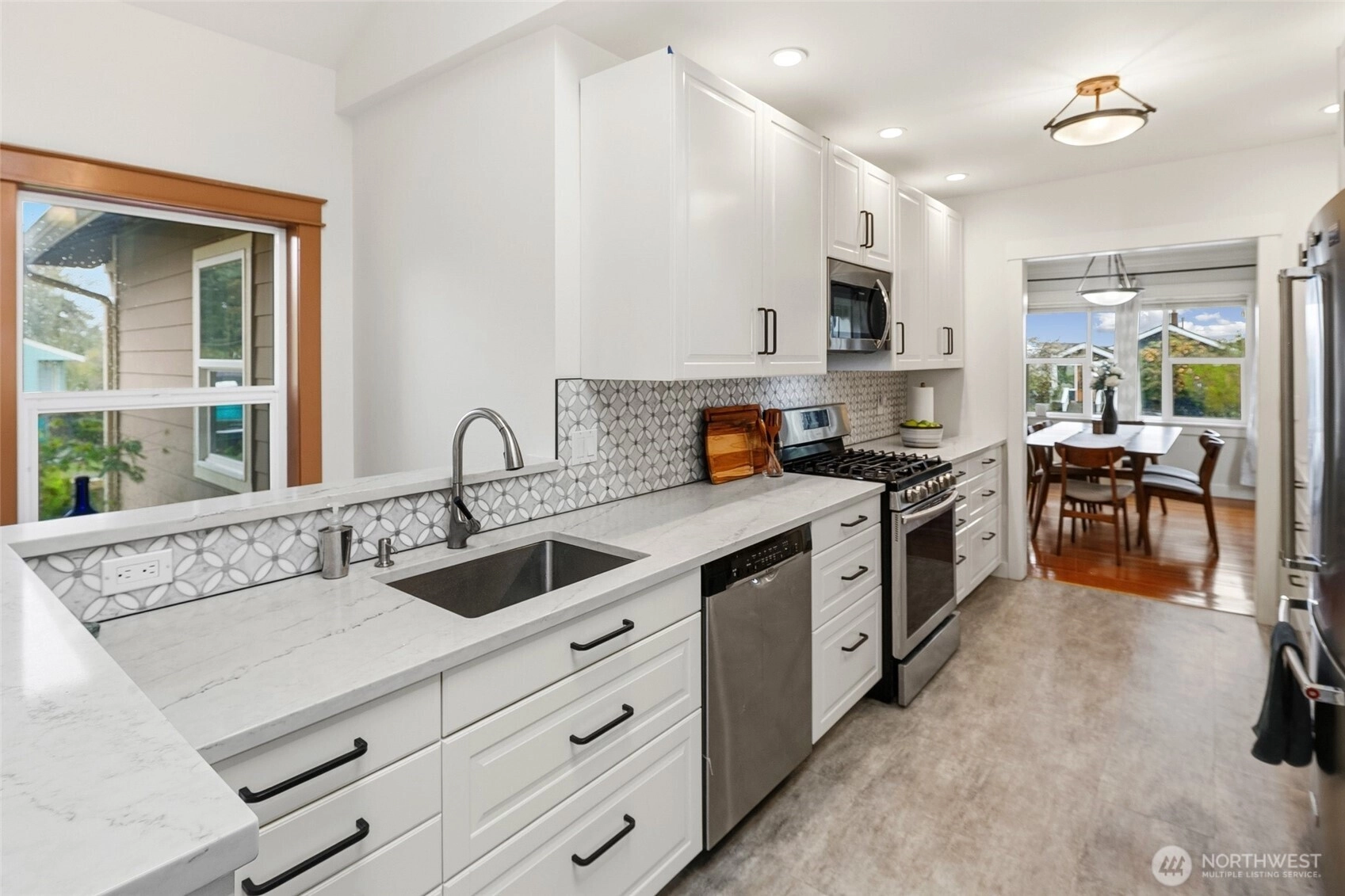 Exquisitely reimagined Craftsman in the heart of Greenwood, blending timeless character with elevated modern updates. Originally built in 1920 and extensively rebuilt and expanded in 2009, this south-facing residence is filled with natural light and showcases rich hardwood floors, refined millwork, and thoughtfully designed living spaces. The beautifully updated kitchen features stainless steel appliances, a gas range, abundant cabinetry, and a charming breakfast nook. Elegant living and dining areas offer seamless flow for everyday living and entertaining, while a main-level guest bedroom or office with an adjacent bath provides exceptional flexibility. Upstairs, three spacious bedrooms include a serene primary suite with a walk-in closet and spa-inspired ensuite. Step onto the private, sun-drenched deck to enjoy territorial and mountain views. The lower level offers a generous rec room and additional flex space ideal for a media lounge, gym, or home office. Situated on a beautifully landscaped corner lot with an inviting patio, two-car attached garage, and ample off-street parking. Ideally located near parks, top-rated schools, shops, dining, and convenient access to Highway 99, I-5, and downtown Seattle.