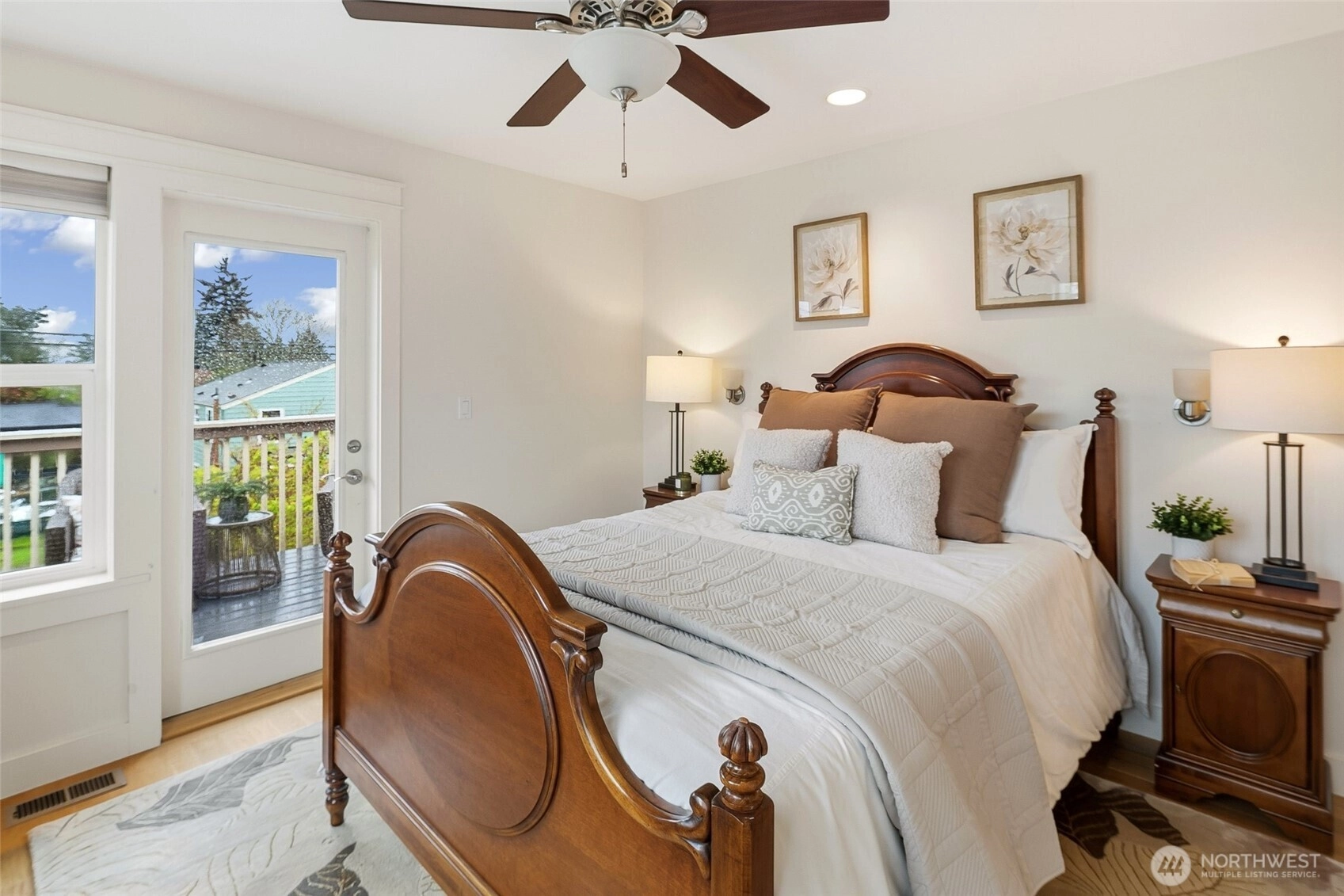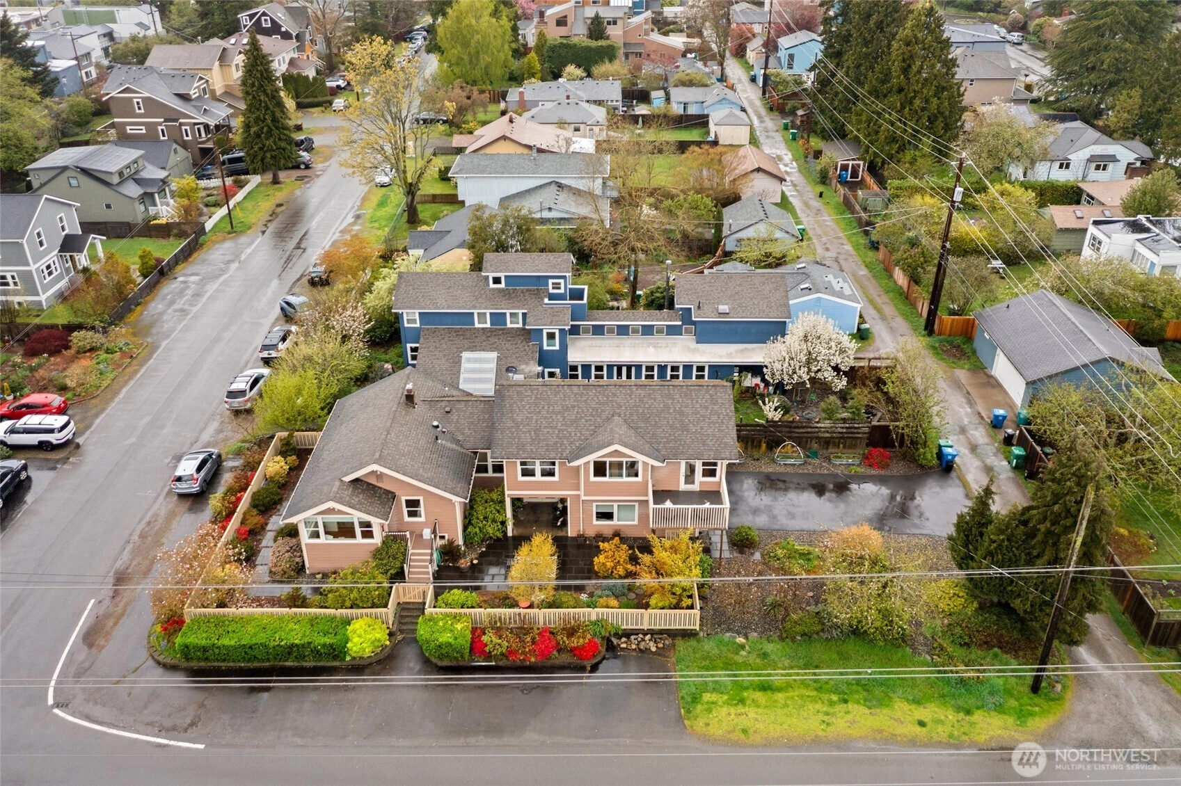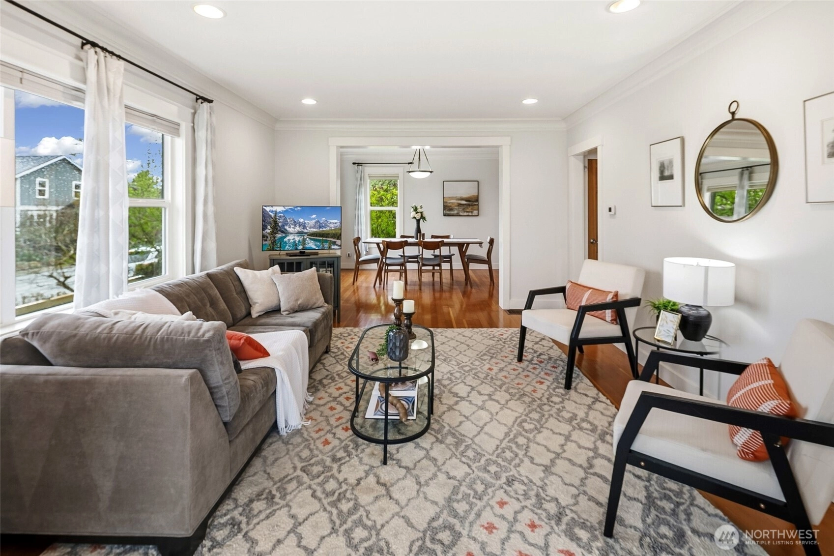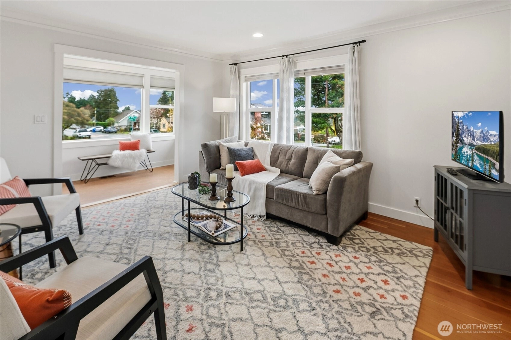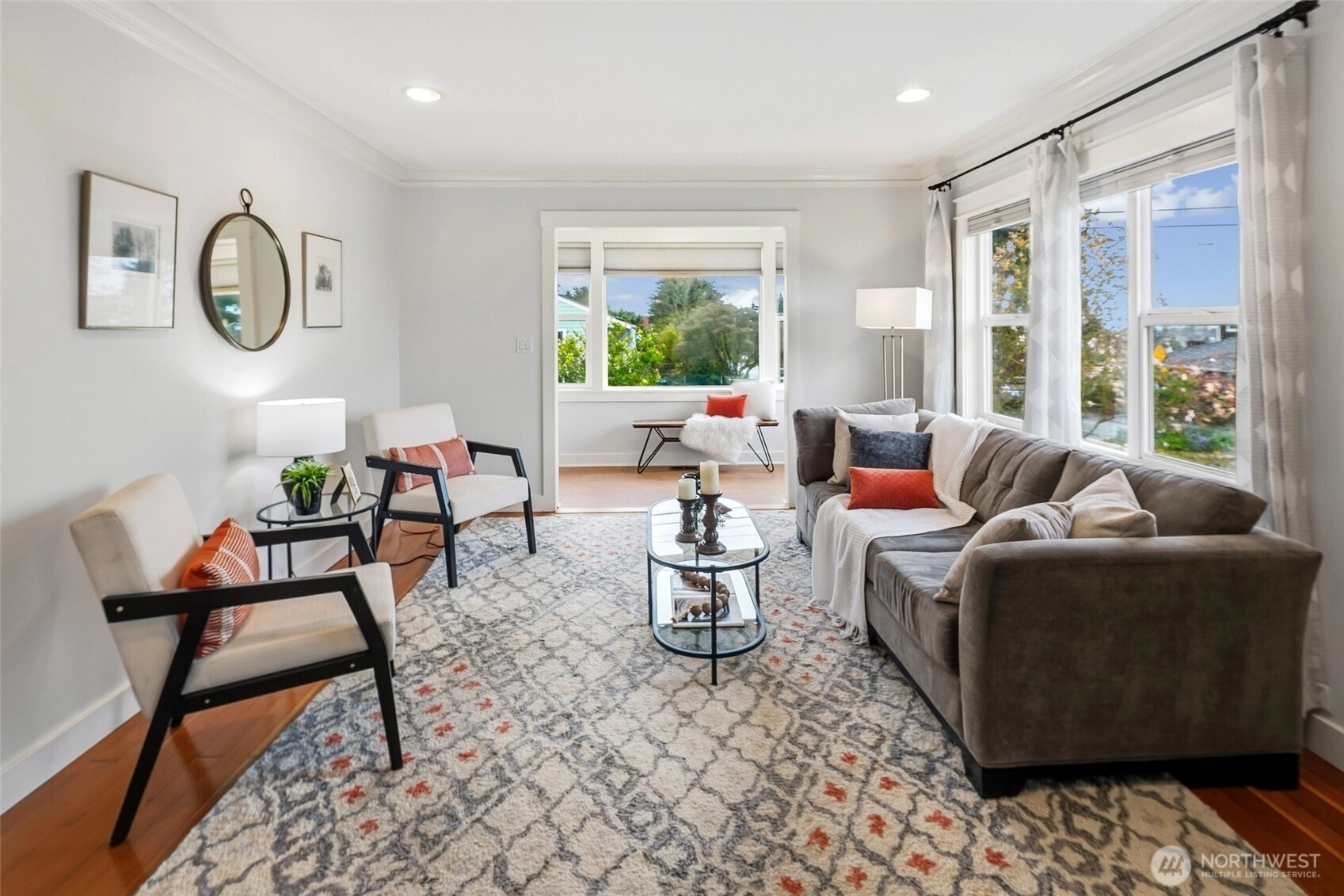Exquisitely reimagined Craftsman in the heart of Greenwood, blending timeless character with elevated modern updates. Originally built in 1920 and extensively rebuilt and expanded in 2009, this south-facing residence is filled with natural light and showcases rich hardwood floors, refined millwork, and thoughtfully designed living spaces. The beautifully updated kitchen features stainless steel appliances, a gas range, abundant cabinetry, and a charming breakfast nook. Elegant living and dining areas offer seamless flow for everyday living and entertaining, while a main-level guest bedroom or office with an adjacent bath provides exceptional flexibility. Upstairs, three spacious bedrooms include a serene primary suite with a walk-in closet and spa-inspired ensuite. Step onto the private, sun-drenched deck to enjoy territorial and mountain views. The lower level offers a generous rec room and additional flex space ideal for a media lounge, gym, or home office. Situated on a beautifully landscaped corner lot with an inviting patio, two-car attached garage, and ample off-street parking. Ideally located near parks, top-rated schools, shops, dining, and convenient access to Highway 99, I-5, and downtown Seattle.