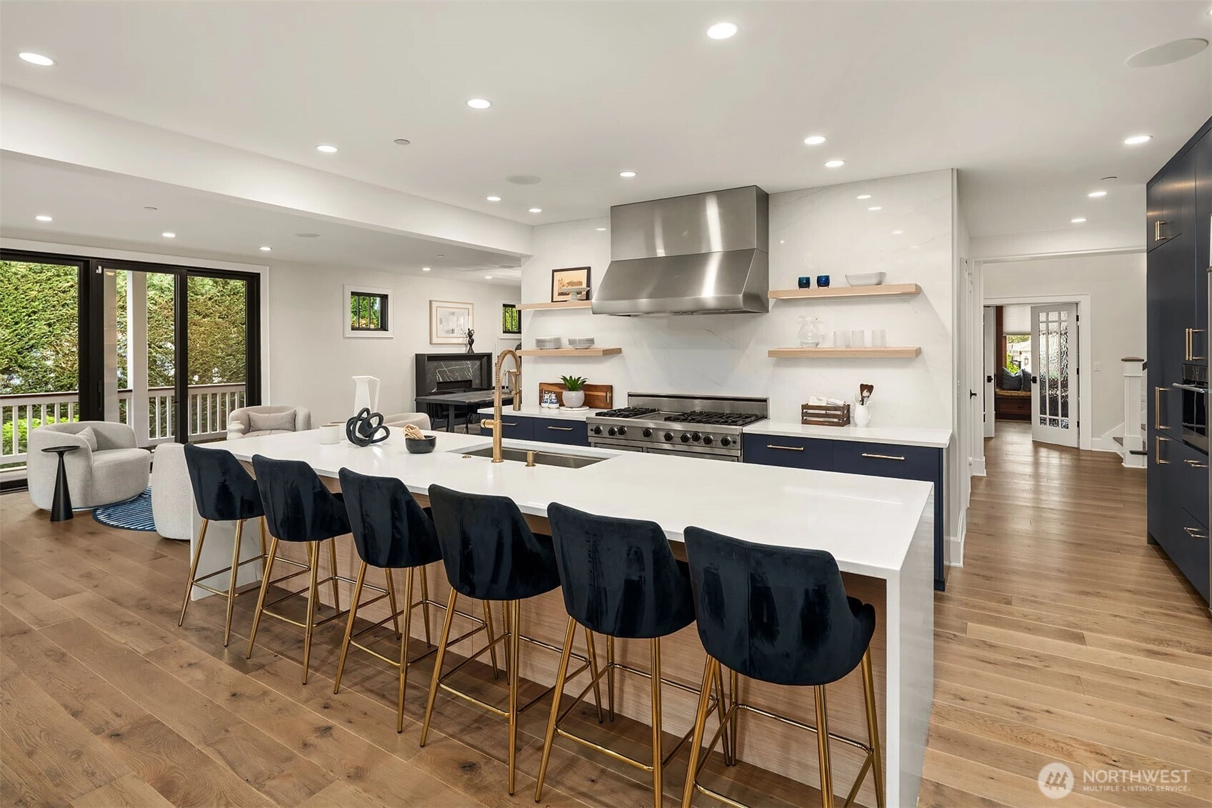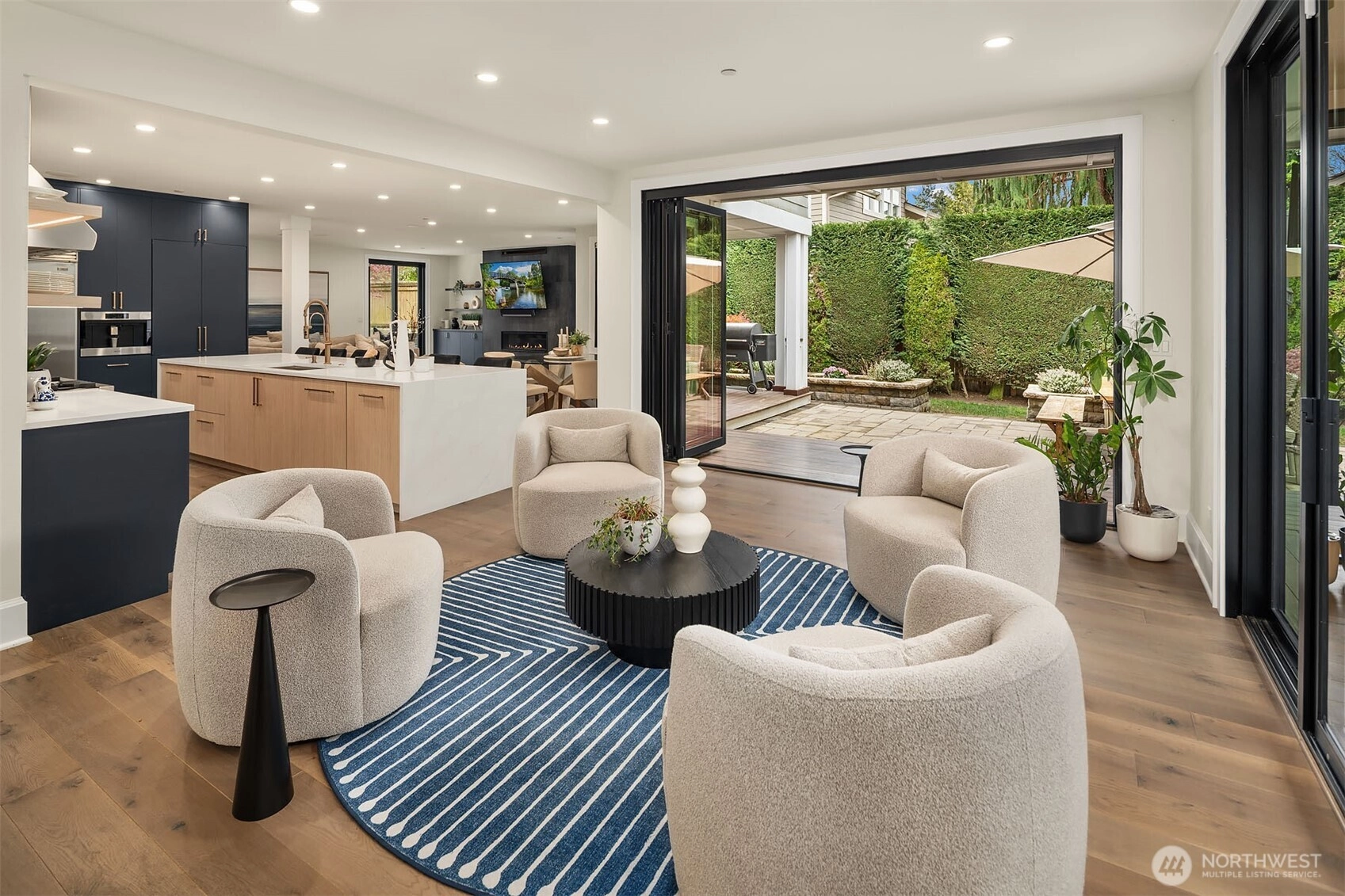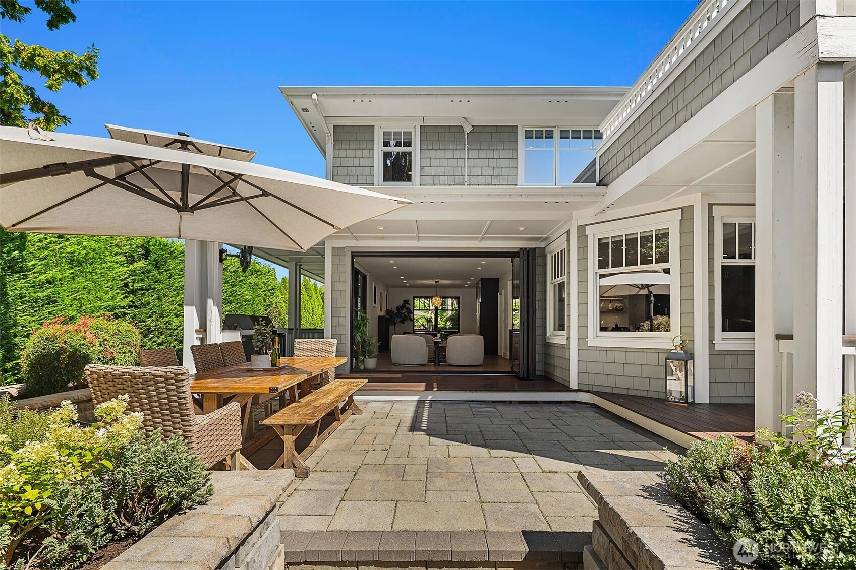 Nestled in coveted Yarrow Point, this beautifully remodeled Craftsman offers the perfect blend of timeless character and modern livability. A dramatic two-story entry sets the stage, leading to an open living and dining layout anchored by an entertainer's kitchen and warm family room. Bifold doors spanning the main living spaces open to a private patio and lawn perfect for cozy nights in, spring entertaining, or casual gatherings. Rich hardwood floors, abundant natural light, and a thoughtful floor plan make everyday living feel effortless, complemented by a wood-paneled office with custom built-ins. Upstairs, four bedrooms include a serene primary suite with spa bath, freestanding soaking tub, large walk-in closet, and peek-a-boo lake views, plus a versatile guest suite, perfect as a bedroom, bonus, au pair, or extended stay space. Downstairs, a full entertainment level delivers a theater, game room, fitness room or guest bedroom, and ample storage. Space and storage abound throughout. The 3-car garage, mudroom, and 2 laundry rooms round out this exceptionally functional home. Blocks to Yarrow Point Park, beaches, and award-winning West Bellevue Schools.