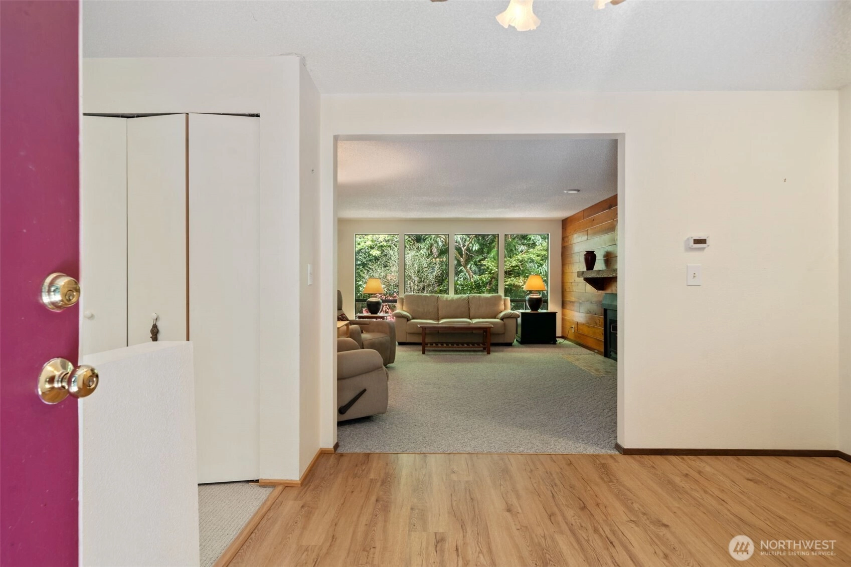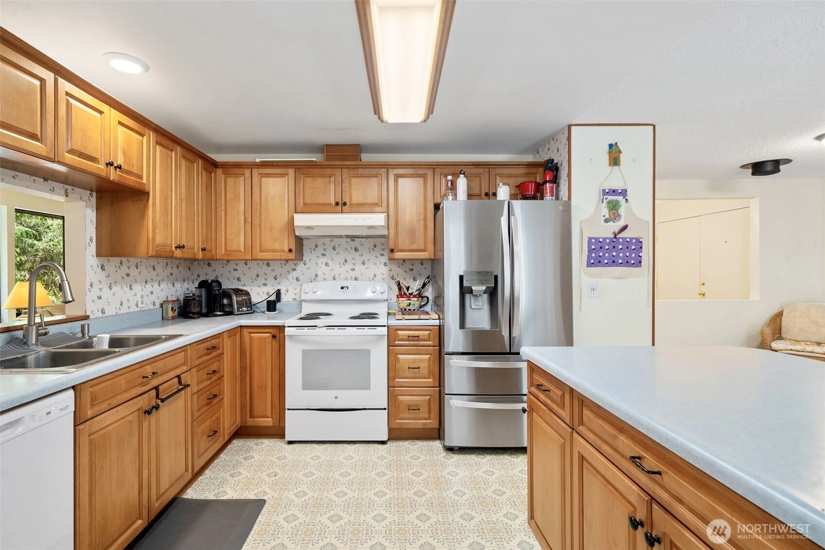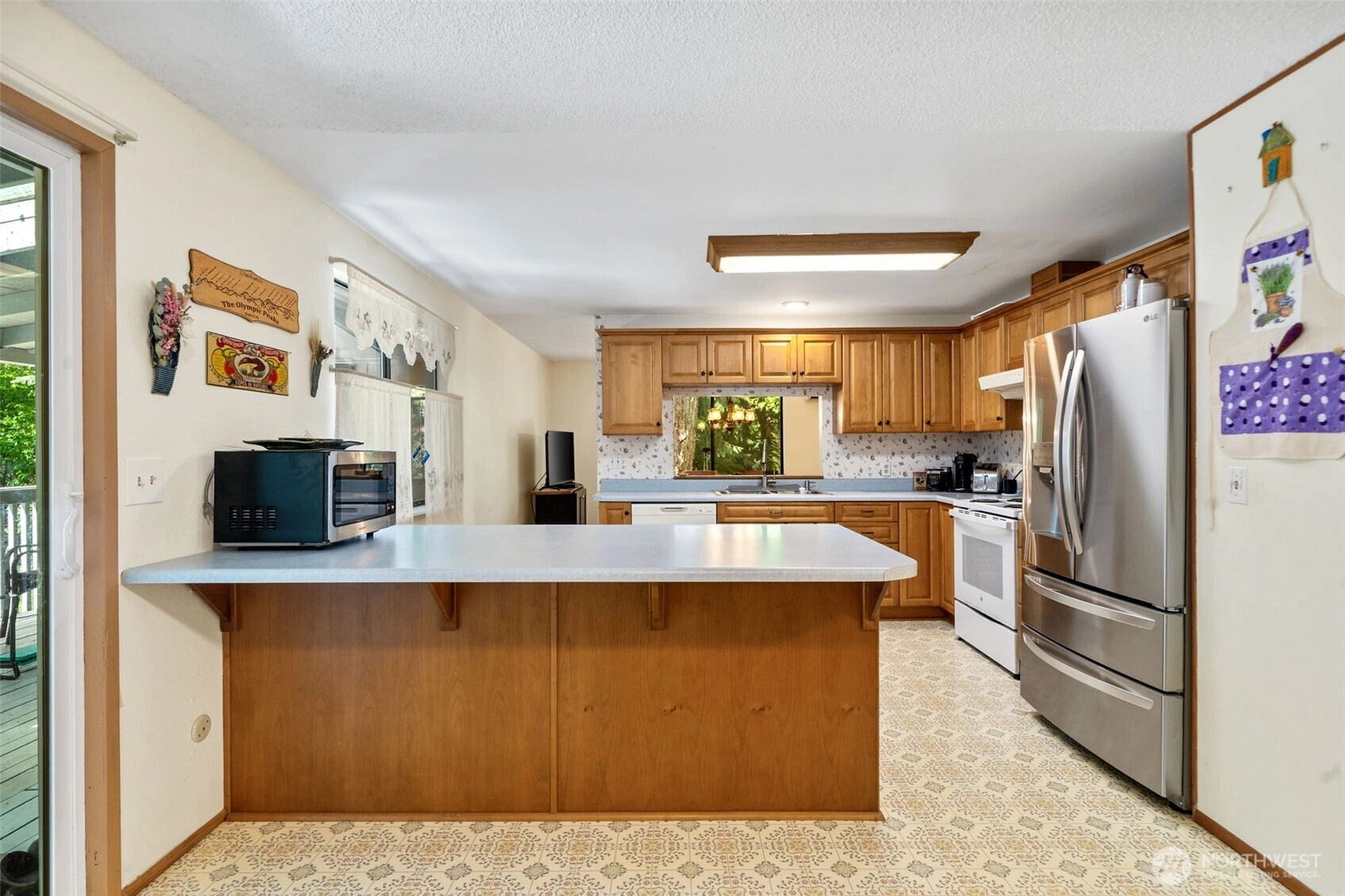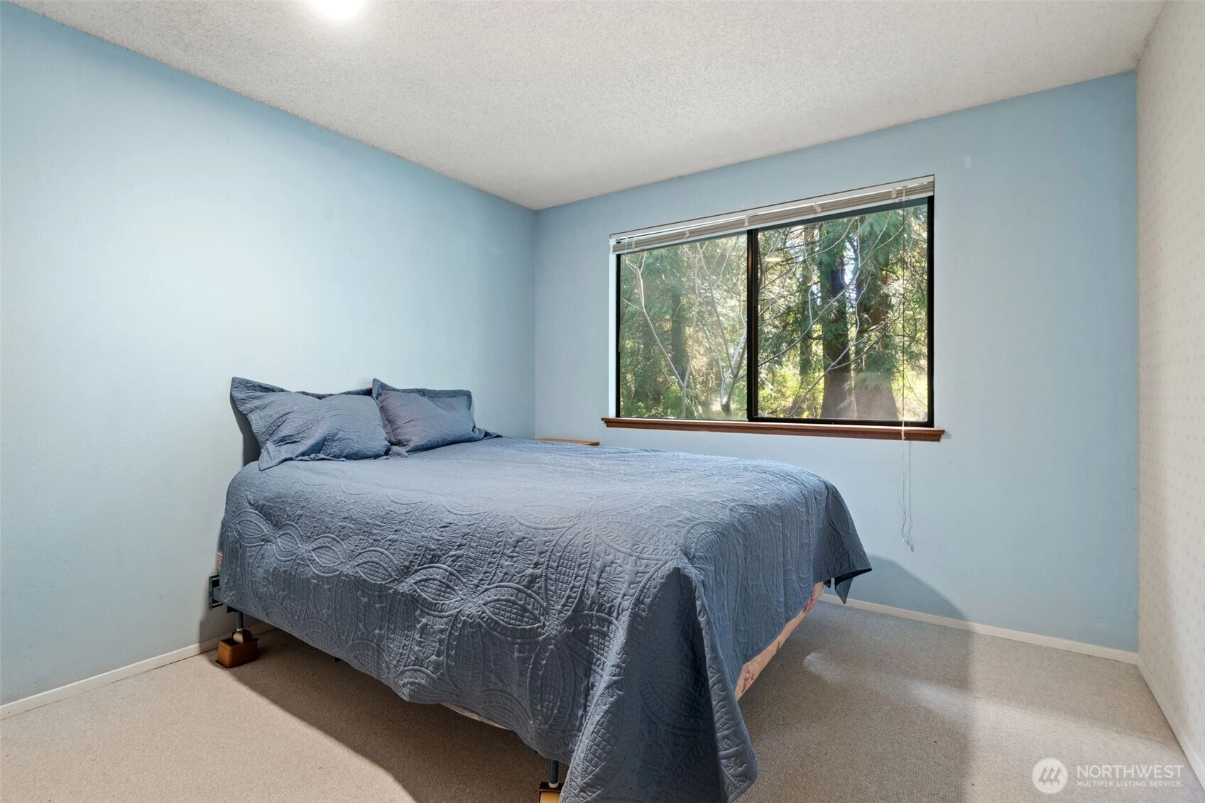 Secluded woodlands setting just minutes to the Agate Pass bridge/Hwy 305 to Bainbridge Is Ferry. Well maintained one story designed home on 2.29 acres. Primary bedroom with ensuite & 2 bedrooms, full bath in the hallway. You will love the oversized living room with cozy propane fireplace and large mantle above, gaze through the wall of windows to the woodland gardens and forest, you probably won't want to leave. French doors in the entry lead to a foyer to the circular floor plan. Familyroom, breakfast bar island leads to a delightful kitchen, pass through framed window leads to formal dining room. Utility room just off the family room. Oversized deck off the family room, covered and has storage shed for gardening tools. 2 car garage attached and extra side parking in the front, perfectly accommodates parking for guests.