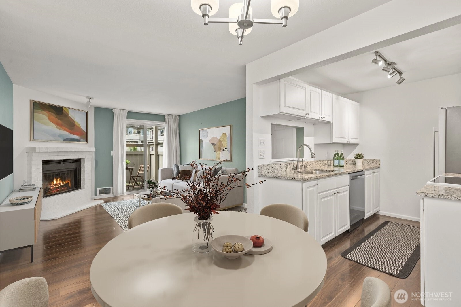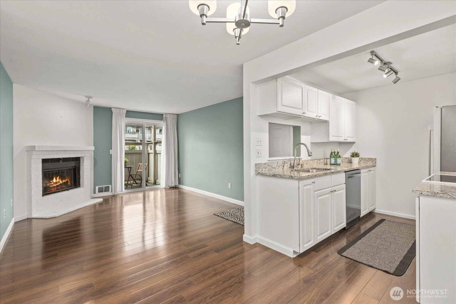 Welcome to this beautifully updated ground-floor condo in Woodland Hills Condos, where comfort meets convenience in the heart of Woodinville. Bathed in natural light and overlooking a peaceful courtyard, this inviting home offers a serene retreat with stylish, modern upgrades throughout. Inside, new wood flooring flows seamlessly throughout, creating a warm and inviting vibe. The living room is centered around a cozy wood-burning fireplace—ideal for relaxing evenings. The kitchen shines with granite countertops, wood cabinets, and newer appliances, including dishwasher & refrigerator. The bathroom has been recently updated with a new tub surround, modern vanity, updated lighting, and additional shelving, giving it a sleek, contemporary feel. The primary suite features a spacious walk-in closet fitted with custom built-ins, while the second bedroom offers versatility with a Queen-size Murphy bed—perfect for hosting guests or a flexible home office. New electric blackout blinds in both bedrooms ensure ultimate privacy & comfort. Step outside the slider to the private enclosed patio with extra storage—a perfect spot to enjoy morning coffee or unwind at the end of the day. Enjoy resort-style amenities including a gym, community room, indoor hot tub, and outdoor pool—all included in the HOA dues. Ideally located near shopping, dining, and Woodinville’s renowned wineries. With one assigned parking space, no rental cap, and Airbnb potential, this condo is not to be missed!