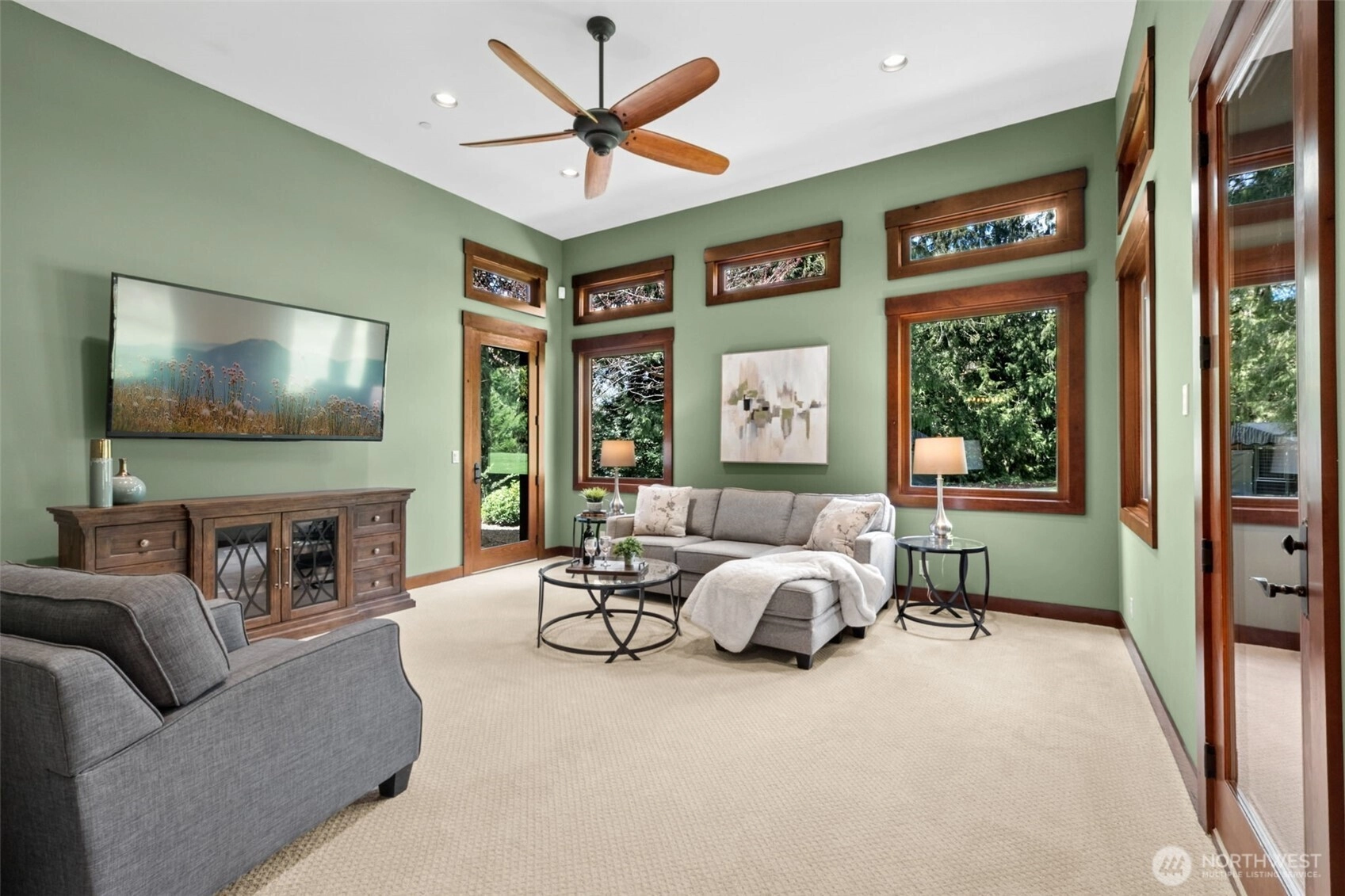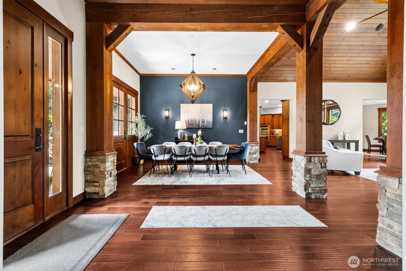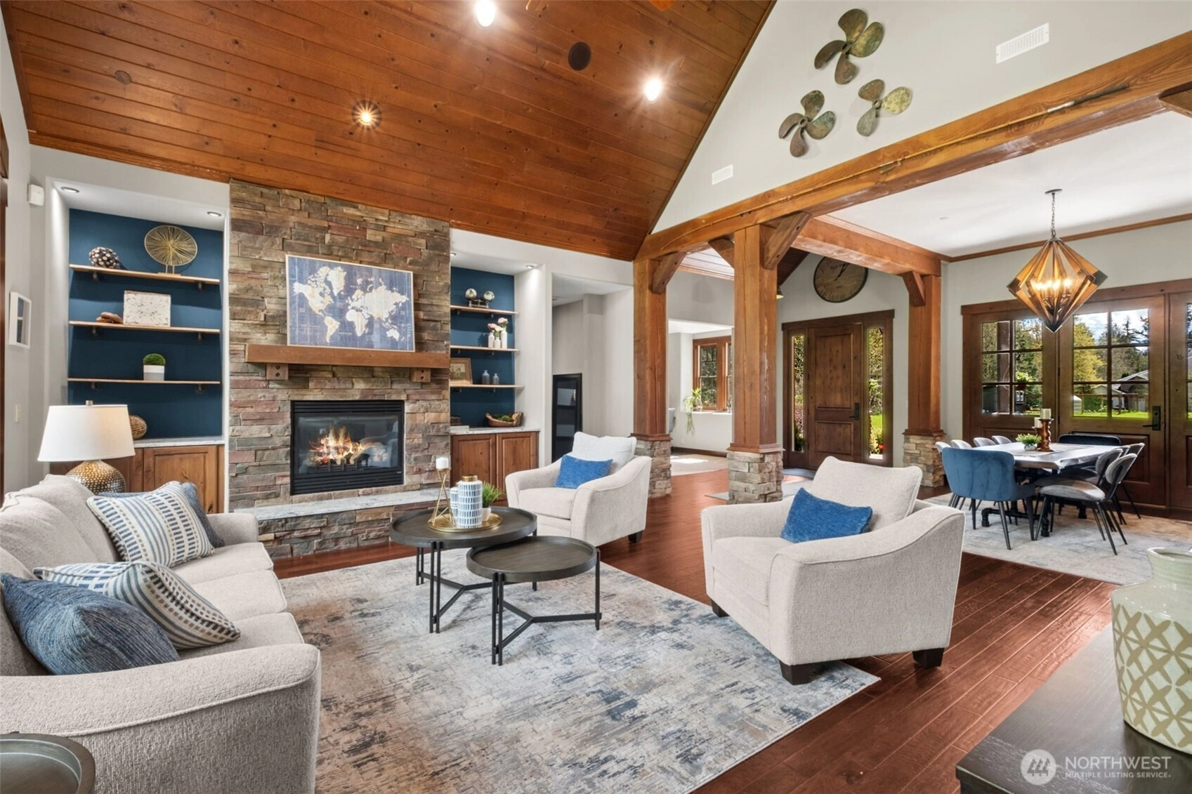 PNW Contemporary design meets timeless Craftsman influence in this beautifully curated custom home on 10 serene acres. An architecturally divine exterior of stone, wood & shingle accents welcomes you to a warm entry with soaring wood ceilings & rich hardwoods. Great room stuns w/vaulted tongue-&-groove ceilings, a dramatic window wall overlooking park-like grounds, floor-to-ceiling stone fireplace with custom built-ins. Expansive chef’s kitchen w/abundant cabinetry, granite surfaces, double ovens, SS appliances & a large island w/seating—flowing to a bright dining nook wrapped in windows w/patio access. A main-level office sits just off the entry. Privately positioned, the primary suite offers a tray ceiling, garden views, and a spa-inspired ensuite w/soaking tub centerpiece, barrel-vaulted wood ceiling, dual vanities, statement lighting, an oversized double walk-in shower, plus a boutique-style closet w/in-suite laundry & coffee/wine bar. Upstairs bonus w/bedroom, bath + kitchenette plumbing creates ideal guest suite or multigenerational living! Outdoor living shines w/a covered patio, wood ceiling, fan, hot tub, fire pit & garden area, greenhouse & shed. Detached cabana/studio w/bath & kitchenette offers DADU potential. Massive 40’x80’ shop w/4 bays, mezzanine, and office. Surrounded by gorgeous Evergreens and endless privacy! W/large level lawns for furry friends & outdoor play & entertaining, there is something for everyone and every activity in this private estate!