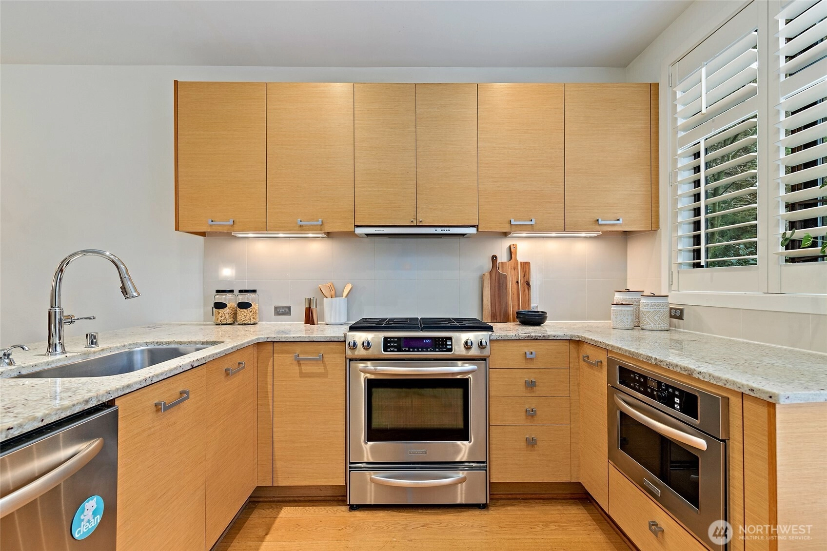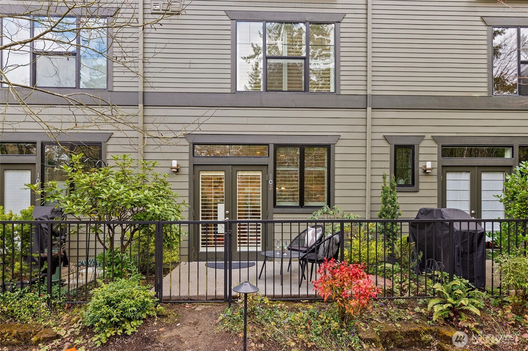 New Price! If you are seeking space, style, and location in equal measure, this three-story townhome puts you at the heart of Downtown Bellevue. The main level is designed for both everyday living and effortless entertaining — an open-concept layout anchored by a striking two-sided fireplace, a chef's kitchen with stainless steel appliances and gas range, and a patio that extends your living space outdoors. Hardwood floors, plantation shutters, and motorized blinds run throughout, giving every room a polished, move-in-ready finish. Upstairs, a spacious bedroom and full bath are complemented by a generously sized bonus room — ideal as a dedicated home office, gym, or media room. At the top, the primary suite is your retreat: a comfortable seating area, Juliette balcony, dual vanities, walk-in closet with custom organizers, and a beautifully appointed en-suite bath. Practical details are just as considered: secure underground parking with two tandem spaces, two storage units, and a newer hot water tank. All within a short distance of Bellevue Square and a short commute to Microsoft, Amazon, and Meta hubs — and served by the highly-rated Bellevue School District. This is downtown Bellevue living without compromise.