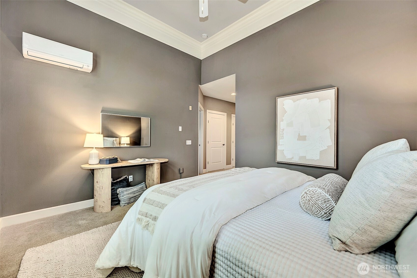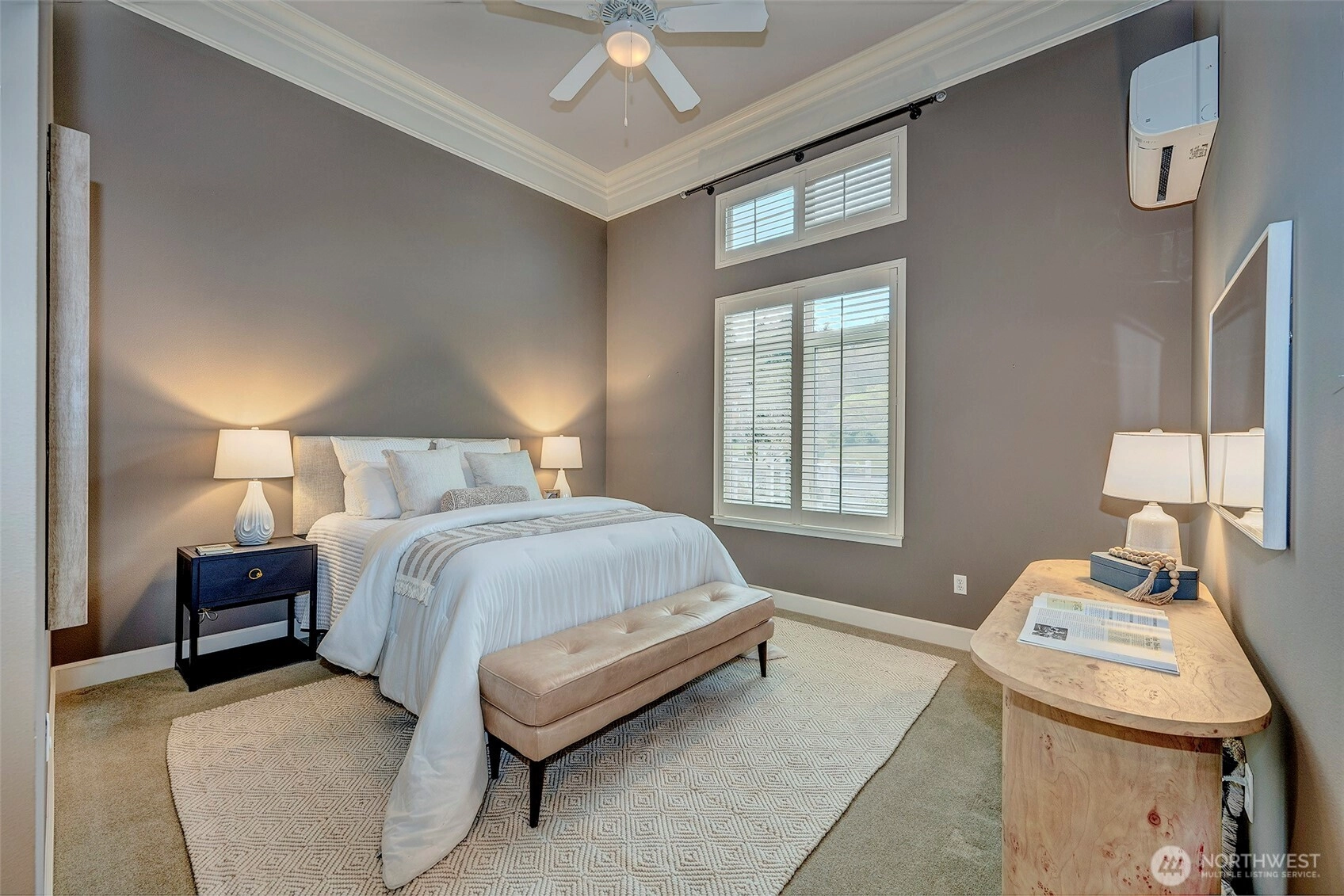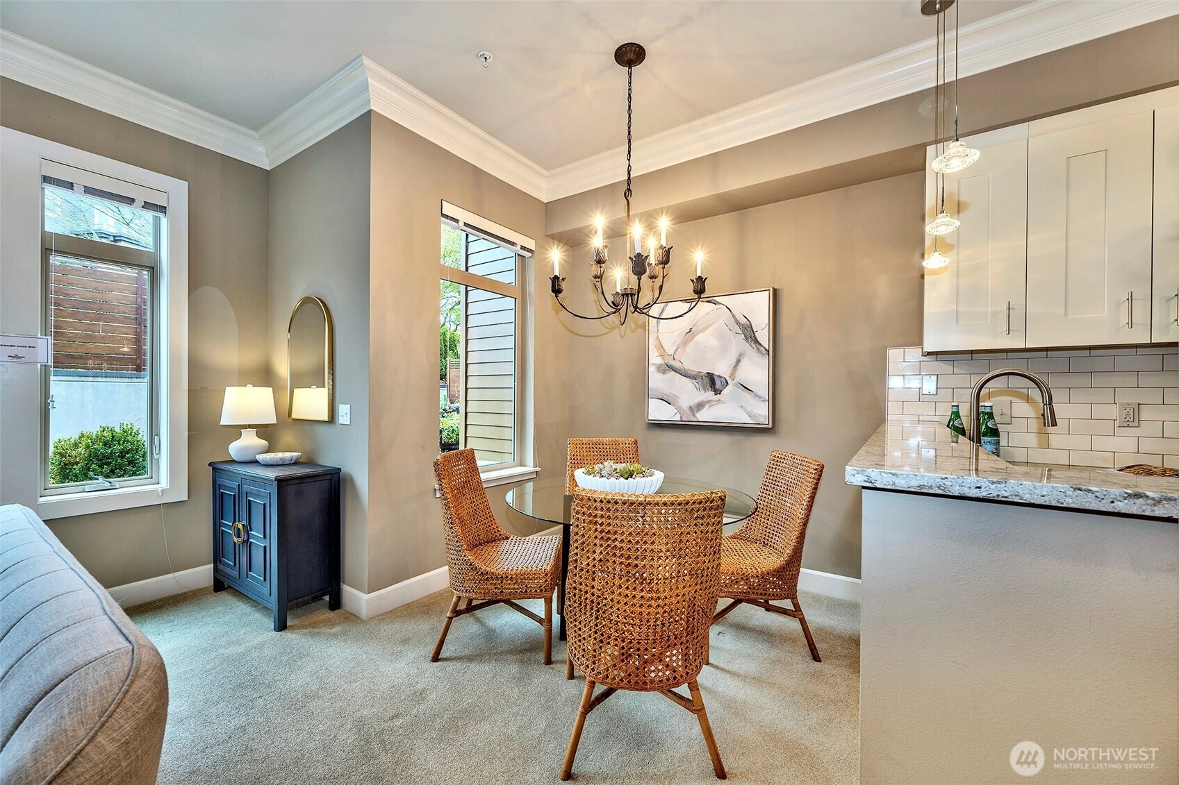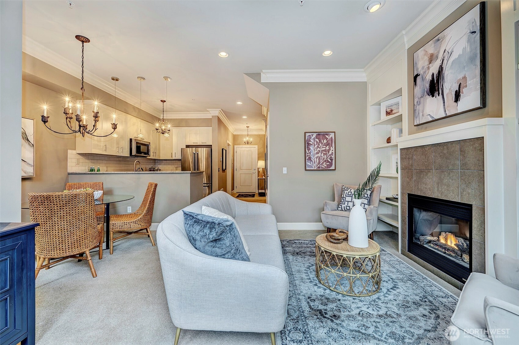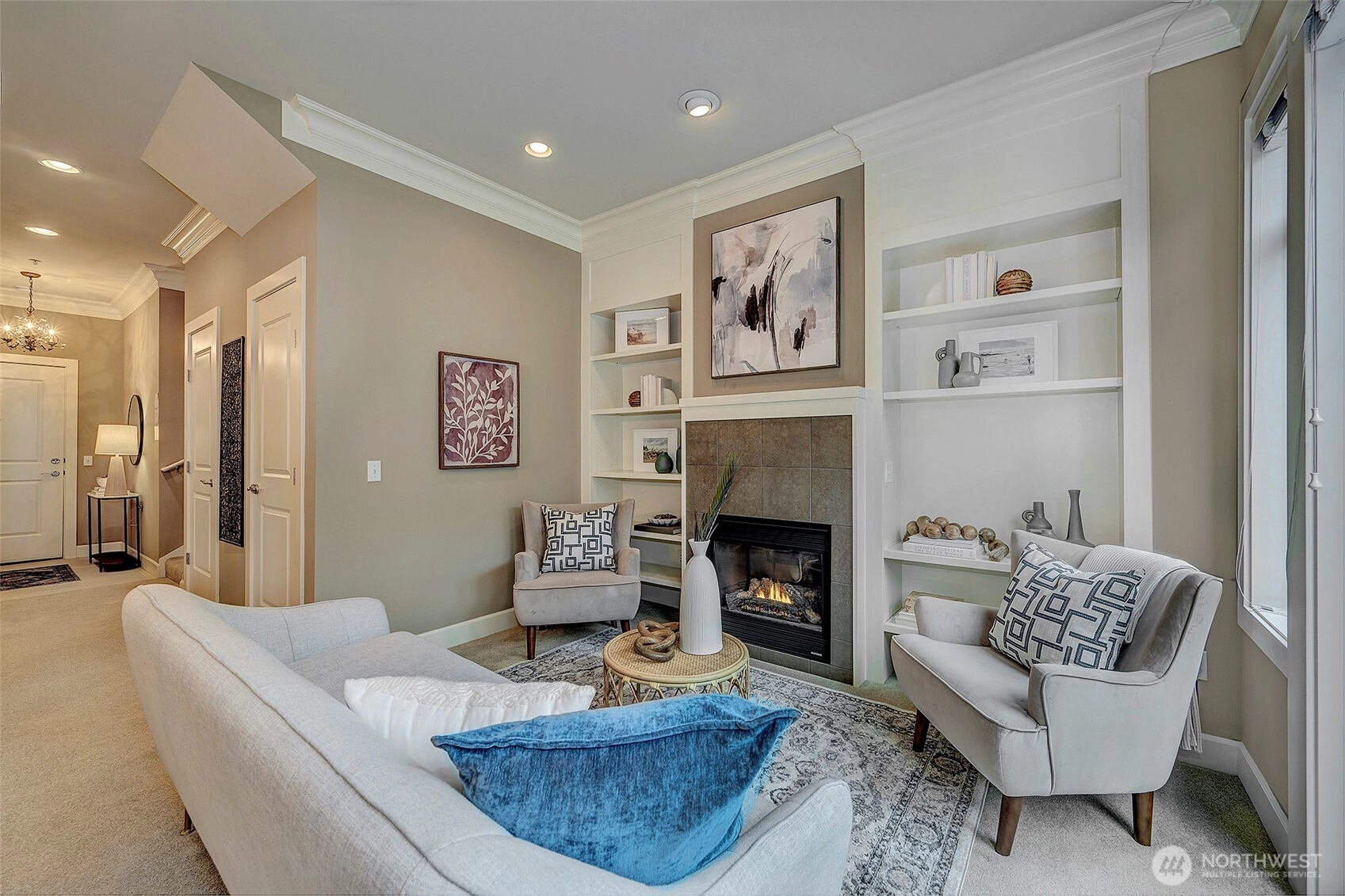 Welcome to resort-style living at coveted Point Edwards! This elegant home blends refined luxury with everyday comfort—and offers the privacy of no neighbors above or below. Soaring 12’ ceilings with custom crown moldings create an airy sense of grandeur, while built-in bookshelves frame the cozy gas fireplace and walls of windows bathe the home in natural light. A mini-split A/C system ensures year-round comfort. The chef's kitchen shines with slab quartz countertops, tile backsplash, stainless appliances, and two large storage closets—providing pantry and utility space. A full bath on the main adds flexibility for guests. Designed for effortless entertaining, the living and dining areas flow seamlessly through French doors onto your expansive, south-facing sun-drenched patio—an inviting private garden oasis perfect for relaxing, dining al fresco, and gathering with friends. Upstairs, retreat to your luxurious primary suite featuring soaring ceilings, skylights, plantation shutters, and generous walk-in closet. The spa-inspired bath offers double vanity, slab granite counters and a spacious walk-in shower. Versatile flex room easily converts to a guest suite or home office to suit your lifestyle needs. Convenient upper-level laundry with side-by-side W/D plus additional storage enhances everyday ease. NO RENTAL CAP! Two parking spaces and additional storage are included. Resort Amenities: Pools, Hot Tubs, Exercise Facilities, 3 guest suites and more. Easy stroll to Edmonds!