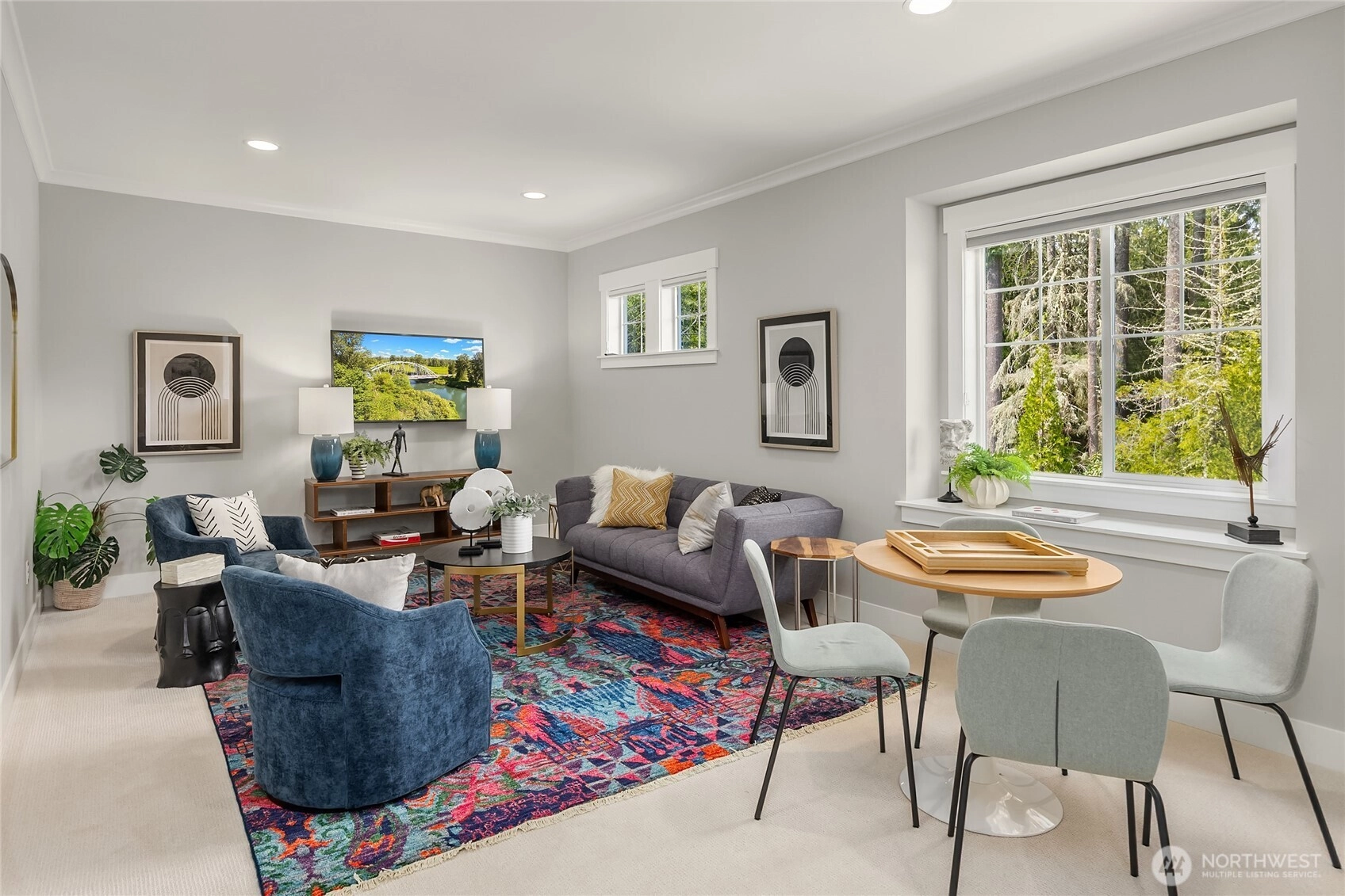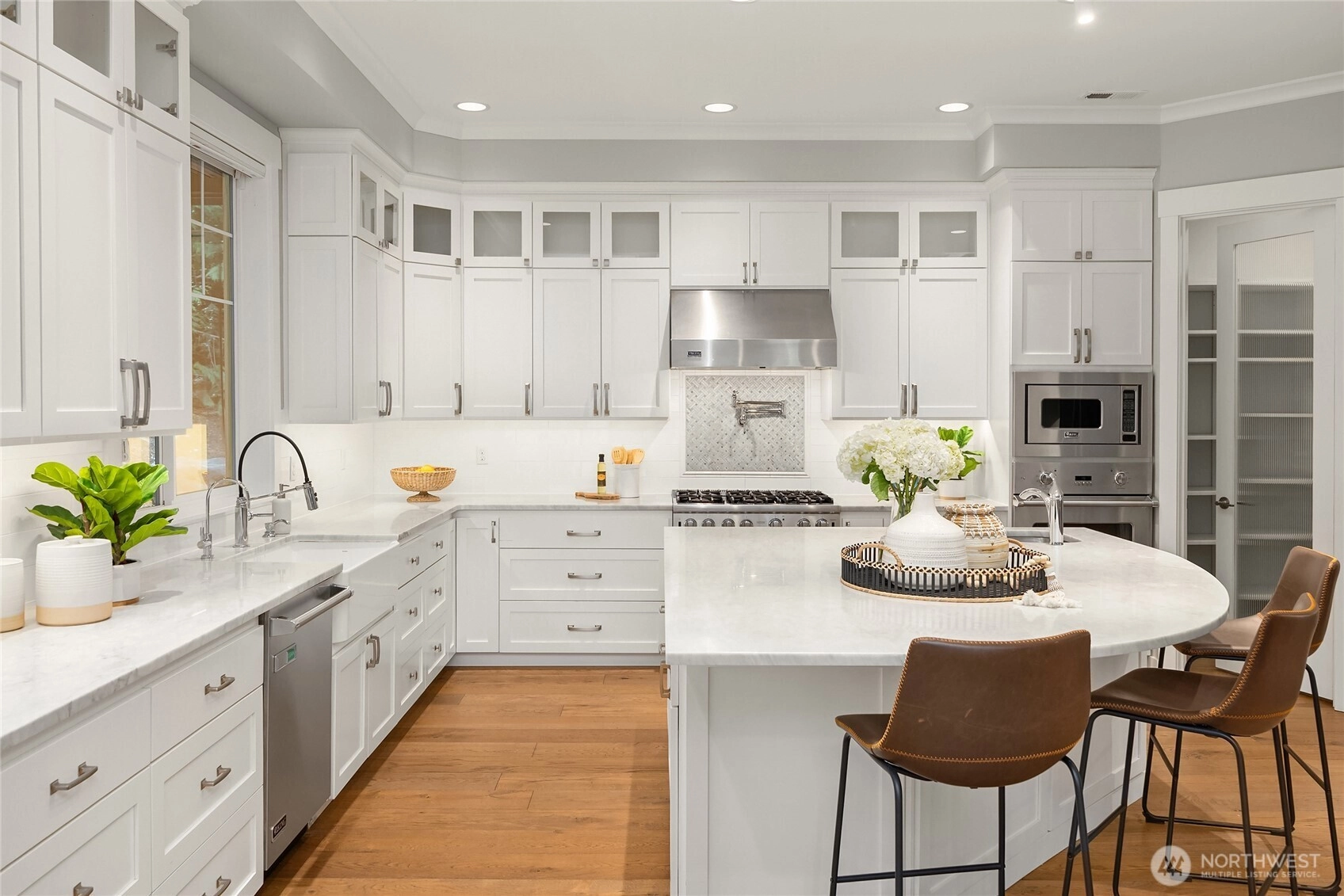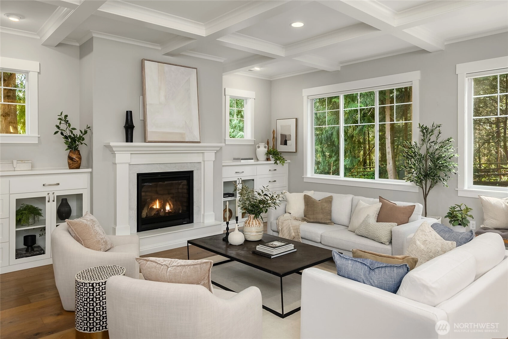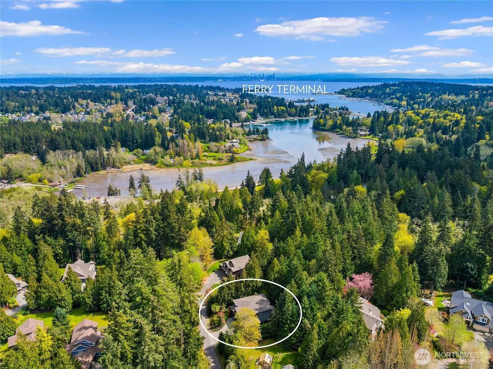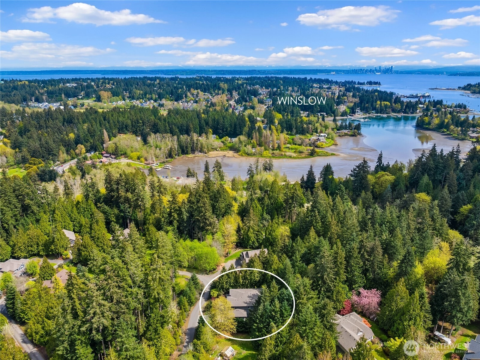 Welcome home to luxury living in the desirable Stetson Ridge Neighborhood. This stunning NW Contemporary home is one of the most popular floor plans in the neighborhood with a refined blend of elegance and functionality. Private .62 acre lot. Wide-planked hardwood flooring is throughout the entire main level that boasts a formal living room, dining room and a main floor bedroom with a 3/4 bath that makes a terrific guest suite, private office or second primary bedroom. Brand new, never-lived-in carpeting is upstairs where the spacious primary suite, three additional bedrooms plus a large bonus room can be found. The upstairs primary suite is oversized with a gas fireplace, soaking tub, large walk-in shower and enormous walk-in closet with built-ins. Popular Jack and Jill Bathroom between two of the bedrooms. Exquisite details throughout such as 10-foot box-beam ceilings, crown molding, wainscoting and built-ins. Chef's kitchen boasts marble countertops, top-of-the-line Viking appliances, wet bar with wine fridge and a spacious walk-in pantry. Covered patio off of the kitchen offers seamless indoor/outdoor living that is ideal for year-round entertaining and relaxation. Three-car garage, a handy mudroom for the PNW lifestyle, an efficient heat pump for heating and cooling, and an on-demand generator. Prime location close to downtown Winslow, the ferry and schools. A terrific island package.