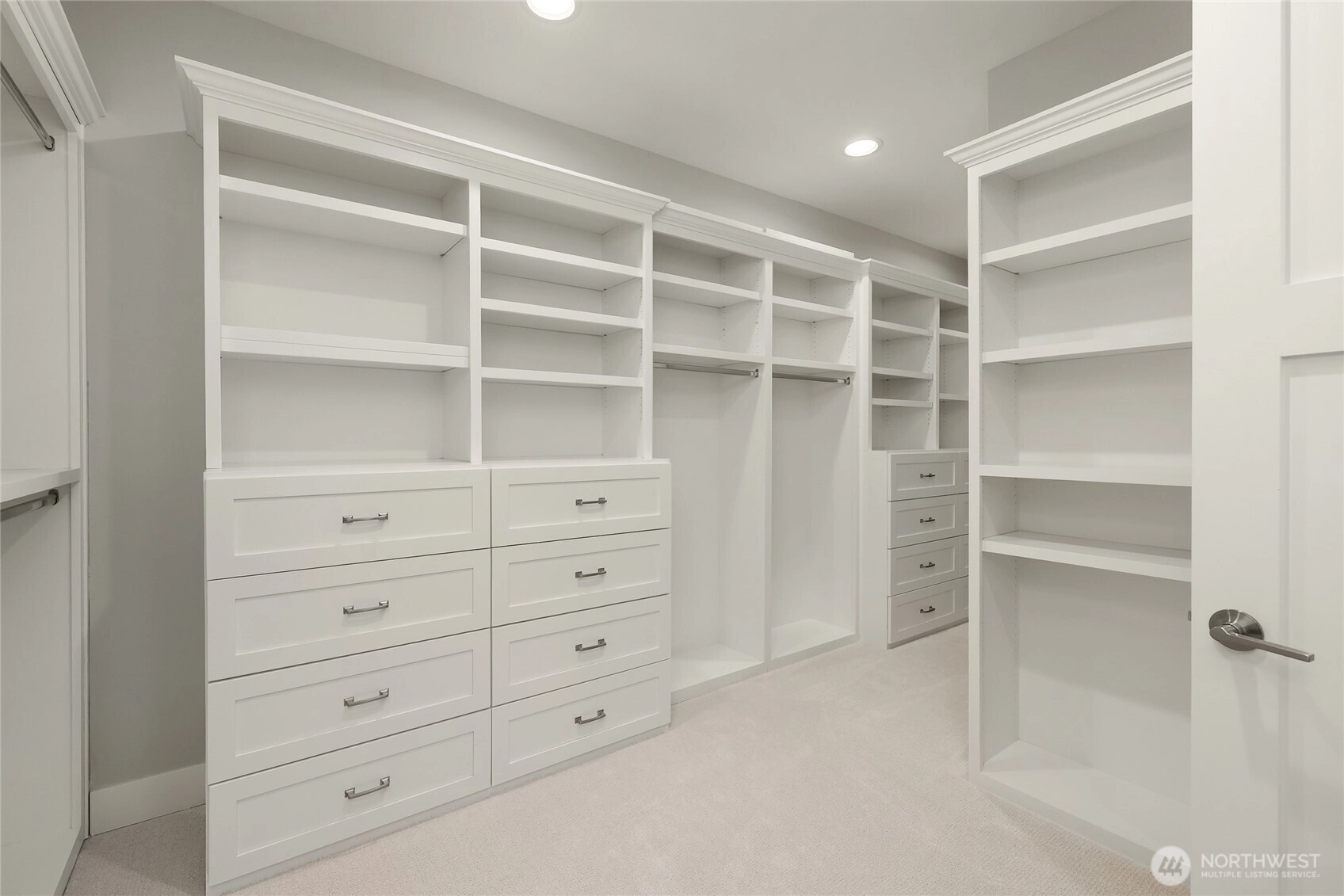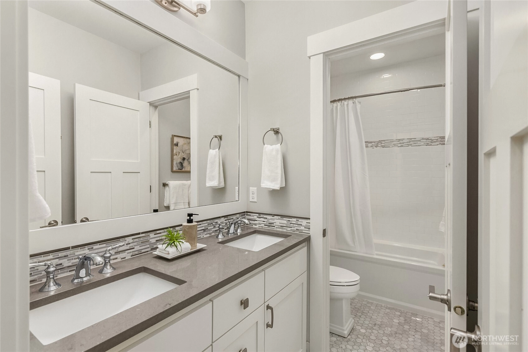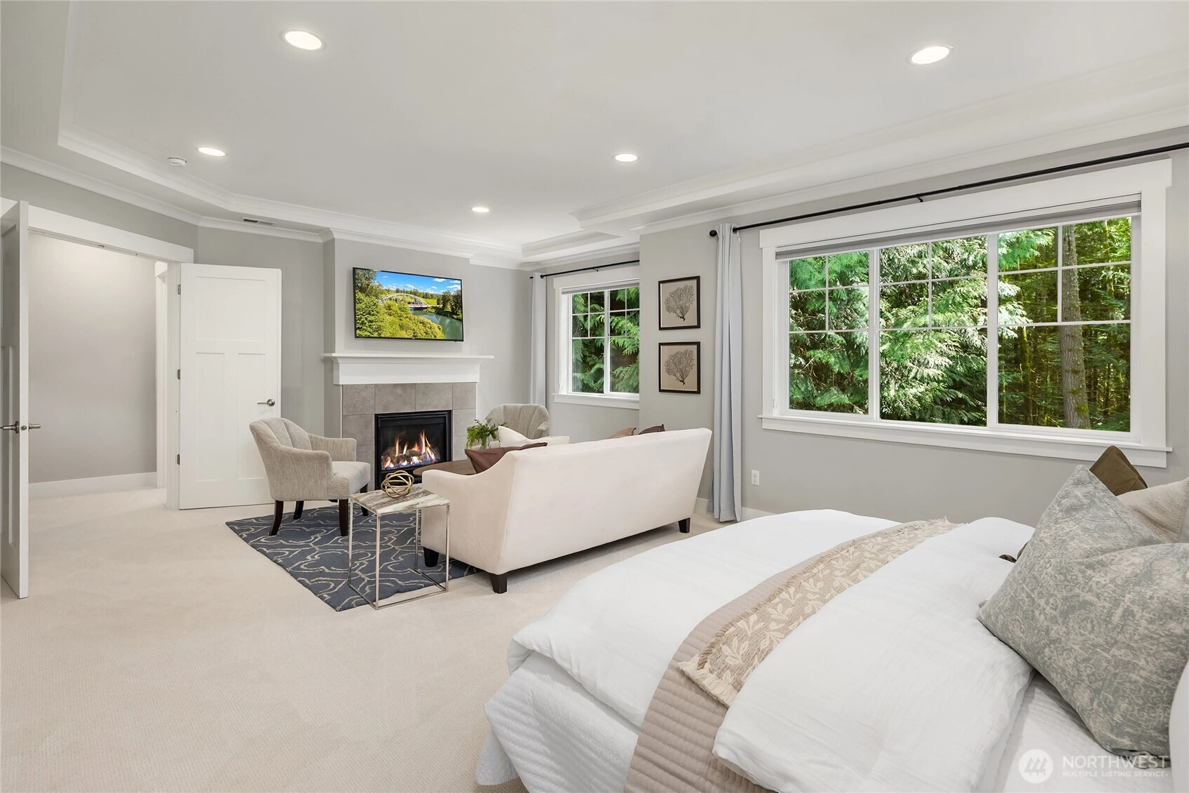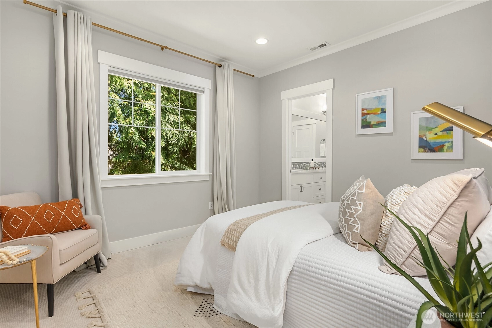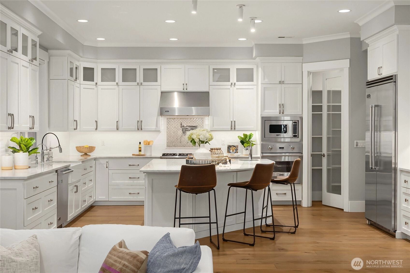 Welcome home to luxury living in the desirable Stetson Ridge Neighborhood. This stunning NW Contemporary home is one of the most popular floor plans in the neighborhood with a refined blend of elegance and functionality. Private .62 acre lot. Wide-planked hardwood flooring is throughout the entire main level that boasts a formal living room, dining room and a main floor bedroom with a 3/4 bath that makes a terrific guest suite, private office or second primary bedroom. Brand new, never-lived-in carpeting is upstairs where the spacious primary suite, three additional bedrooms plus a large bonus room can be found. The upstairs primary suite is oversized with a gas fireplace, soaking tub, large walk-in shower and enormous walk-in closet with built-ins. Popular Jack and Jill Bathroom between two of the bedrooms. Exquisite details throughout such as 10-foot box-beam ceilings, crown molding, wainscoting and built-ins. Chef's kitchen boasts marble countertops, top-of-the-line Viking appliances, wet bar with wine fridge and a spacious walk-in pantry. Covered patio off of the kitchen offers seamless indoor/outdoor living that is ideal for year-round entertaining and relaxation. Three-car garage, a handy mudroom for the PNW lifestyle, an efficient heat pump for heating and cooling, and an on-demand generator. Prime location close to downtown Winslow, the ferry and schools. A terrific island package.