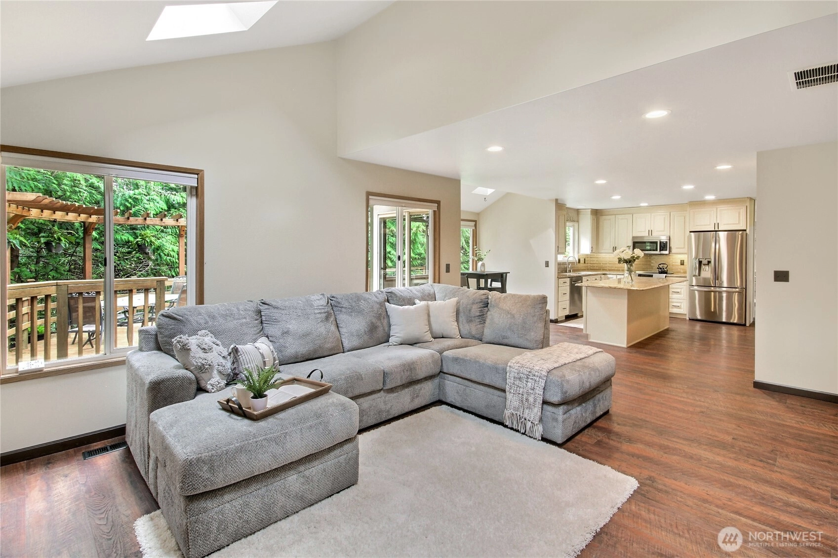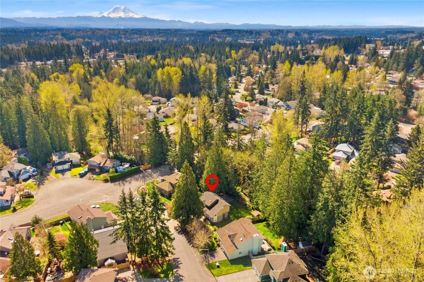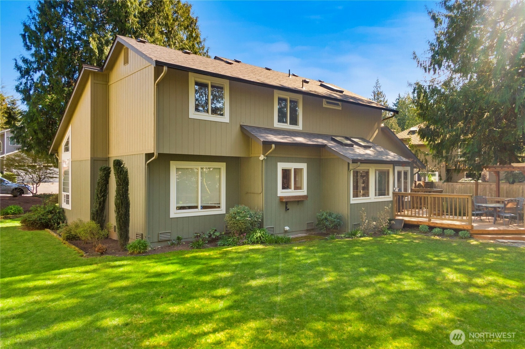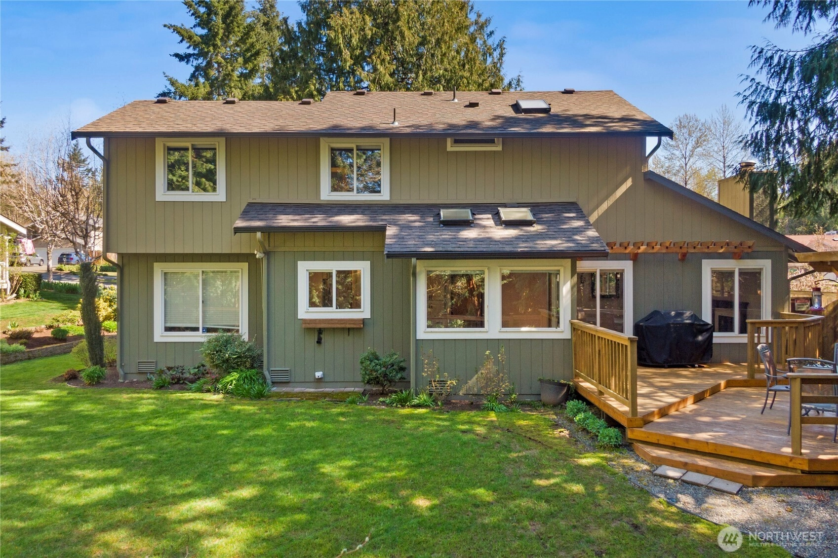 The pictures say it all! Set on a quiet cul de sac, this home has unsurpassed street appeal! Meticulously maintained and improved by the original owners, it will make a lasting impression from your first steps through the door. Vaulted ceilings over the living room & LVP flooring throughout the main floor. Follow the entry into a gorgeously updated, island kitchen with state of the art appliances, energy efficient induction range & custom cabinetry including a built buffet in the formal dining room. The island kitchen opens to a huge family room with an abundance of windows, gas log fireplace, skylights and a cozy eating nook and slider leading to the expansive deck. The pristinely private & fenced backyard includes a garden shed and a winter creek gurgles along the adjoining greenbelt beyond. Upstairs you'll find brand new carpeting & 3 bedrooms including a spacious primary suite with 2 sink vanity, shower & walk-in closet. Beautiful, mature landscaping front & back. Utility room with sink & storage cabinetry. New roof, gutter skylights and interior paint. The excellent commute locale puts you North and West of Covington traffic, yet walking distance to schools and minutes from Costco. Truly one not to be missed!