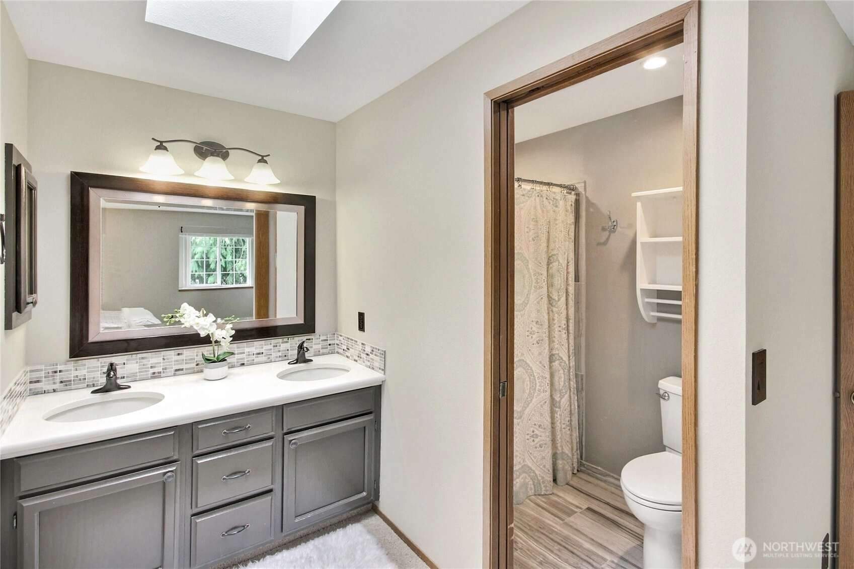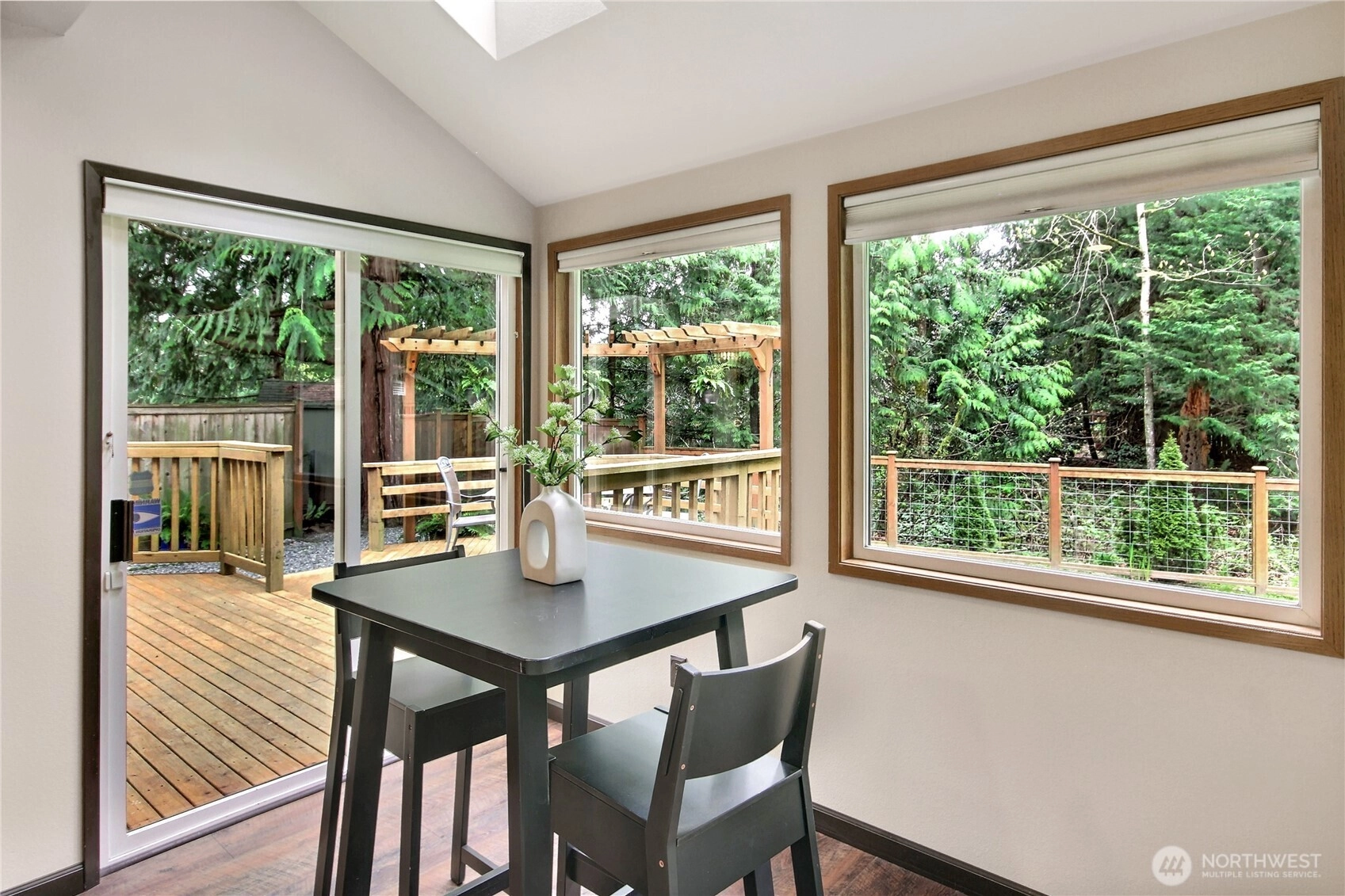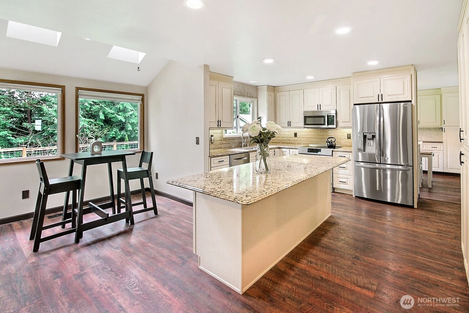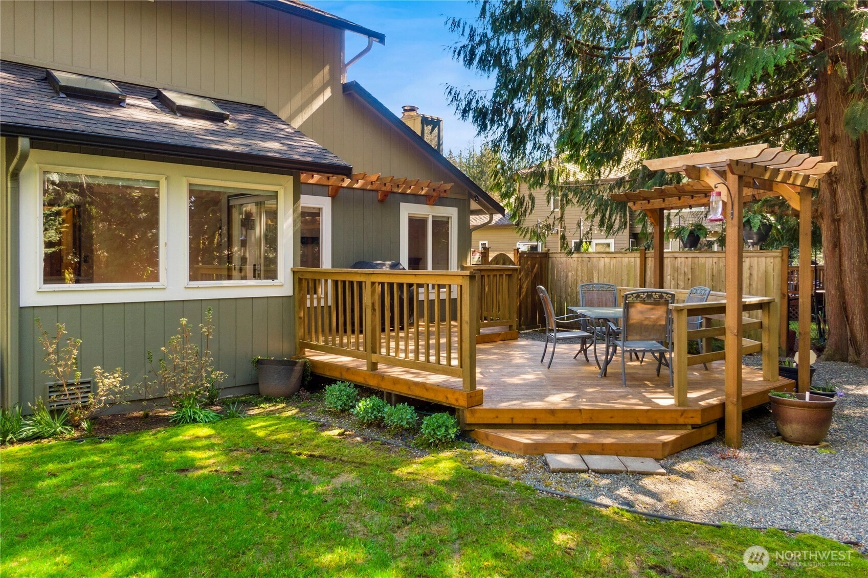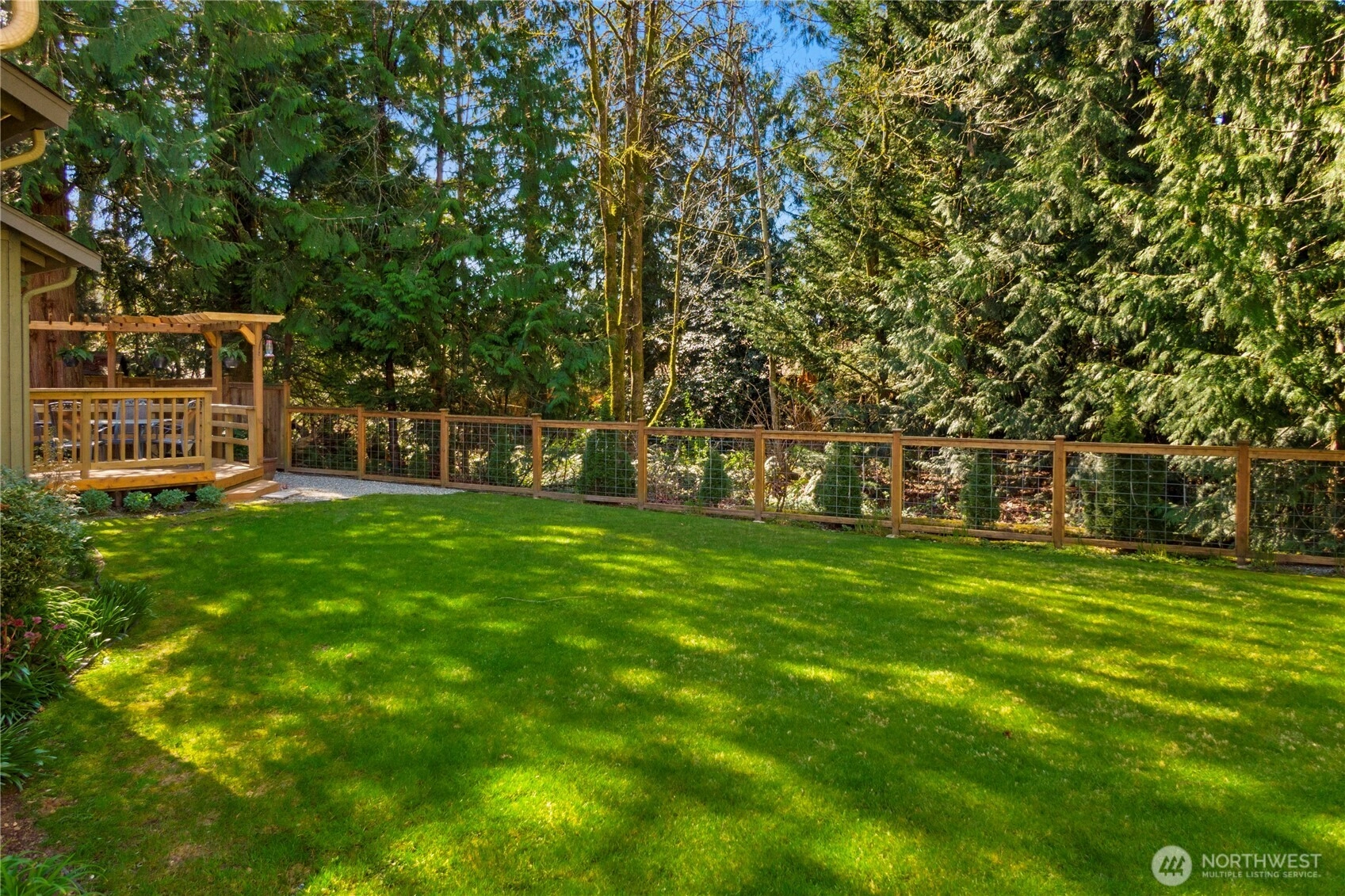 The pictures say it all! Set on a quiet cul de sac, this home has unsurpassed street appeal! Meticulously maintained and improved by the original owners, it will make a lasting impression from your first steps through the door. Vaulted ceilings over the living room & LVP flooring throughout the main floor. Follow the entry into a gorgeously updated, island kitchen with state of the art appliances, energy efficient induction range & custom cabinetry including a built buffet in the formal dining room. The island kitchen opens to a huge family room with an abundance of windows, gas log fireplace, skylights and a cozy eating nook and slider leading to the expansive deck. The pristinely private & fenced backyard includes a garden shed and a winter creek gurgles along the adjoining greenbelt beyond. Upstairs you'll find brand new carpeting & 3 bedrooms including a spacious primary suite with 2 sink vanity, shower & walk-in closet. Beautiful, mature landscaping front & back. Utility room with sink & storage cabinetry. New roof, gutter skylights and interior paint. The excellent commute locale puts you North and West of Covington traffic, yet walking distance to schools and minutes from Costco. Truly one not to be missed!