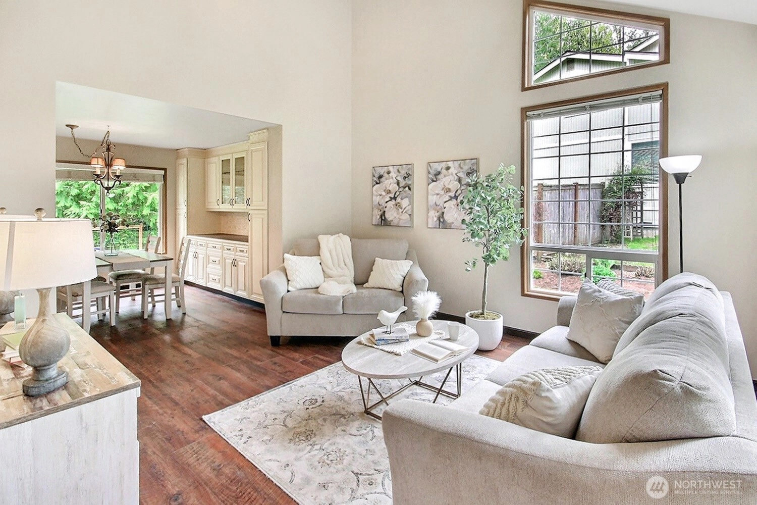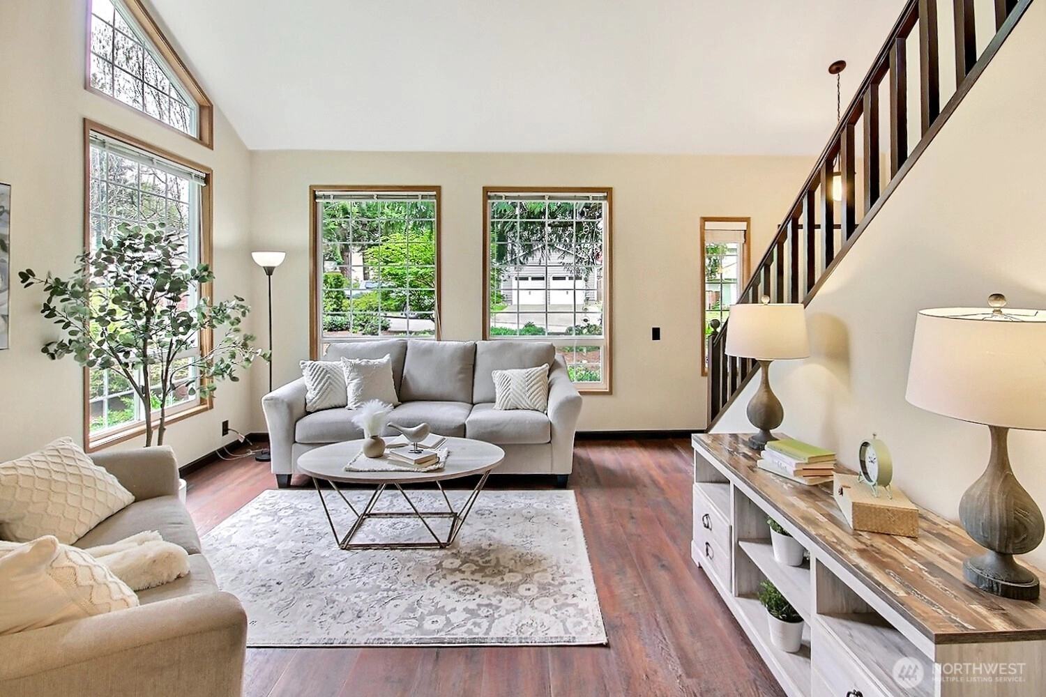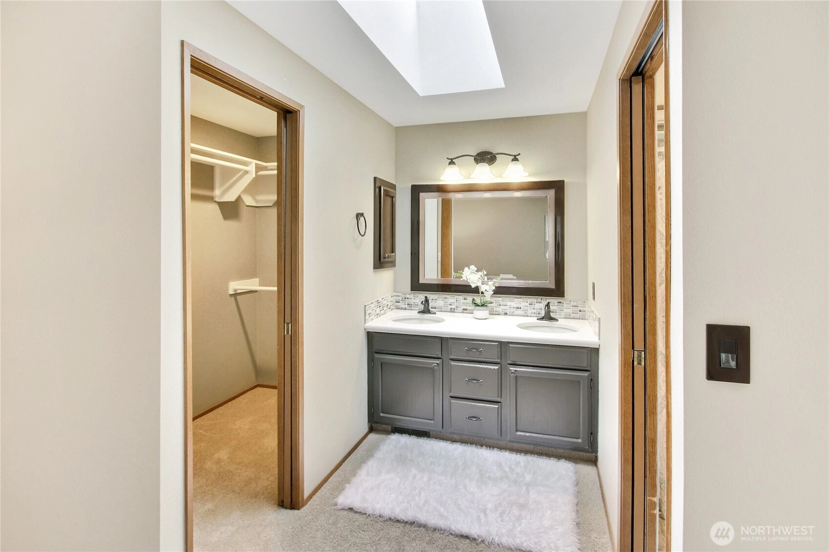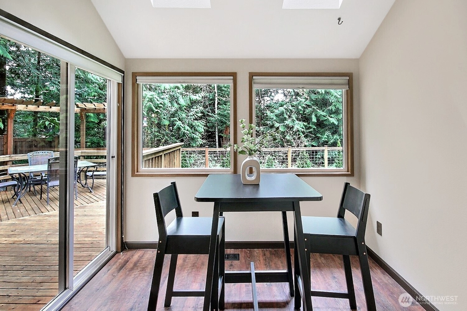 The pictures say it all! Set on a quiet cul de sac, this home has unsurpassed street appeal! Meticulously maintained and improved by the original owners, it will make a lasting impression from your first steps through the door. Vaulted ceilings over the living room & LVP flooring throughout the main floor. Follow the entry into a gorgeously updated, island kitchen with state of the art appliances, energy efficient induction range & custom cabinetry including a built buffet in the formal dining room. The island kitchen opens to a huge family room with an abundance of windows, gas log fireplace, skylights and a cozy eating nook and slider leading to the expansive deck. The pristinely private & fenced backyard includes a garden shed and a winter creek gurgles along the adjoining greenbelt beyond. Upstairs you'll find brand new carpeting & 3 bedrooms including a spacious primary suite with 2 sink vanity, shower & walk-in closet. Beautiful, mature landscaping front & back. Utility room with sink & storage cabinetry. New roof, gutter skylights and interior paint. The excellent commute locale puts you North and West of Covington traffic, yet walking distance to schools and minutes from Costco. Truly one not to be missed!