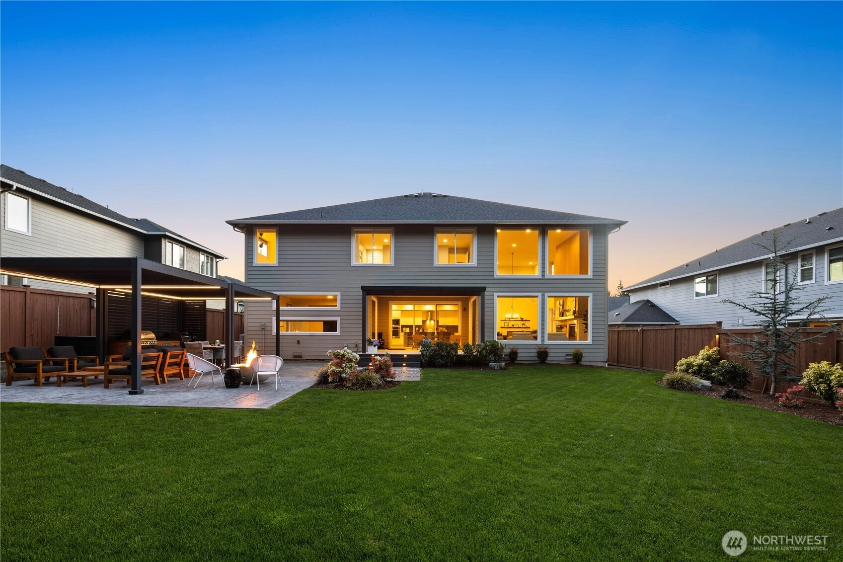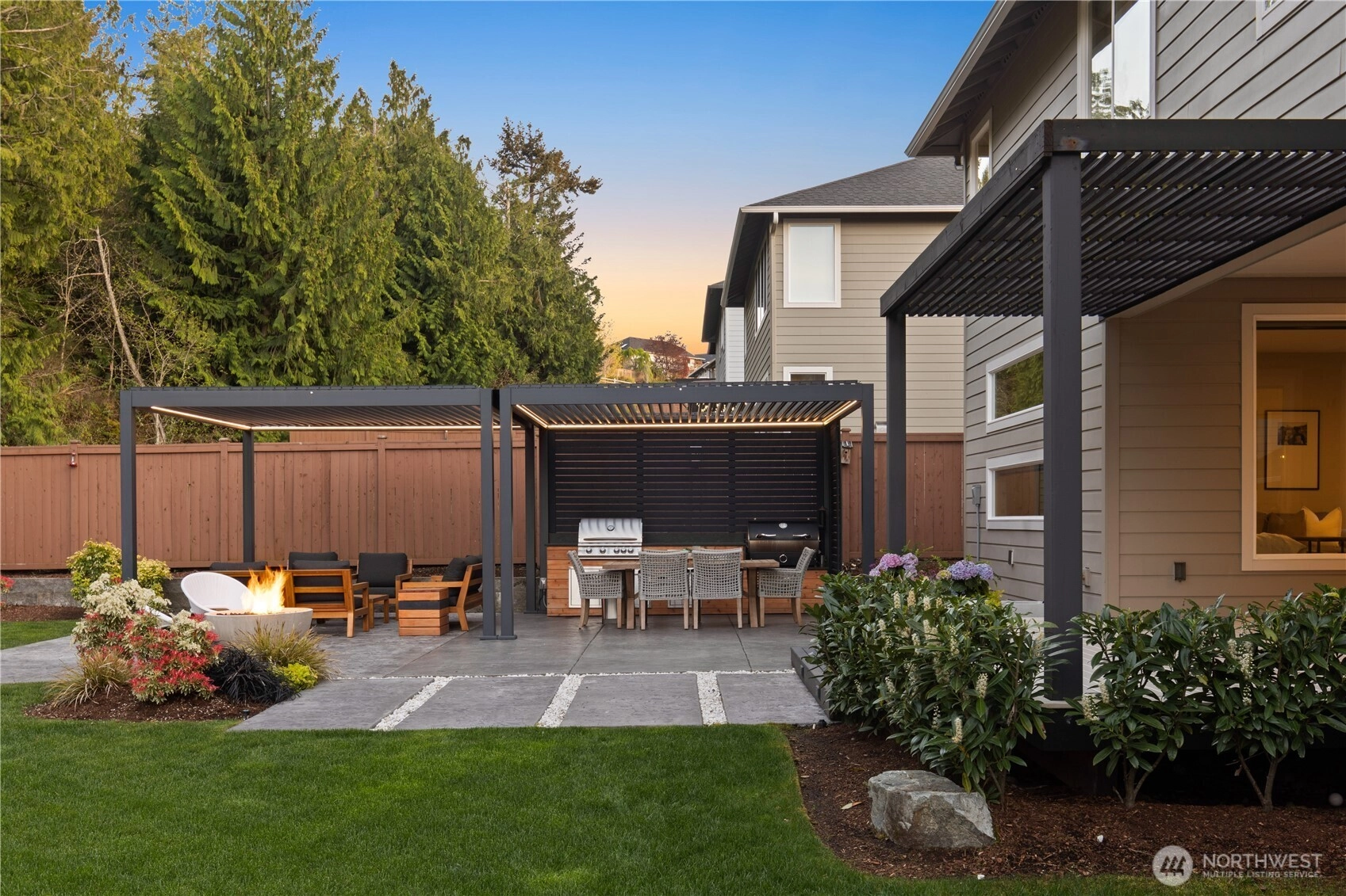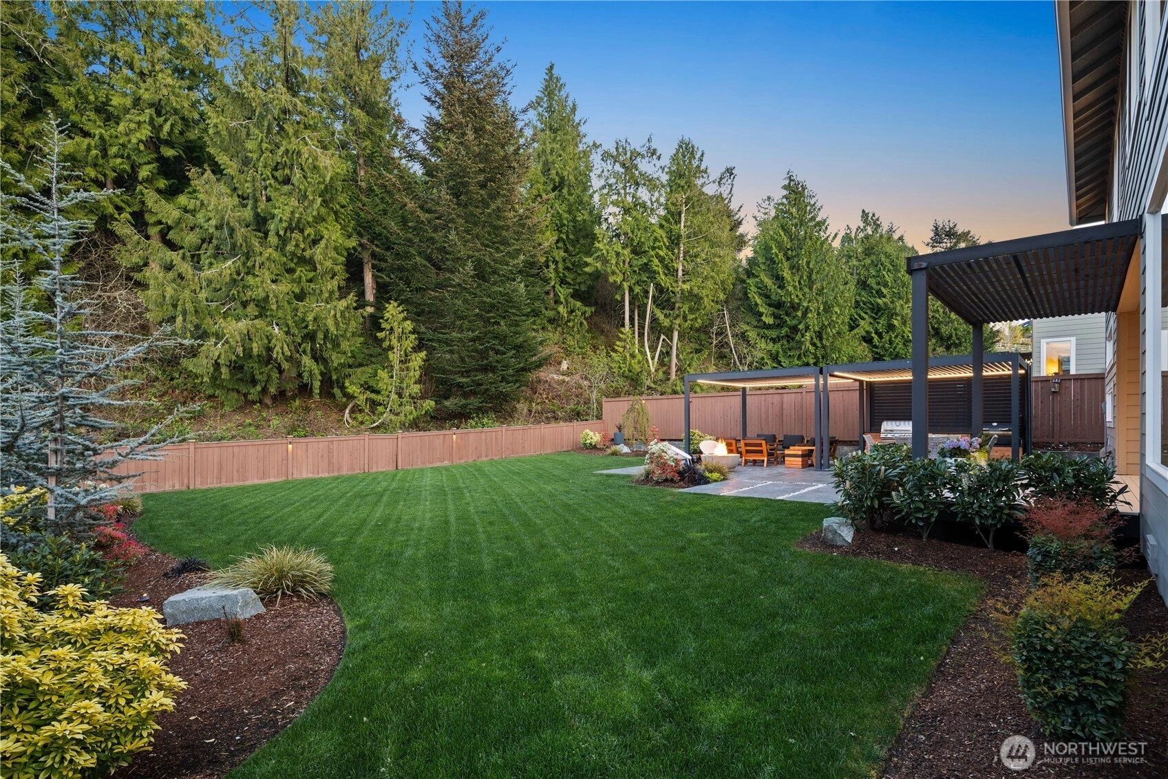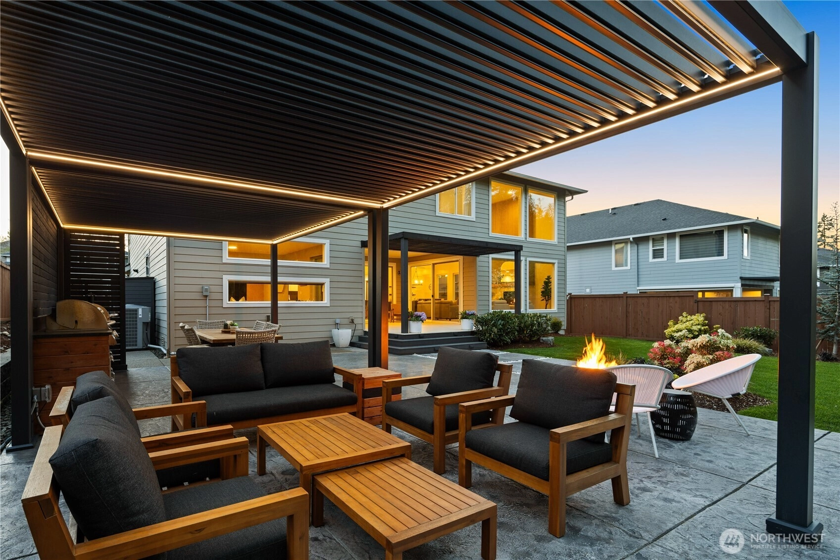 Located in the coveted Sky Island neighborhood, this MainVue Avoca offers a refined, retreat-like living experience with thoughtful design and elevated comfort. A grand two-story foyer opens to light-filled interiors, including a dramatic double-height Great Room with gas fireplace and expansive windows framing serene views of the private backyard and protected greenbelt. The chef-inspired kitchen with oversized island and walk-in pantry flows seamlessly into the dining area, ideal for everyday living and entertaining. The main level also features a versatile office or guest space with adjacent 3/4 bath. Upstairs, the primary suite is a true sanctuary with custom closet upgrades and a spa-inspired bath. Additional bedrooms each feature walk-in closets, while a spacious leisure room offers flexibility as a workout space, media room, or play area. Step outside to a customized backyard designed as a private escape. Entertain under the covered pergola with built-in outdoor kitchen, gather around the fire bowl, and enjoy curated landscaping with ambient uplighting. Backing to a lush greenbelt, this setting captures the beauty of the Pacific Northwest with a rare sense of tranquility. Additional enhancements include A/C, smart blinds, water softener, custom mudroom, underground sprinklers, smart quiet garage door openers, and wiring for a portable generator. A peaceful setting that feels worlds away, yet minutes to shopping, dining, and access to 410 for an easy commute.
