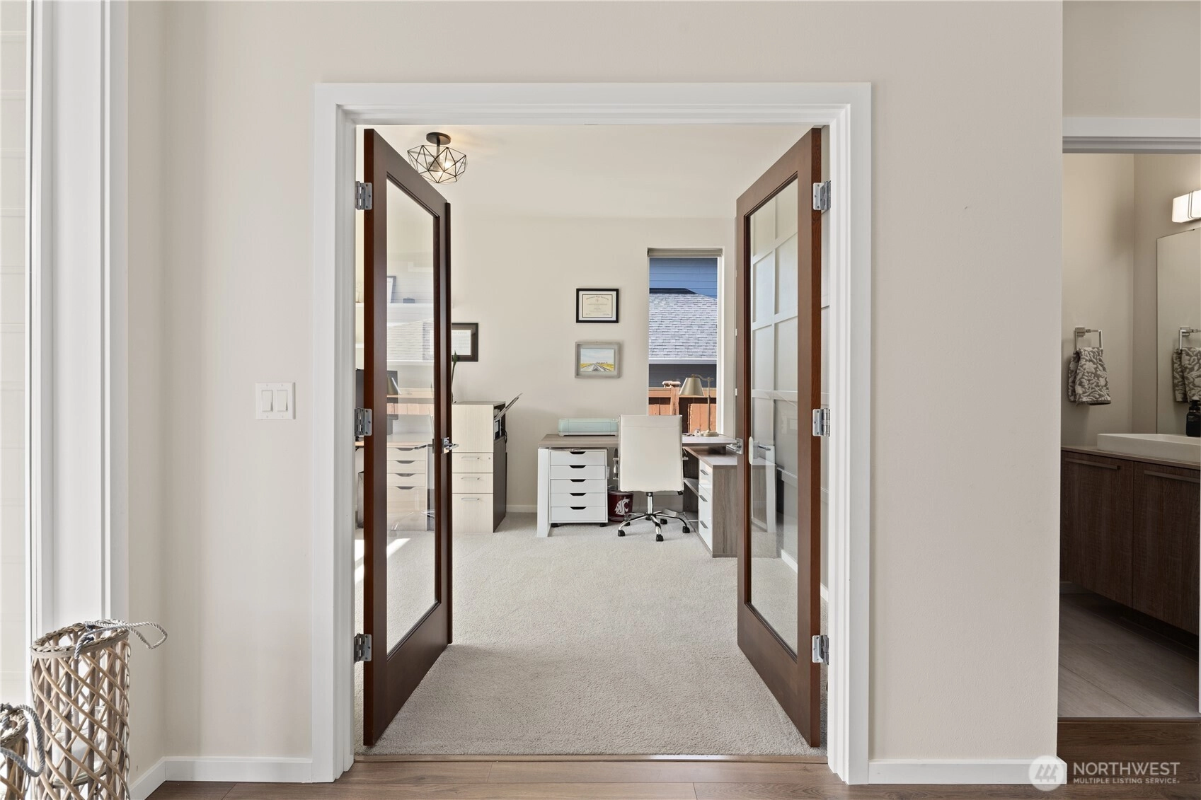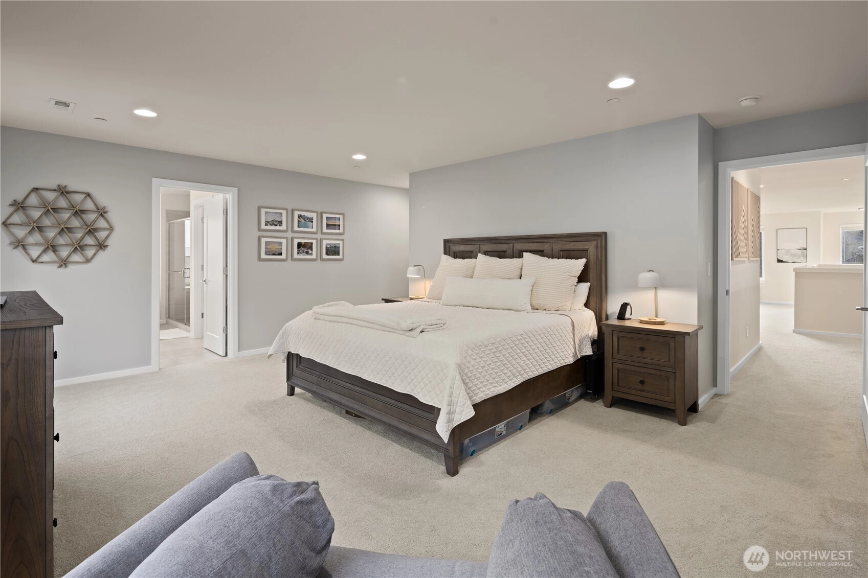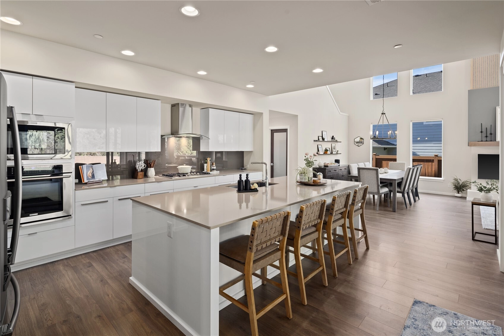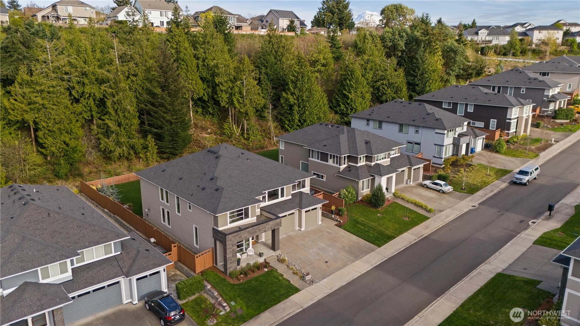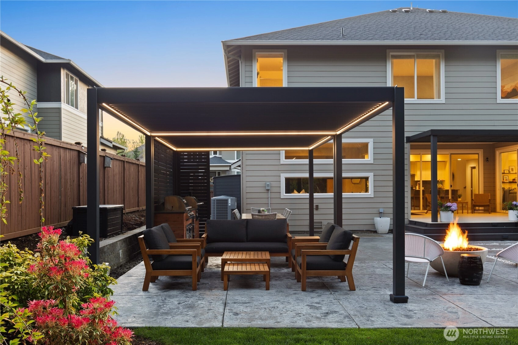 Located in the coveted Sky Island neighborhood, this MainVue Avoca offers a refined, retreat-like living experience with thoughtful design and elevated comfort. A grand two-story foyer opens to light-filled interiors, including a dramatic double-height Great Room with gas fireplace and expansive windows framing serene views of the private backyard and protected greenbelt. The chef-inspired kitchen with oversized island and walk-in pantry flows seamlessly into the dining area, ideal for everyday living and entertaining. The main level also features a versatile office or guest space with adjacent 3/4 bath. Upstairs, the primary suite is a true sanctuary with custom closet upgrades and a spa-inspired bath. Additional bedrooms each feature walk-in closets, while a spacious leisure room offers flexibility as a workout space, media room, or play area. Step outside to a customized backyard designed as a private escape. Entertain under the covered pergola with built-in outdoor kitchen, gather around the fire bowl, and enjoy curated landscaping with ambient uplighting. Backing to a lush greenbelt, this setting captures the beauty of the Pacific Northwest with a rare sense of tranquility. Additional enhancements include A/C, smart blinds, water softener, custom mudroom, underground sprinklers, smart quiet garage door openers, and wiring for a portable generator. A peaceful setting that feels worlds away, yet minutes to shopping, dining, and access to 410 for an easy commute.
