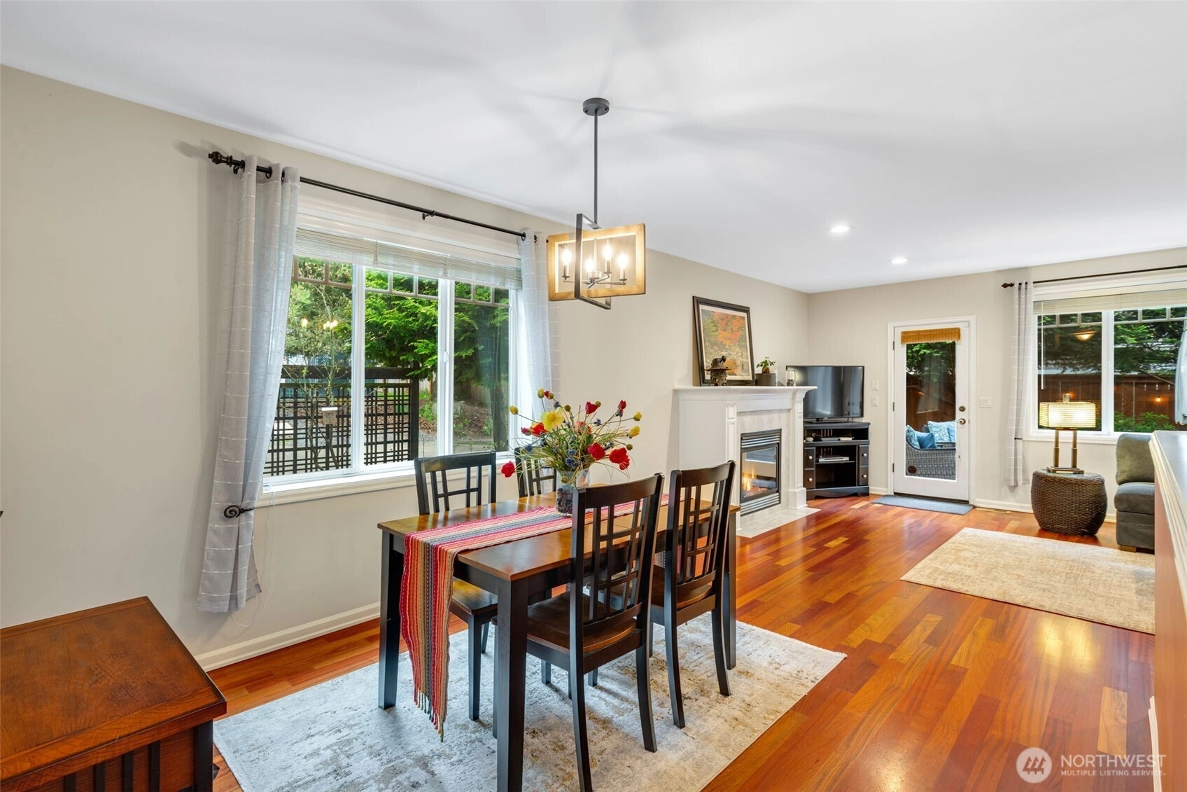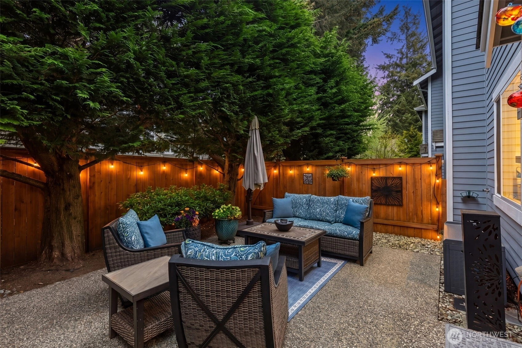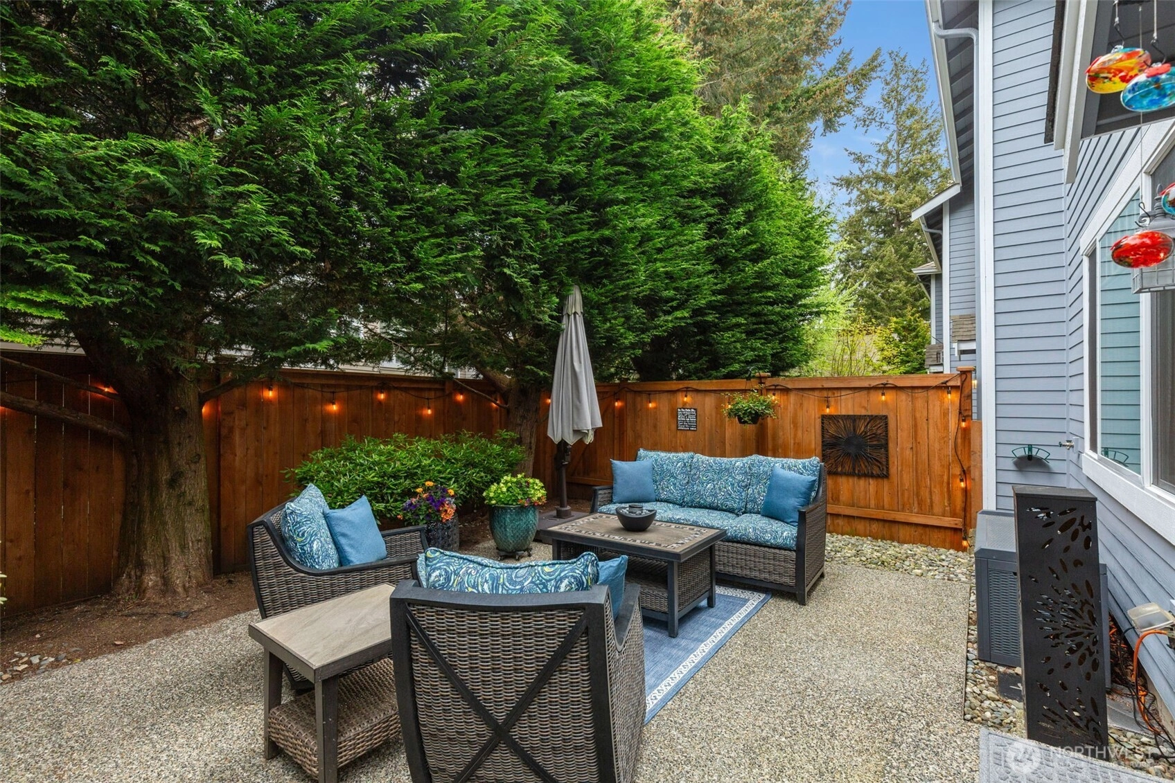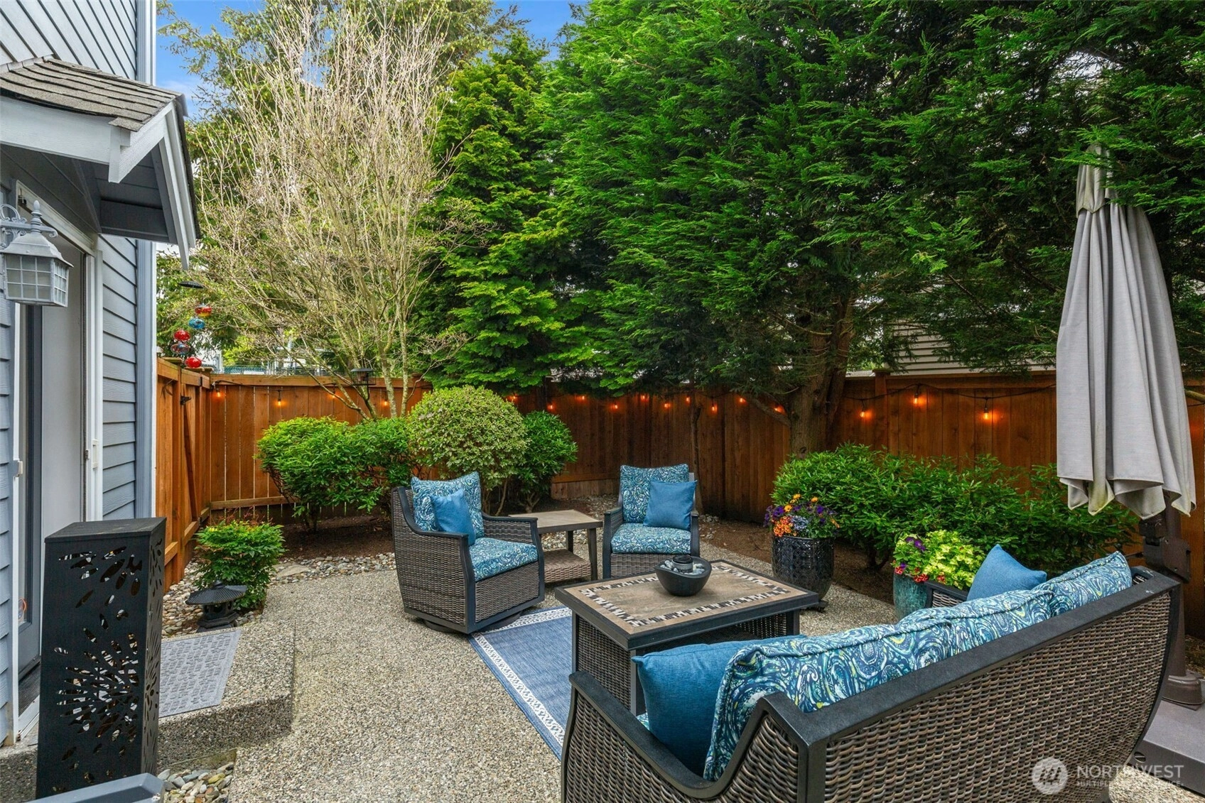 This townhouse truly lives like a gracious single-family home, with all the ease of condo living. The main level is filled with light, where high ceilings and a wall of windows create an airy, open feel. Rich Brazilian cherry floors ground the space including a dining area and an open kitchen with gas cooking and a abundant pantry storage. Switch on the gas fireplace, relax in the living room, open the door to a ground floor private back patio and garden- the kind of space that’s rare in townhouse living. Just two levels, the upstairs has all three bedrooms, and the primary looks out to a serene evergreen backdrop- with ensuite bath with double vanity + walk-in closet. Two additional bedrooms, a full guest bath, and a laundry room round out the upper floor with function and flexibility. An attached two-car garage plus storage, and a well-run, small HOA that covers water/sewer/garbage plus exterior maintenance and replacement- the exterior was freshly painted, too! An elusive combination of comfort, space, and simplicity. Tucked just above Puget Sound, the neighborhood offers that sweet Edmonds balance—quiet residential streets, quick access to daily essentials, and an easy trip down to the waterfront.