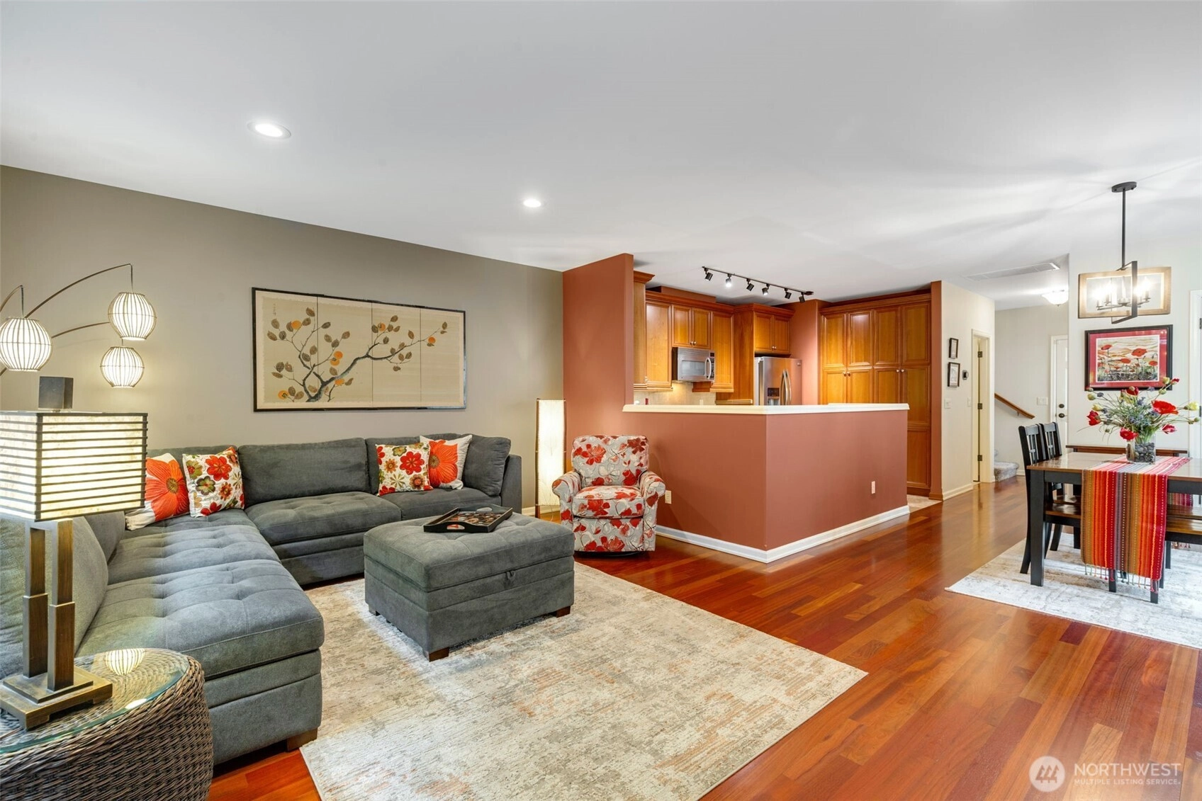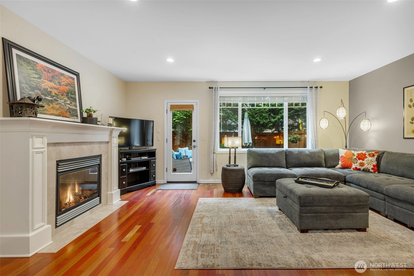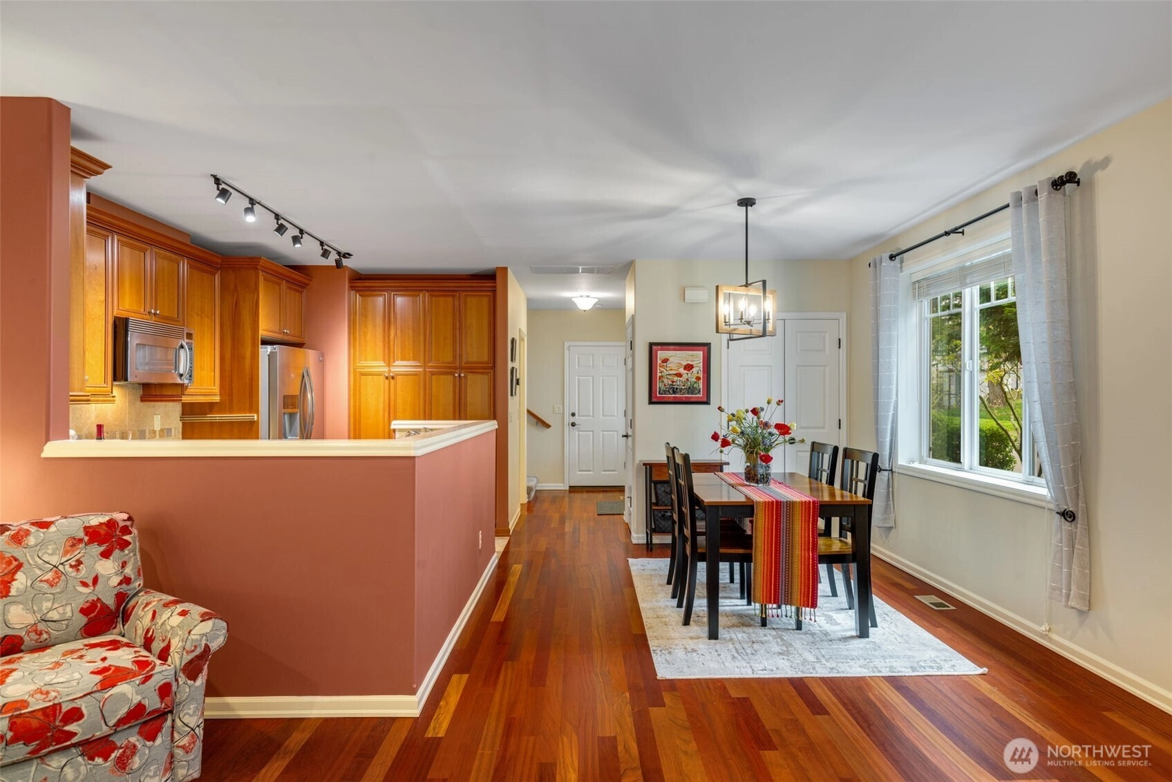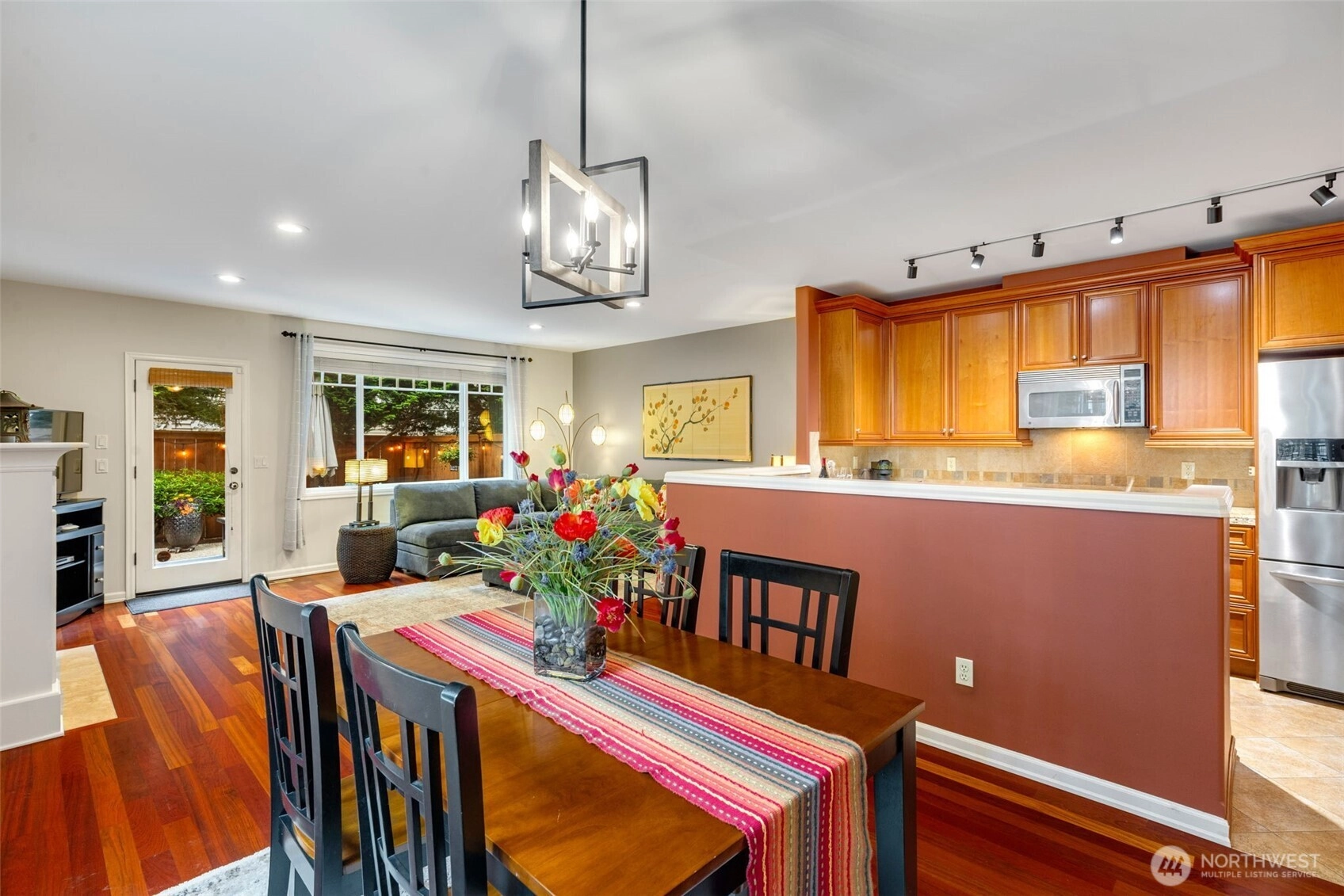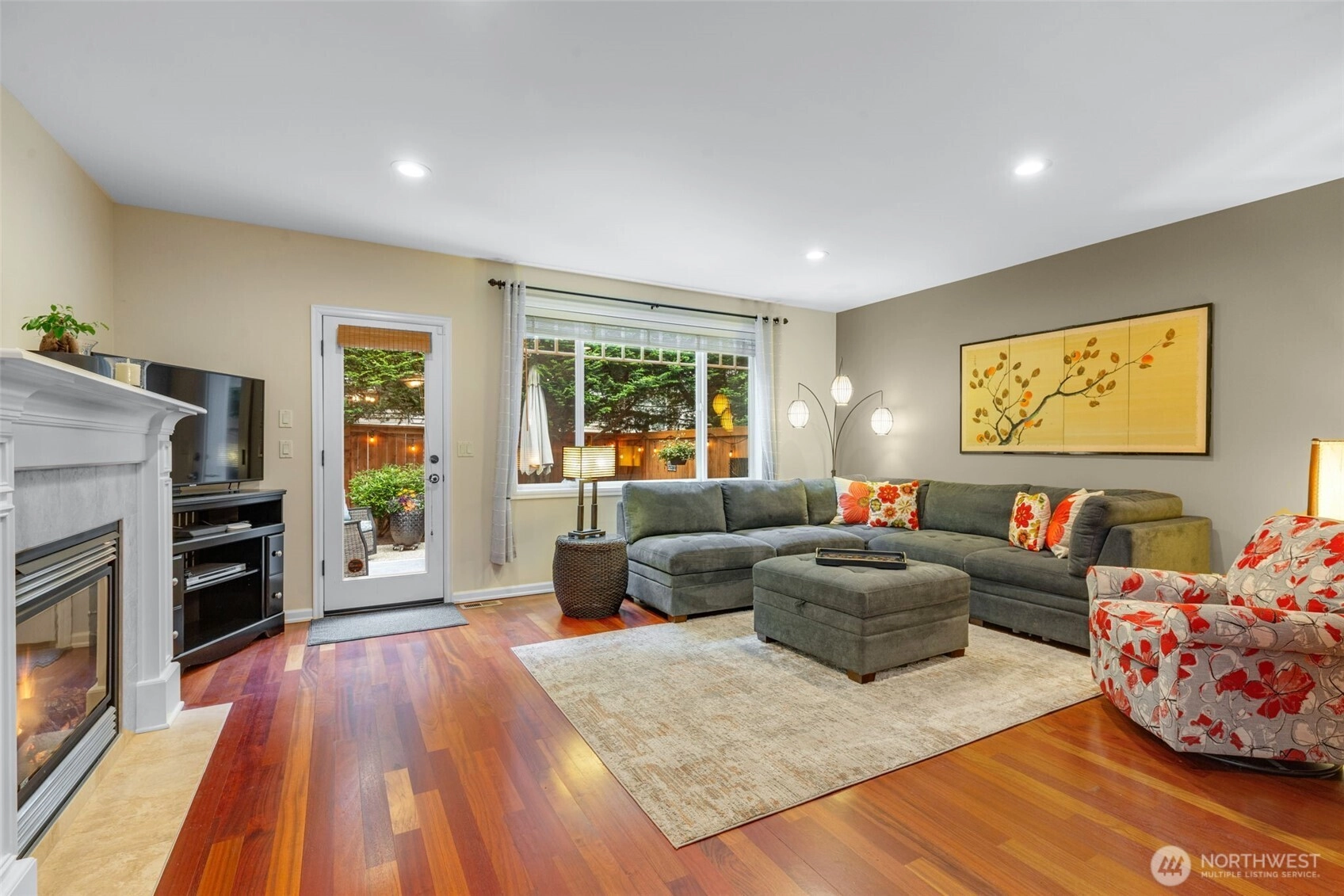 This townhouse truly lives like a gracious single-family home, with all the ease of condo living. The main level is filled with light, where high ceilings and a wall of windows create an airy, open feel. Rich Brazilian cherry floors ground the space including a dining area and an open kitchen with gas cooking and a abundant pantry storage. Switch on the gas fireplace, relax in the living room, open the door to a ground floor private back patio and garden- the kind of space that’s rare in townhouse living. Just two levels, the upstairs has all three bedrooms, and the primary looks out to a serene evergreen backdrop- with ensuite bath with double vanity + walk-in closet. Two additional bedrooms, a full guest bath, and a laundry room round out the upper floor with function and flexibility. An attached two-car garage plus storage, and a well-run, small HOA that covers water/sewer/garbage plus exterior maintenance and replacement- the exterior was freshly painted, too! An elusive combination of comfort, space, and simplicity. Tucked just above Puget Sound, the neighborhood offers that sweet Edmonds balance—quiet residential streets, quick access to daily essentials, and an easy trip down to the waterfront.