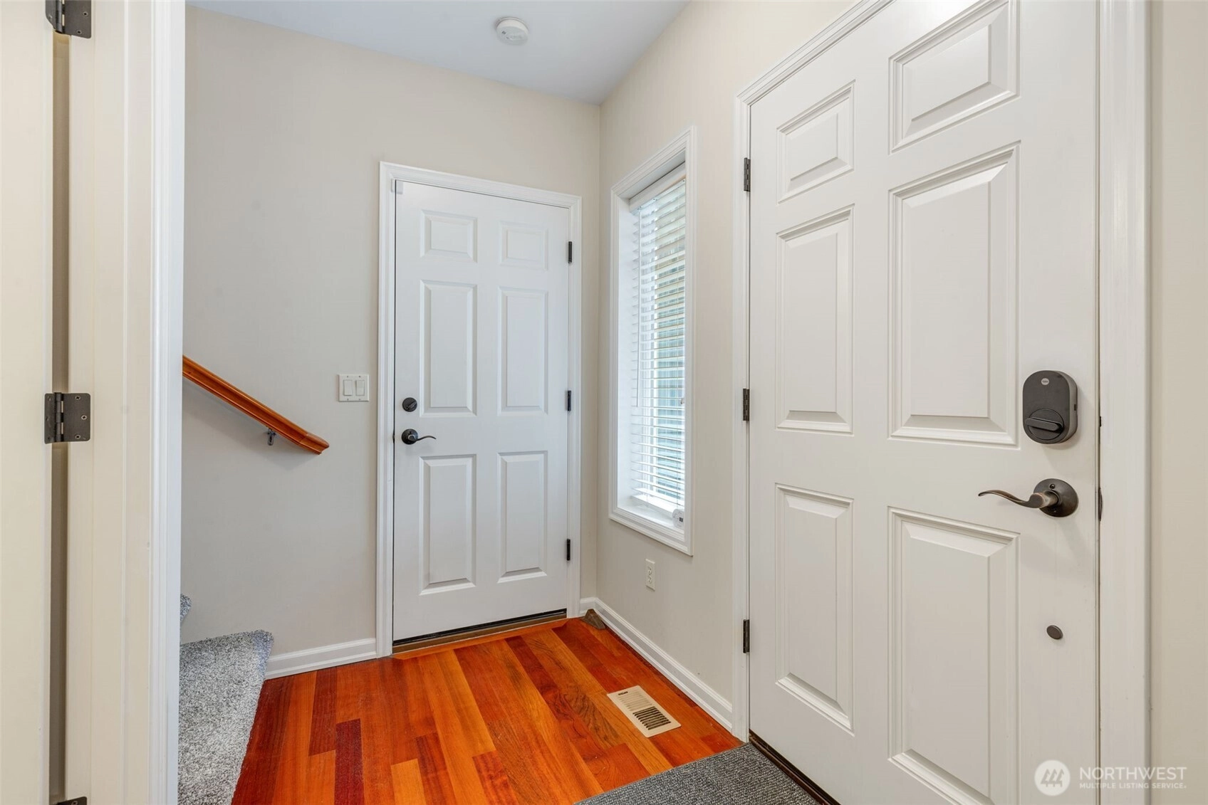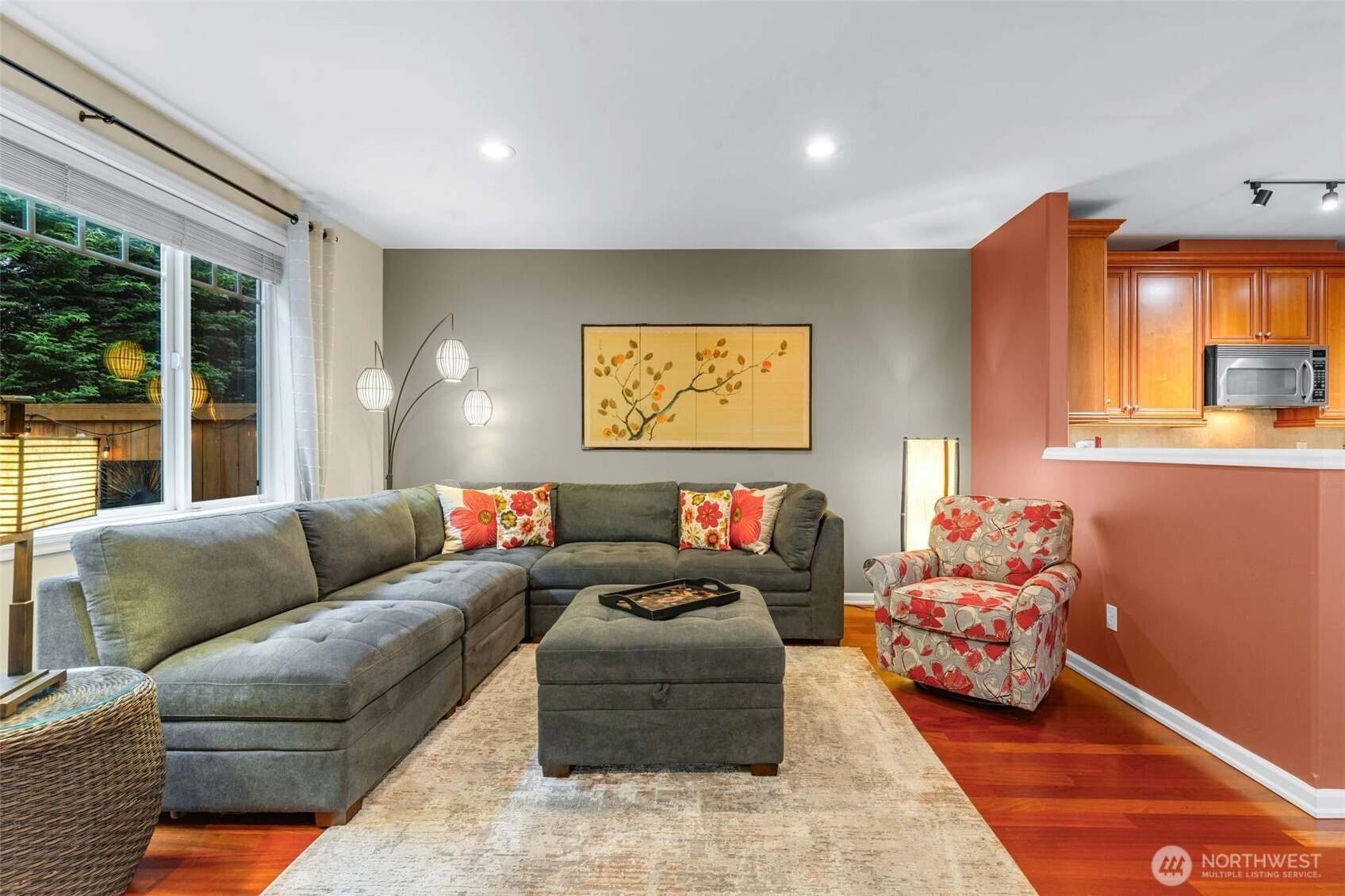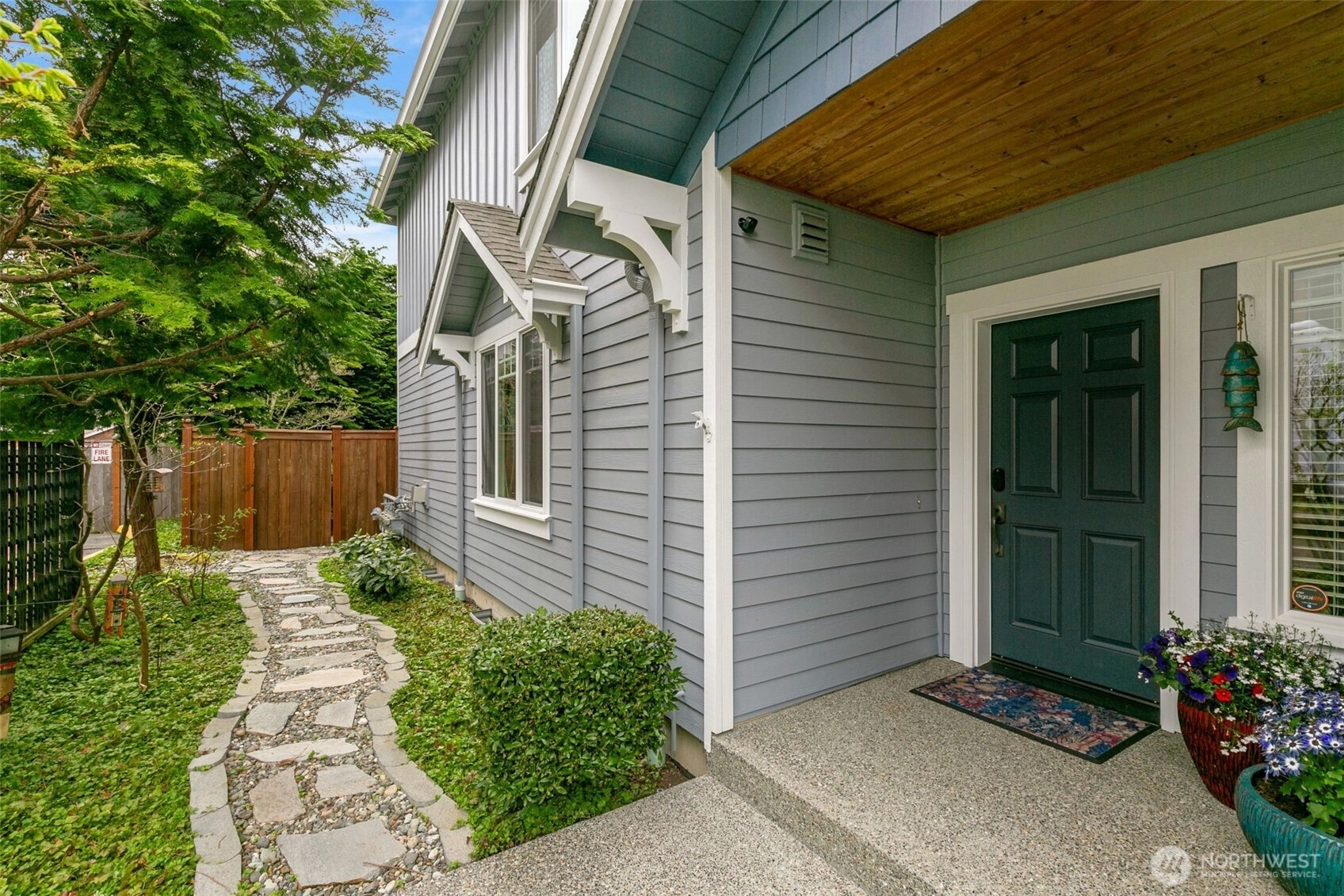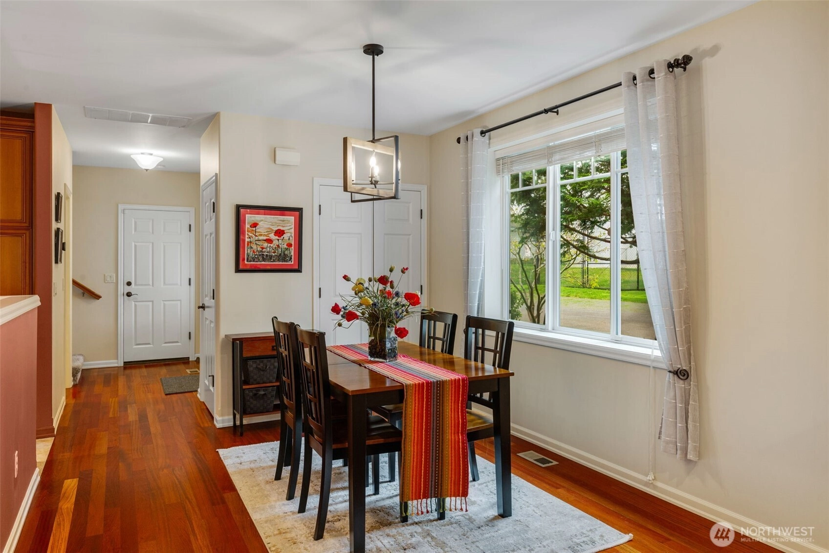This townhouse truly lives like a gracious single-family home, with all the ease of condo living. The main level is filled with light, where high ceilings and a wall of windows create an airy, open feel. Rich Brazilian cherry floors ground the space including a dining area and an open kitchen with gas cooking and a abundant pantry storage. Switch on the gas fireplace, relax in the living room, open the door to a ground floor private back patio and garden- the kind of space that’s rare in townhouse living. Just two levels, the upstairs has all three bedrooms, and the primary looks out to a serene evergreen backdrop- with ensuite bath with double vanity + walk-in closet. Two additional bedrooms, a full guest bath, and a laundry room round out the upper floor with function and flexibility. An attached two-car garage plus storage, and a well-run, small HOA that covers water/sewer/garbage plus exterior maintenance and replacement- the exterior was freshly painted, too! An elusive combination of comfort, space, and simplicity. Tucked just above Puget Sound, the neighborhood offers that sweet Edmonds balance—quiet residential streets, quick access to daily essentials, and an easy trip down to the waterfront.