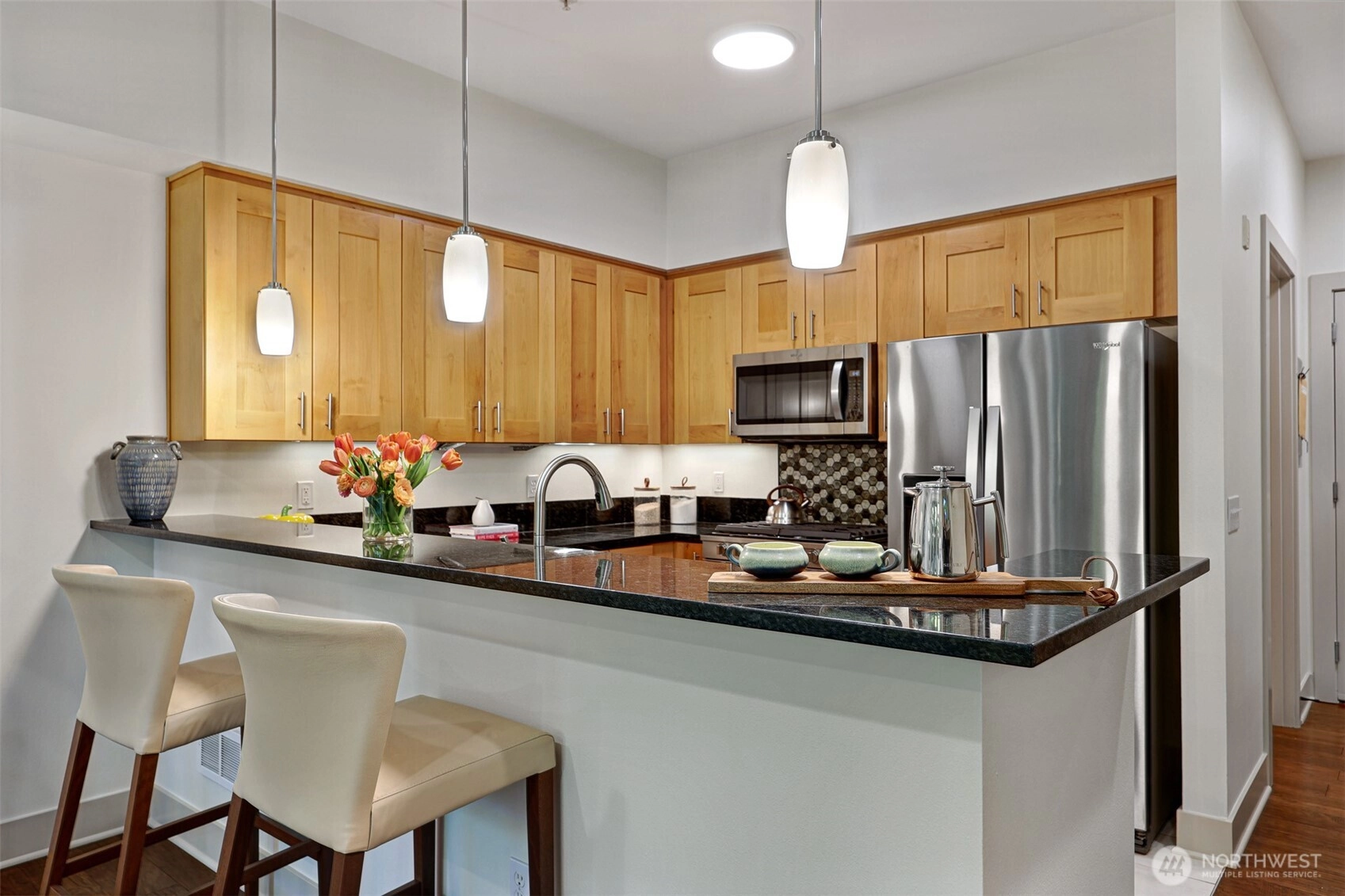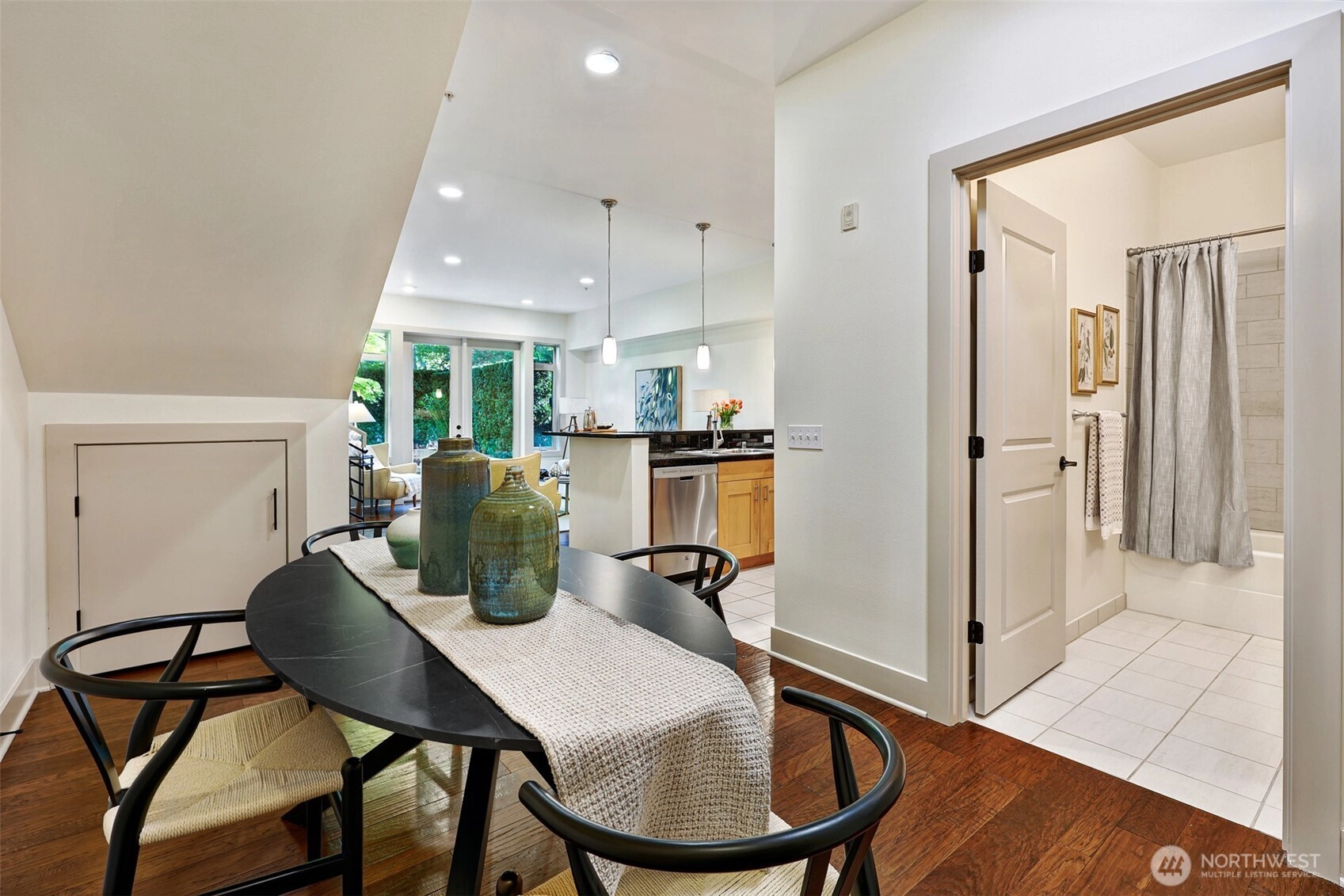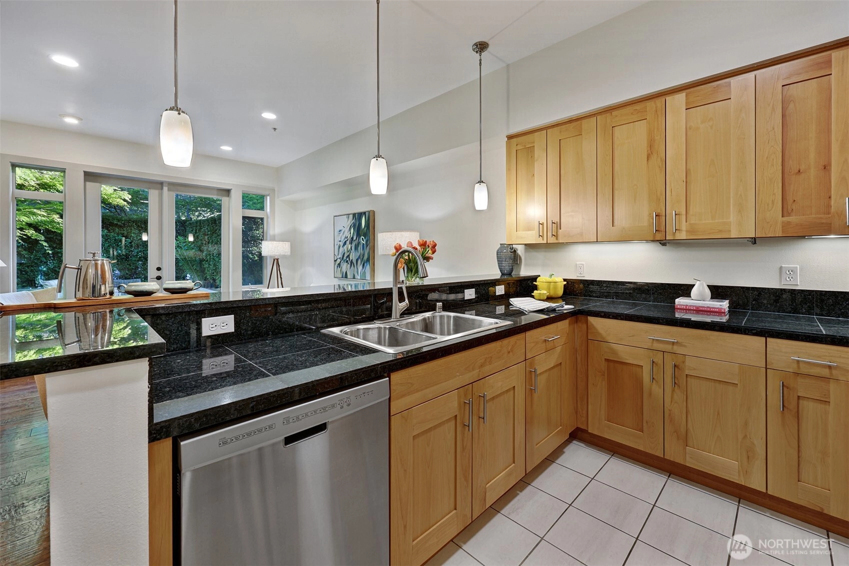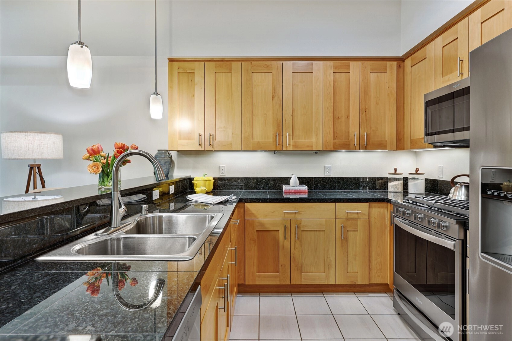 Highly treasured Point Edwards charming 1 bed, 1.75 bath condominium in Edmonds! Point Edwards community offers stunning views of Puget Sound and the Olympic Mountains. This bright, two-story residence features vaulted 12-ft ceilings on the main level, an open living and dining area warmed by a gas fireplace, and a main-floor bathroom for guests. Granite kitchen counters, brand new carpet and fresh paint throughout the unit. Step outside to a sunny, south-facing patio with street-level access—ideal for BBQs and entertaining. Upstairs the generous primary suite includes a walk-in closet, en-suite bath, and in-unit laundry. One covered, secured parking stall included. Exceptional community amenities: two clubhouses with kitchens, two outdoor pools, two fitness rooms, a 34-seat theater, and three guest suites. Easy Edmonds location — perfect blend of comfort, views, and lifestyle.