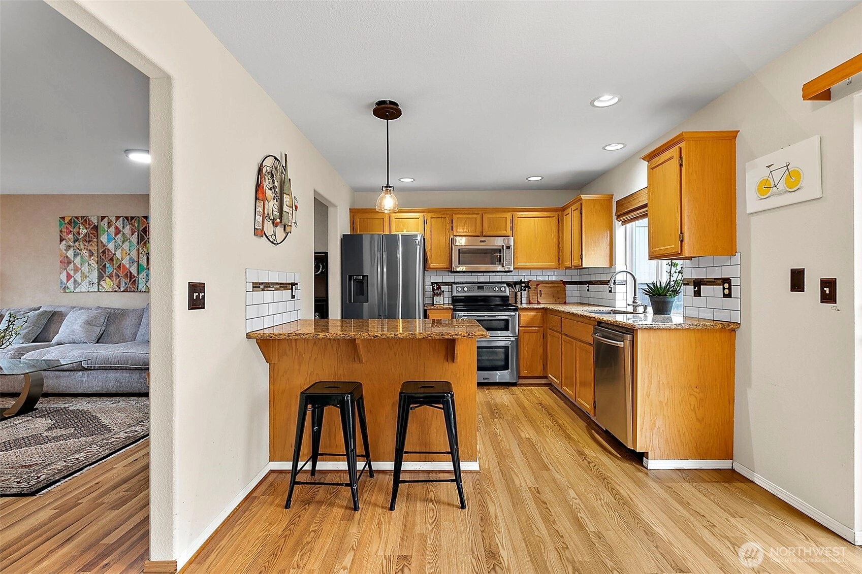 Welcome to Silver Creek’s most coveted gated community—Hillsboro! This beautifully maintained home offers a highly functional layout designed for both everyday living and effortless entertaining. Enjoy wood plank flooring, granite countertops, and updated stainless steel appliances throughout. Recent exterior paint, newer roof & update water heater provide added value and peace of mind. You'll love the sprawling primary suite w 4-piece bath and the full updated & luxurious guest bath with custom walk-in tile shower. The thoughtfully designed floor plan creates a seamless flow between living spaces, making it ideal for hosting or relaxing at home. Outside, you'll enjoy mature trees and brand new grass! Located within the vibrant Silver Creek community, residents enjoy access to a clubhouse, pickleball and tennis courts, basketball courts, scenic walking trails, and a community park—perfect for recreation and gatherings. Conveniently situated near shopping, dining, and within the coveted Puyallup School District.